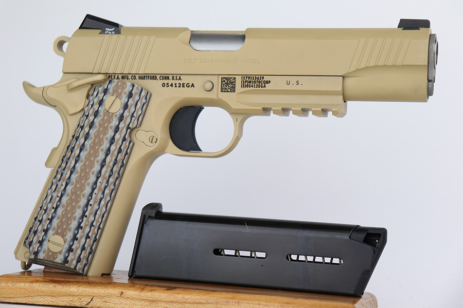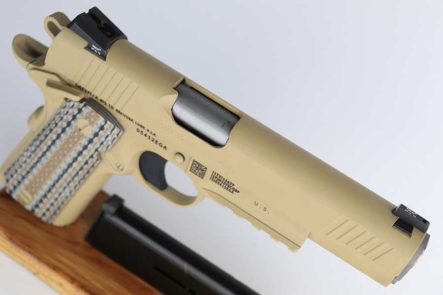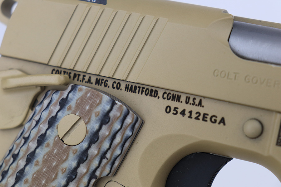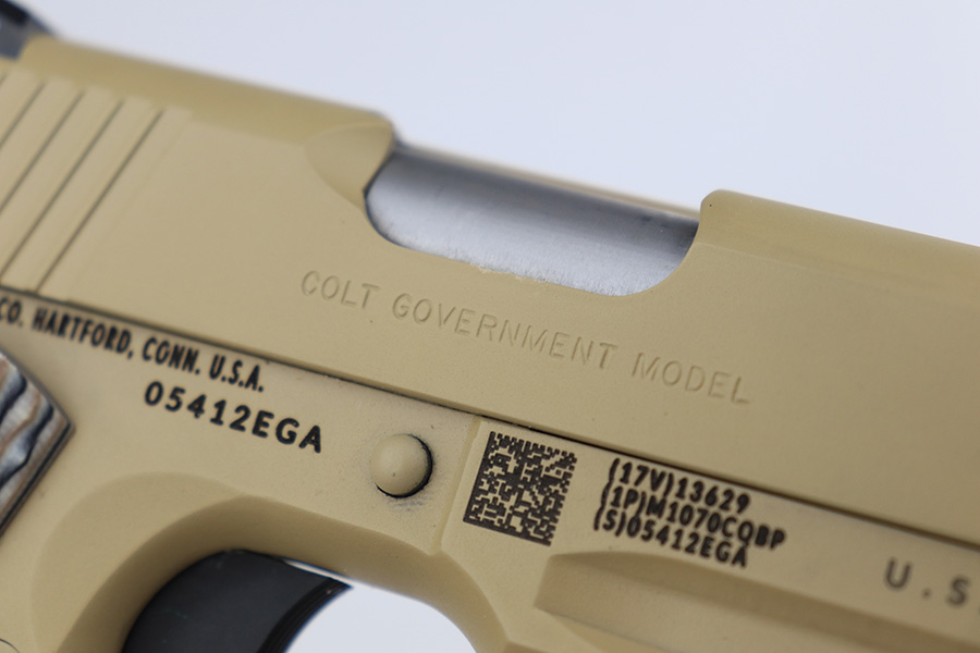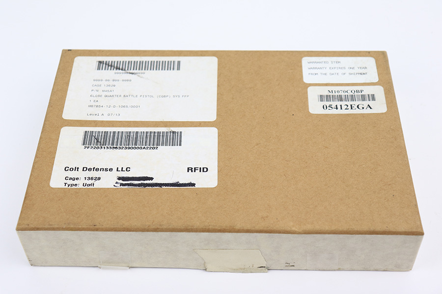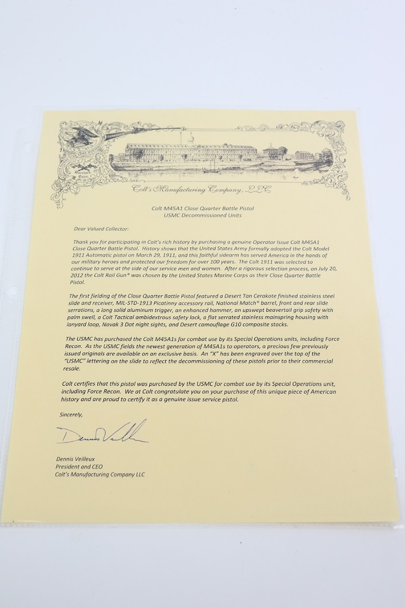11/14/23 – According to the included factory letter (do not list pistols by serial number but signed by the President and CEO of Colt Manufacturing), this pistol is one of the original run of Colt “Rail Gun” Government Model pistols produced to United States Marine Corps specifications as the M45A1 Close Quarters Battle Pistol. Intended as a replacement for the Corps’ aging stock of 1911/1911A1 pistols, the M45A1 was destined expressly for units like Force Recon, Marine Special Operations Command (home of the Marine Raiders), and Special Operations Capable Marine Expeditionary Units. 1,000 of these pistols (470 used and 530 unissued) were traded by the Marine Corps under warranty back to Colt in exchange for newer Ionbond finished replacements, Colt in turn released these original Marine Corps pistols to the public with the caveat that the “USMC” marking be struck out. The pistol has a set of 3-dot Trijicon night sights installed on the “COLT***USMC” marked slide, with “VP” and “L” on the left side of the trigger guard and the U.S. nomenclature on the right, including the military-specific “M1070CQBP” model number. 4- groove Picatinny rails are integrated into the dust cover, with a long solid trigger, skeleton hammer, beavertail safety with “speed bump”, ambidextrous thumb safety, serrated flat mainspring housing, “desert camo” G10 composite grips, Wilson Combat magazine, and Colt National Match barrel with a finely polished and beveled. This is in “unissued” condition. Comes with the Colt shipping box.