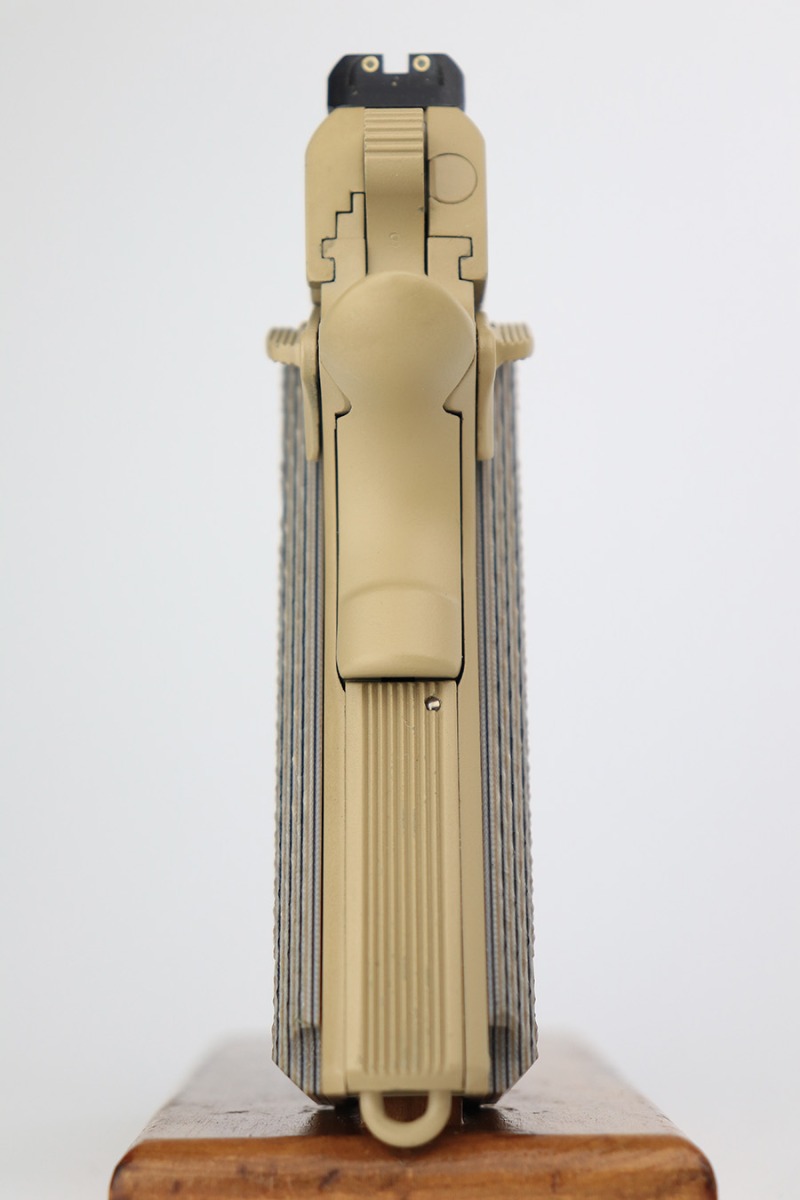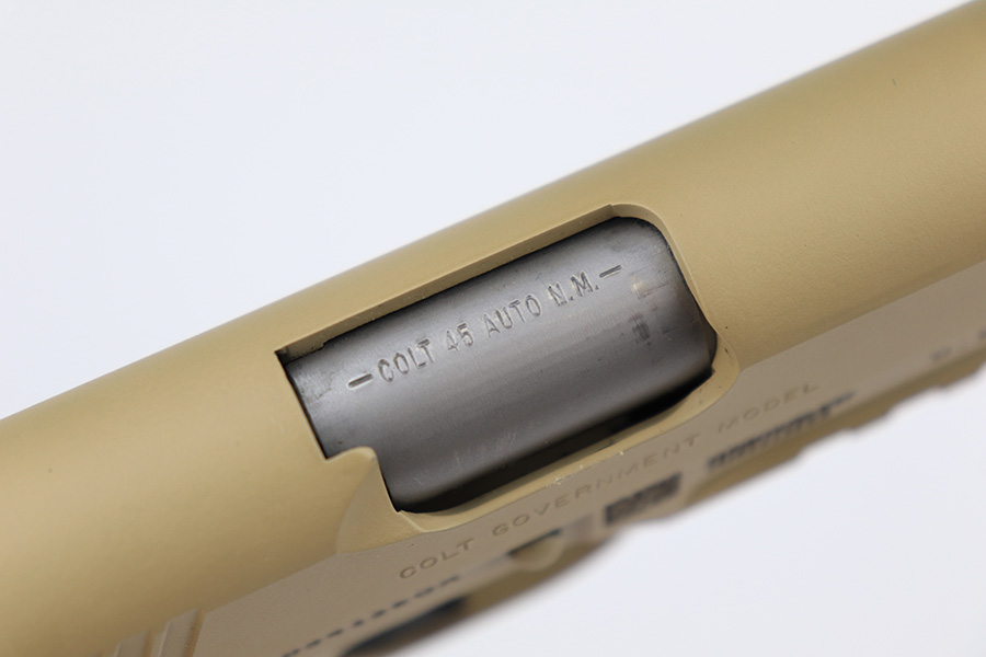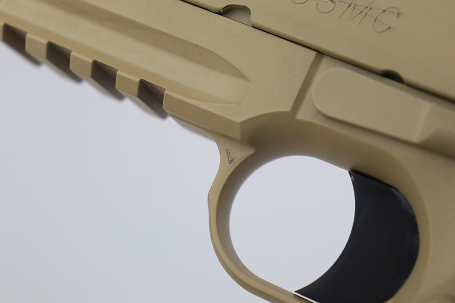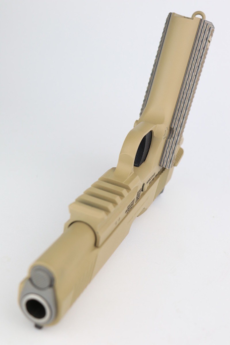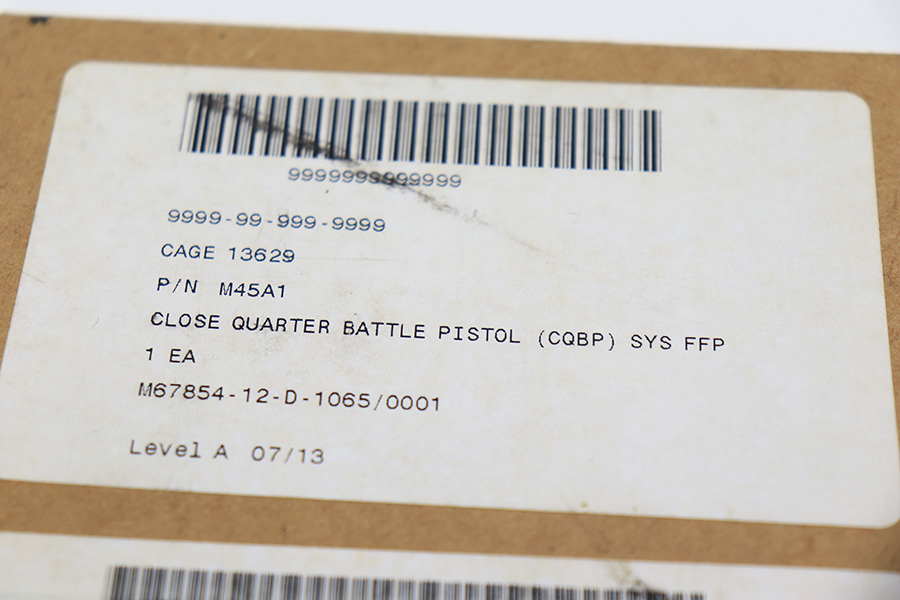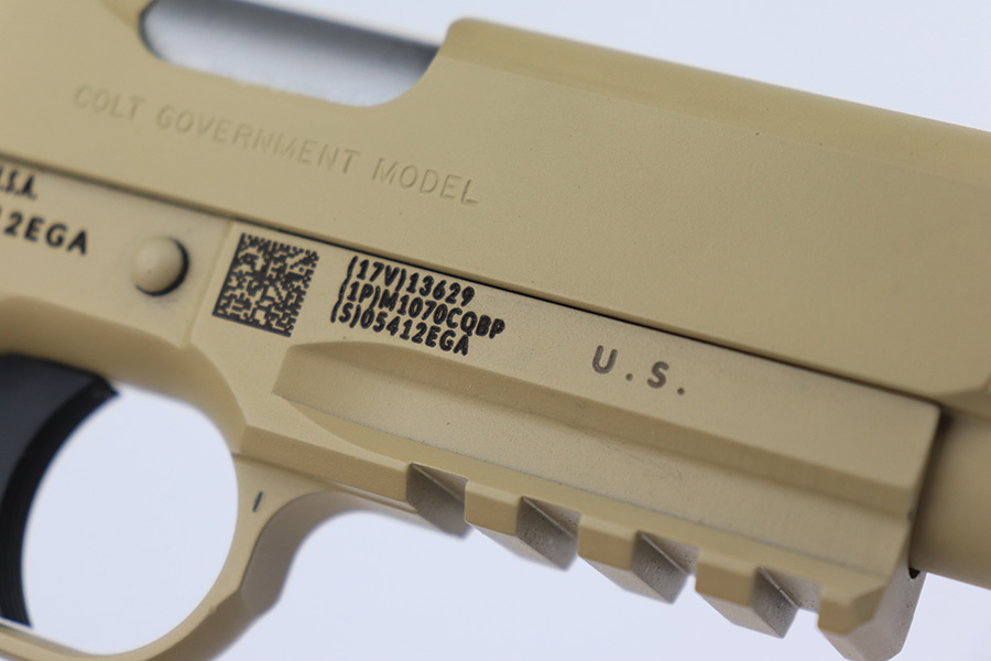 11/14/23 – According to the included factory letter (do not list pistols by serial number but signed by the President and CEO of Colt Manufacturing), this pistol is one of the original run of Colt “Rail Gun” Government Model pistols produced to United States Marine Corps specifications as the M45A1 Close Quarters Battle Pistol. Intended as a replacement for the Corps’ aging stock of 1911/1911A1 pistols, the M45A1 was destined expressly for units like Force Recon, Marine Special Operations Command (home of the Marine Raiders), and Special Operations Capable Marine Expeditionary Units. 1,000 of these pistols (470 used and 530 unissued) were traded by the Marine Corps under warranty back to Colt in exchange for newer Ionbond finished replacements, Colt in turn released these original Marine Corps pistols to the public with the caveat that the “USMC” marking be struck out. The pistol has a set of 3-dot Trijicon night sights installed on the “COLT***USMC” marked slide, with “VP” and “L” on the left side of the trigger guard and the U.S. nomenclature on the right, including the military-specific “M1070CQBP” model number. 4- groove Picatinny rails are integrated into the dust cover, with a long solid trigger, skeleton hammer, beavertail safety with “speed bump”, ambidextrous thumb safety, serrated flat mainspring housing, “desert camo” G10 composite grips, Wilson Combat magazine, and Colt National Match barrel with a finely polished and beveled. This is in “unissued” condition. Comes with the Colt shipping box.
