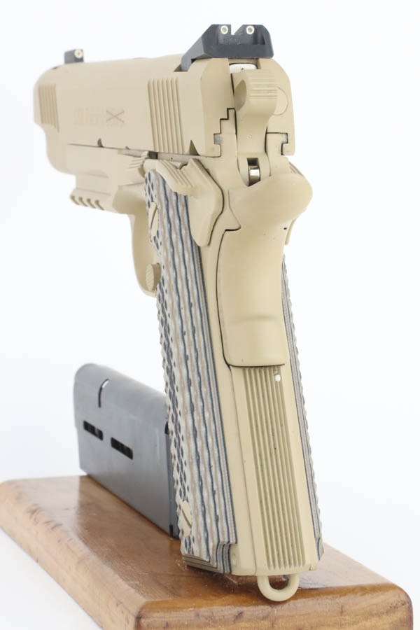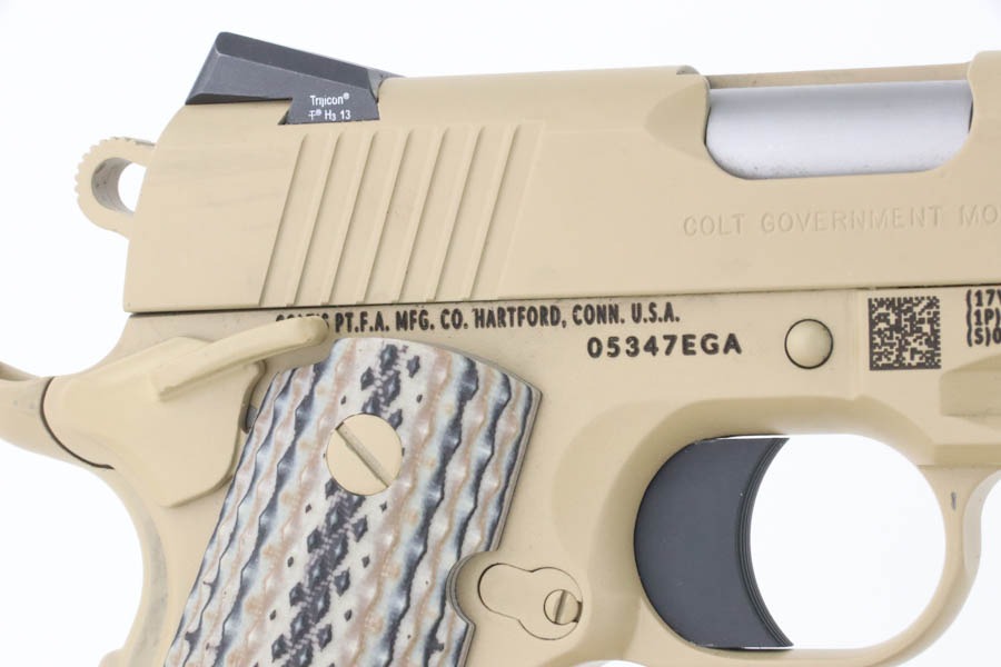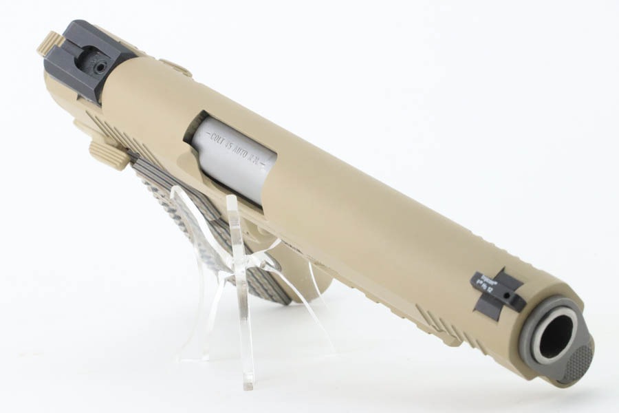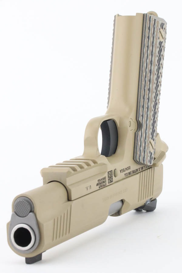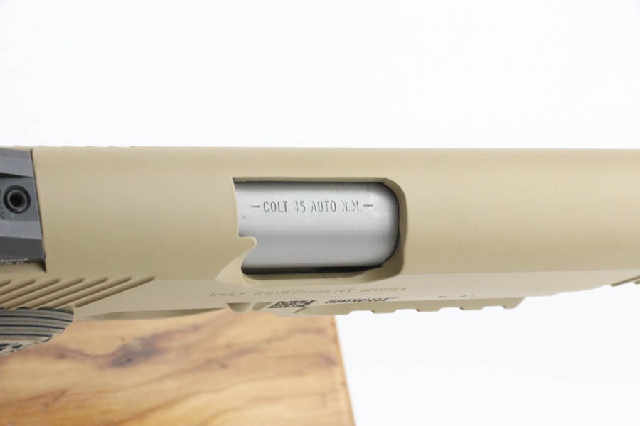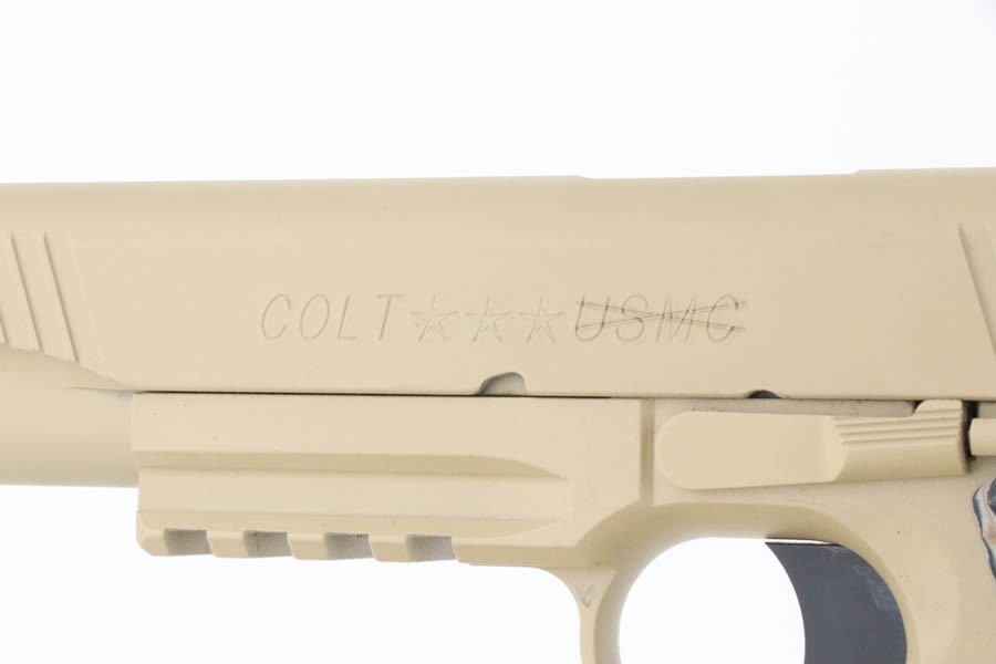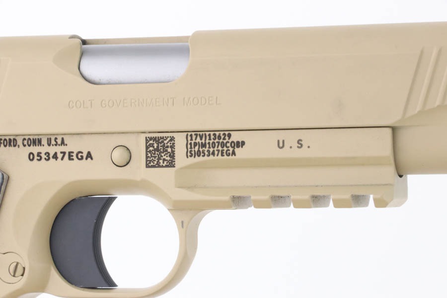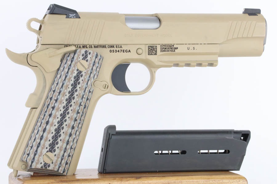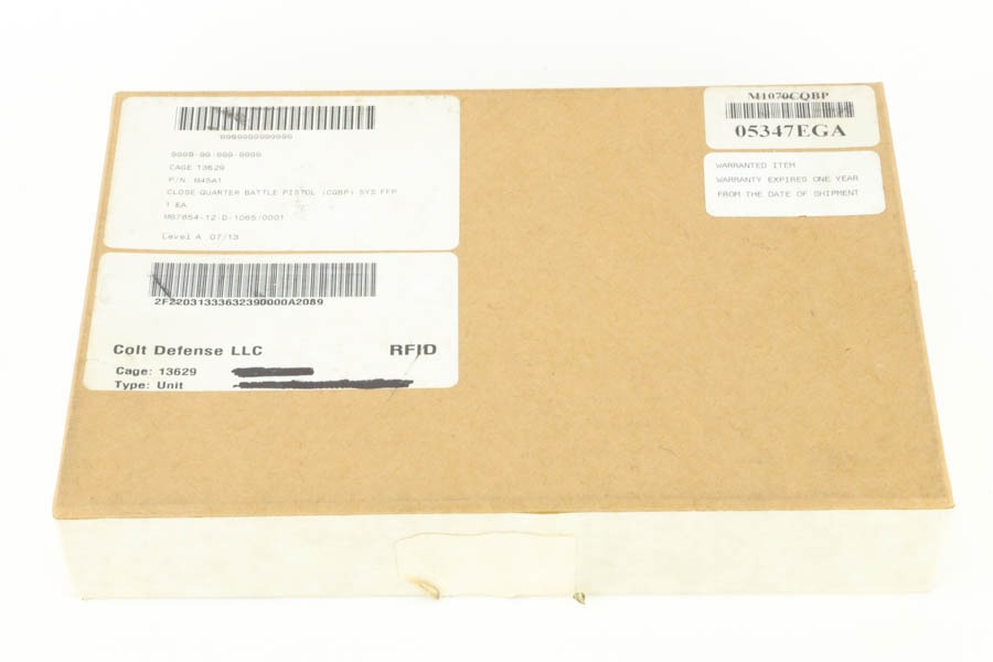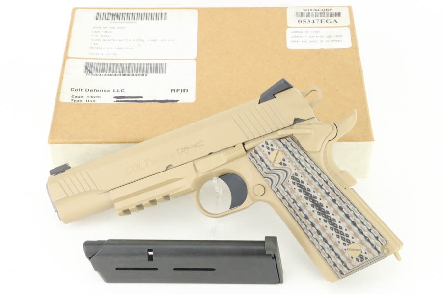 9/24/24 – This pistol is one of the original run of Colt “Rail Gun” Government Model pistols produced to United States Marine Corps specifications as the M45A1 Close Quarters Battle Pistol. Intended as a replacement for the Corps’ aging stock of 1911/1911A1 pistols, the M45A1 was destined expressly for units like Force Recon, Marine Special Operations Command (home of the Marine Raiders), and Special Operations Capable Marine Expeditionary Units. 1,000 of these pistols (470 used and 530 unissued) were traded by the Marine Corps under warranty back to Colt in exchange for newer Ionbond finished replacements, Colt in turn released these original Marine Corps pistols to the public with the caveat that the “USMC” marking be struck out. The pistol has a set of 3-dot Trijicon night sights installed on the “COLT***USMC” marked slide, with “VP” and “L” on the left side of the trigger guard and the U.S. nomenclature on the right, including the military-specific “M1070CQBP” model number. 4- groove Picatinny rails are integrated into the dust cover, with a long solid trigger, skeleton hammer, beavertail safety with “speed bump”, ambidextrous thumb safety, serrated flat mainspring housing, “desert camo” G10 composite grips, Wilson Combat magazine, and Colt National Match barrel with a finely polished and beveled. This is in “unissued” condition. Comes with the Colt shipping box.