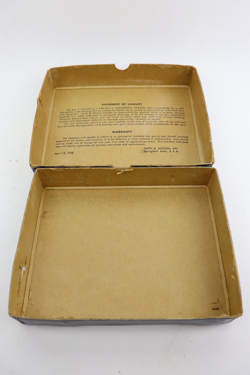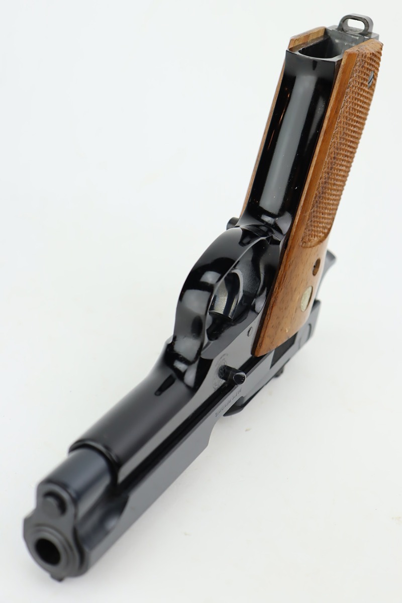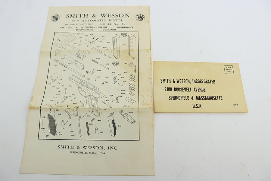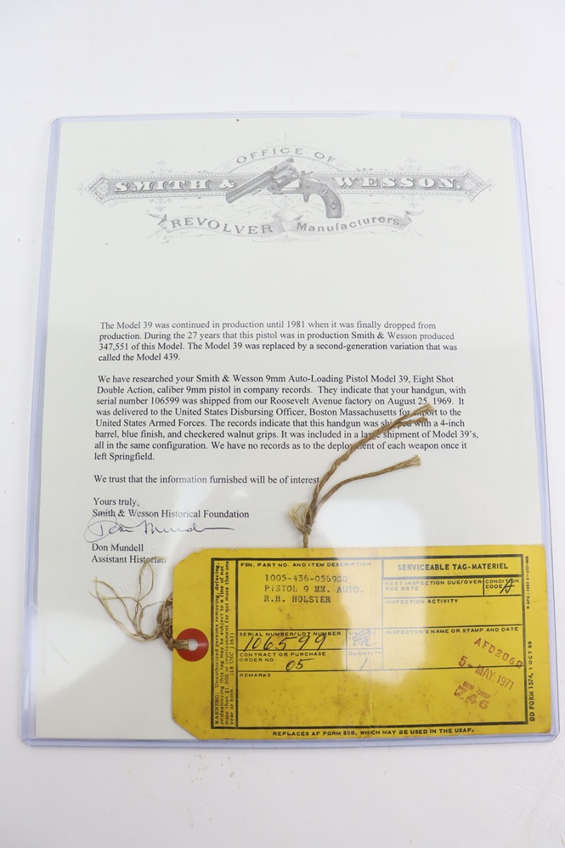 3/19/24 – This is a very rare Smith & Wesson Model 39 that was issued to the United States Air Force. The listing is accompanied by a S&W archives letter stating it was sent to the United States Disbursing Officer in Boston to be exported for use to the United States Armed Forces. It is also accompanied by a USAF hang tag with the pistol’s serial number on it. The majority of these pistols were issued to General Officers in the Air Force, though we don’t have any specific attribution for this one. The hang tag has a 1971 inspection dated and is labeled as DD Form 1574. The pistol itself is in mint condition or very close, with a mint bore and grips. No wear to mention. It comes with an original box, which is not serialized. The box includes the manuals and two spare magazines. C&R eligible.