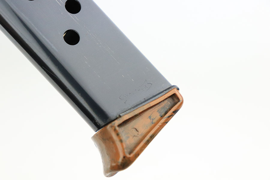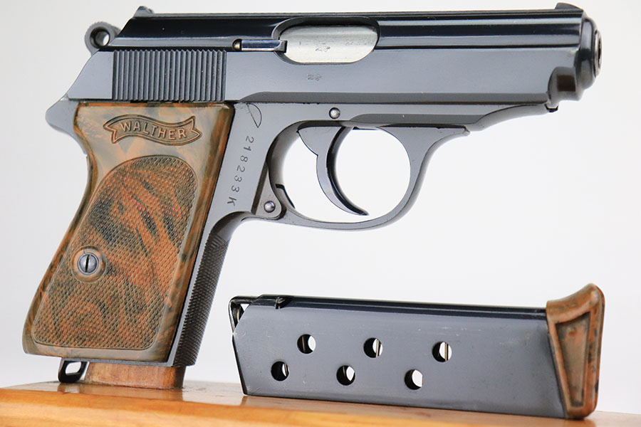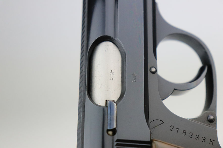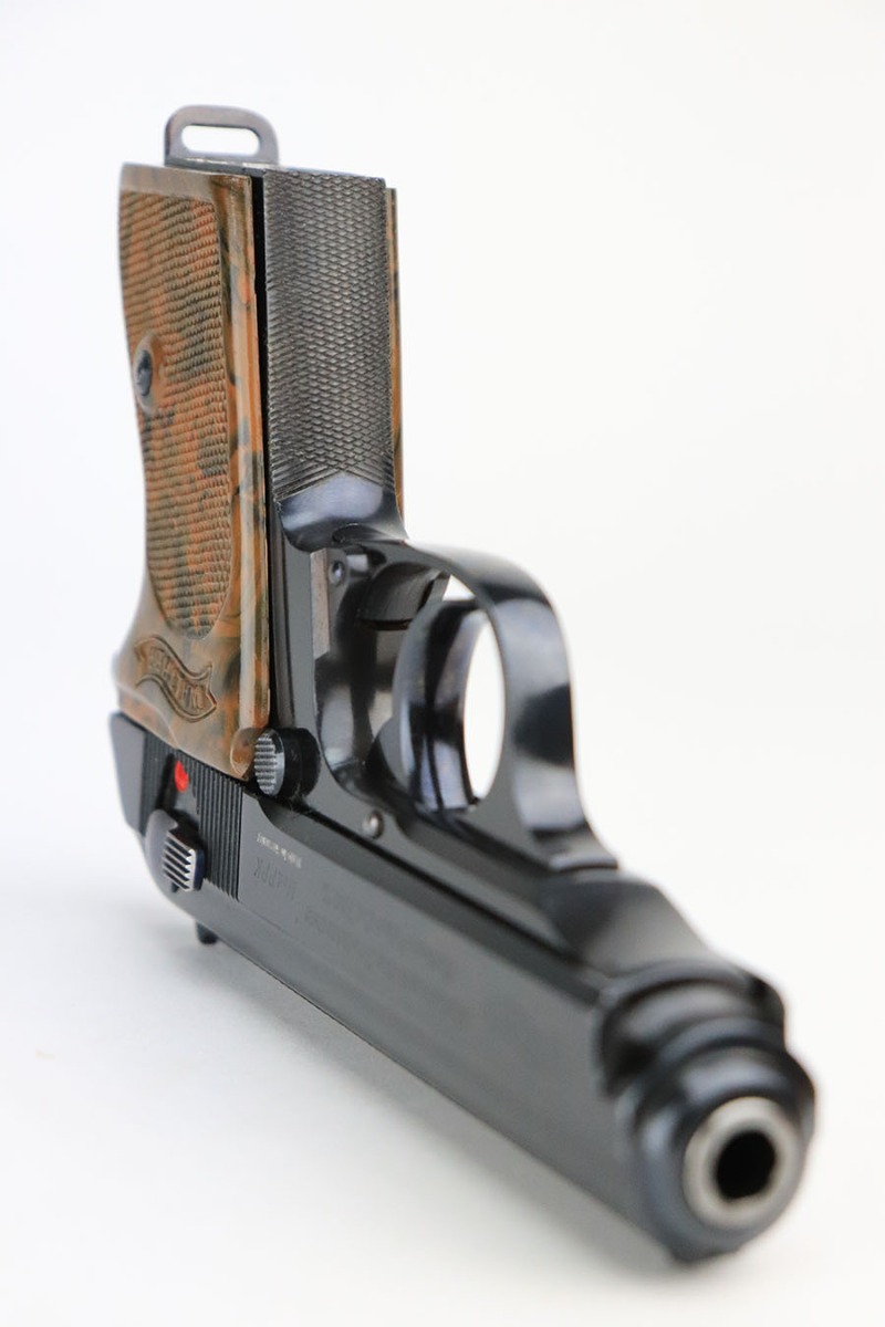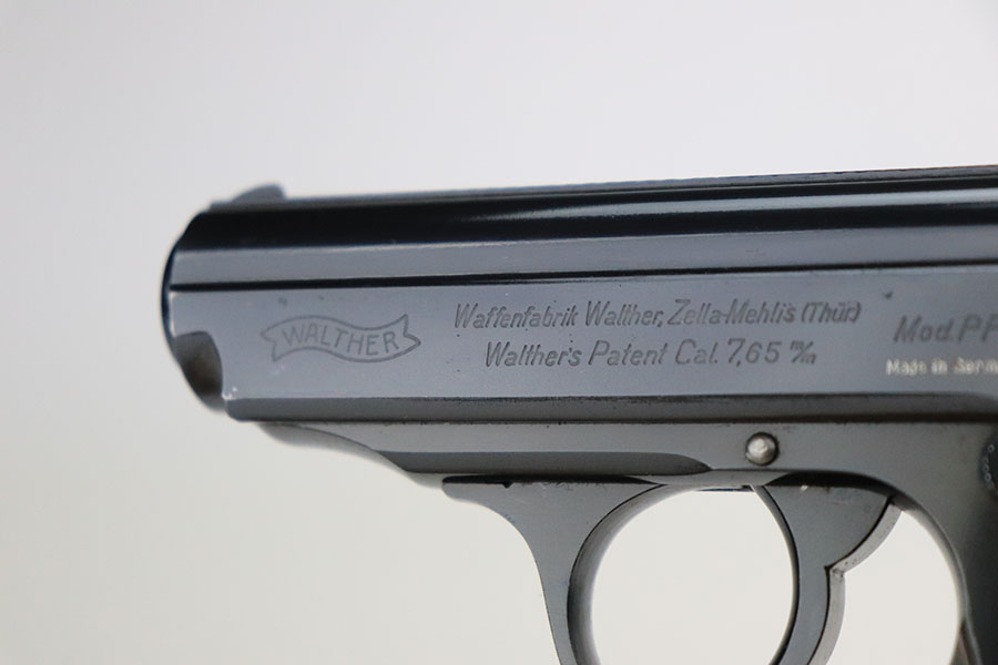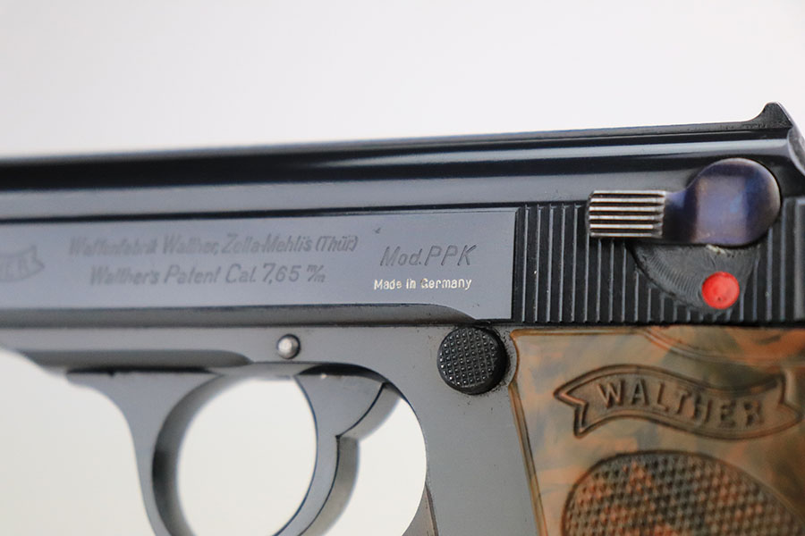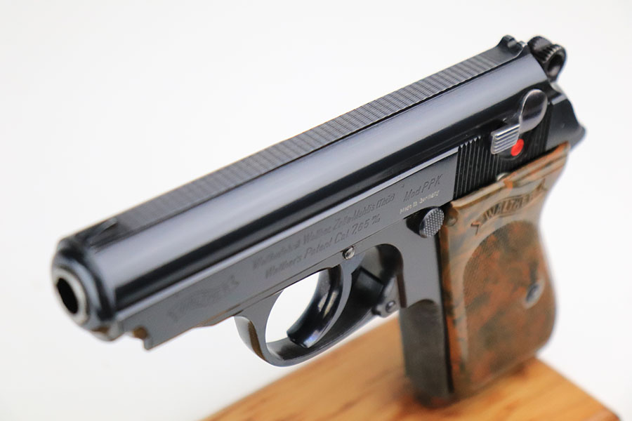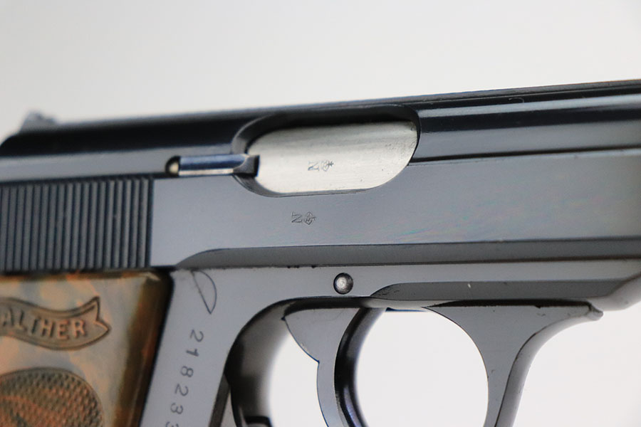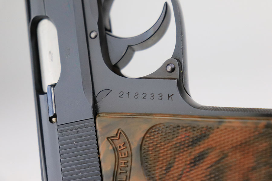 10/10/22 – This is a gorgeous example of a very rare Walther PPK manufactured in 1939 to be sold in the international commercial market. This gun was likely shipped to the US (as most were) and made to order for a private retailer, most likely Stoeger. There are no retailer markings, but it has the proper “Made in Germany” export marking on the left side of the slide and has custom-ordered factory cross-hatching on the front strap. The gun is in mint condition with virtually no signs of wear. Excellent fire blue on the safety lever. Comes with a minty brown Walther grip and a period-correct Walther banner-only magazine. The bore is stone-mint. Just a beautiful example of these rare pistols.