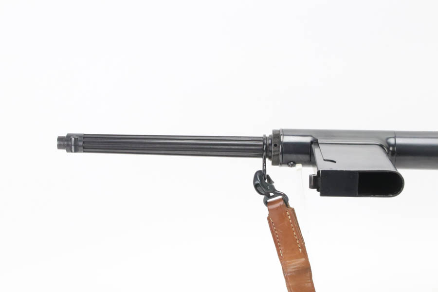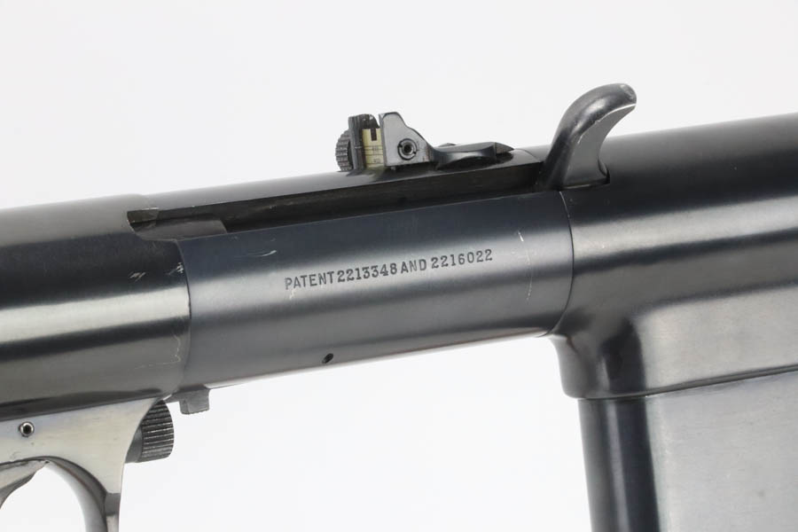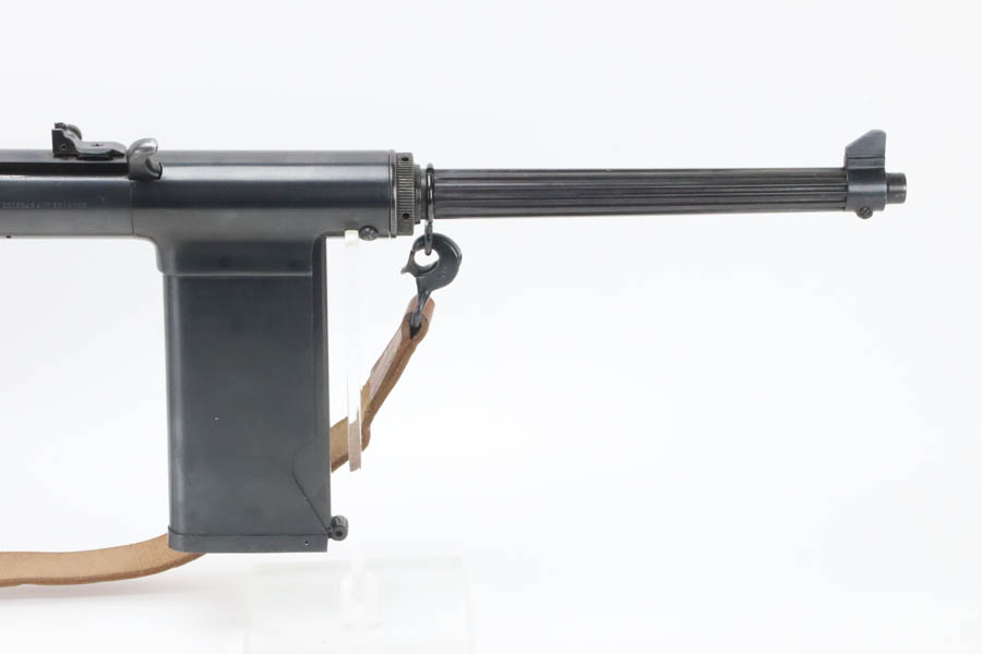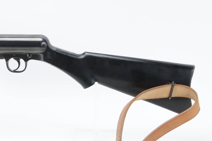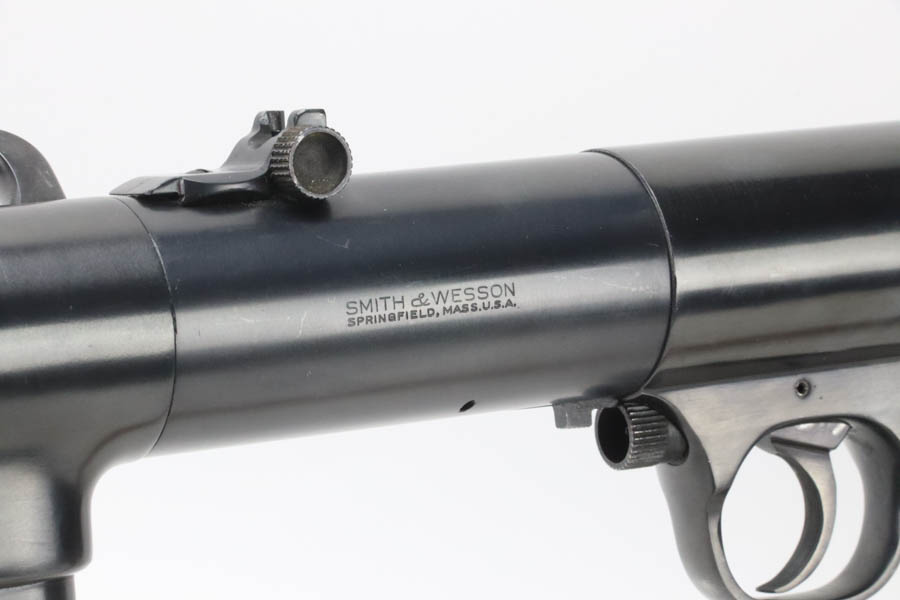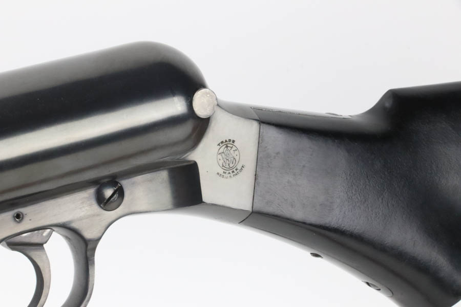 In early 1939 the British government asked Smith & Wesson to design a light rifle firing the 9×19mm Parabellum cartridge for military use. The British government advanced one million dollars toward production of the design following receipt of prototypes. Testing at the Royal Small Arms Factory revealed the rifle had been designed for cartridges as loaded by United States civilian cartridge companies, and the higher pressure United Kingdom military loads caused broken receivers after as few as 1,000 rounds. The British government required redesign so rifles would withstand firing 5,000 rounds without failure. The receiver was strengthened with an external sleeve to meet that requirement. Rifles with the strengthened receiver were designated Mark II and rifles with original receivers were subsequently referred to as Mark I. This rifle is one of the original Mark I examples in exquisite, original condition. The British government cancelled the production contract after receiving 60 prototypes and 950 rifles. Approximately 750 were Mark I rifles, and about 200 were the stronger Mark II design. The rifles were not issued to the armed forces and most were cut in half and dumped at sea when the second world war ended. Five were saved for display in museums including the Tower of London. Smith & Wesson continued production with serial numbers as high as 2200 and the rifle was tested by the United States Army at Aberdeen Proving Ground. The Army rejected the design because the rifle was chambered for what was then a non-standard cartridge for the United States military. There was some discussion about redesign to permit full-automatic fire, but production was halted after a total of 1,227 rifles had been manufactured. The short-barreled weapons were considered unsuitable for sale to civilians under the National Firearms Act, so an inventory of 217 remained at the Smith & Wesson factory until a dealer negotiated Curio and Relic Firearms status with the Bureau of Alcohol, Tobacco, Firearms and Explosives in 1975. Firearms collectors subsequently purchased 137 Mark I and 80 Mark II rifles.
