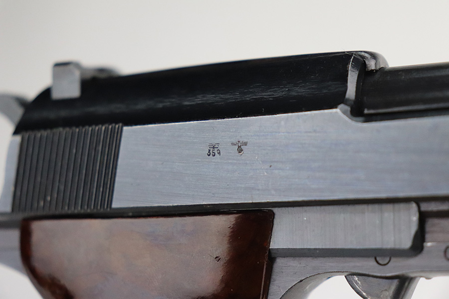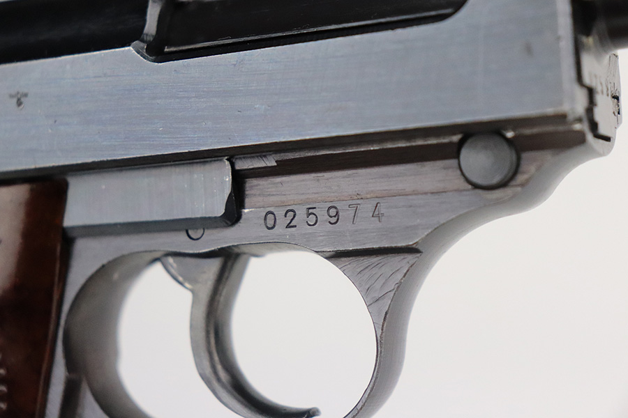 7/6/21 – This is a beautiful, minty example of a very rare “Zero Series” Walther P.38, manufactured in 1945. They are called a zero series because the serial numbers start with a zero. Only 1,750 of these were produced according to Whittington’s book. This one is all matching and has one “Eagle 359” military acceptance proof – typical for these guns. This one has retained more than 98% of its late-war finish. There is very minor thinning on the front strap and hints of wear on the high edges. Comes with excellent late-war grips and a rare late-war “U” marked magazine. The bore is factory-new. De-cocker is functional. Just a beautiful example.