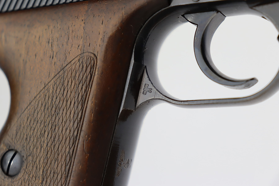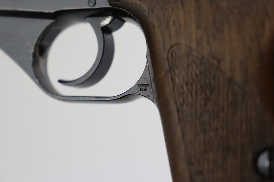 9/6/23 – This is a very rare, third variation German Kriegsmarine Mauser HSc. One of only 2,000 produced, it features the Navy eagle on the front strap, as well as the E/M/11/3 marking on trigger guard. The pistol is matching and original with around 92% of the blue remaining. Minor wear on the trigger guard, thinning on the back strap, and a spot of wear on both the front strap and right side of the slide. Minty bore. Excellent wood grips with only minor indent on right panel. Banner mag.