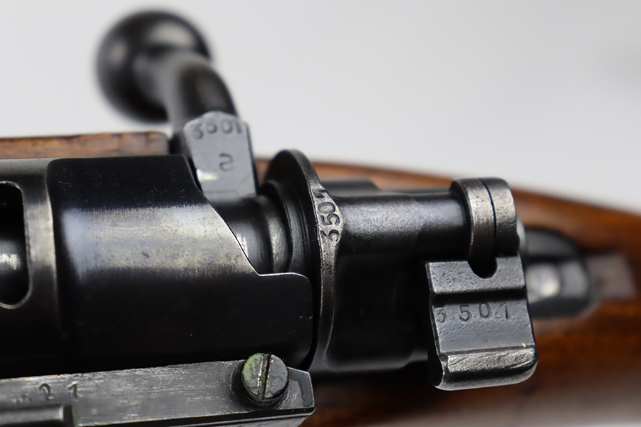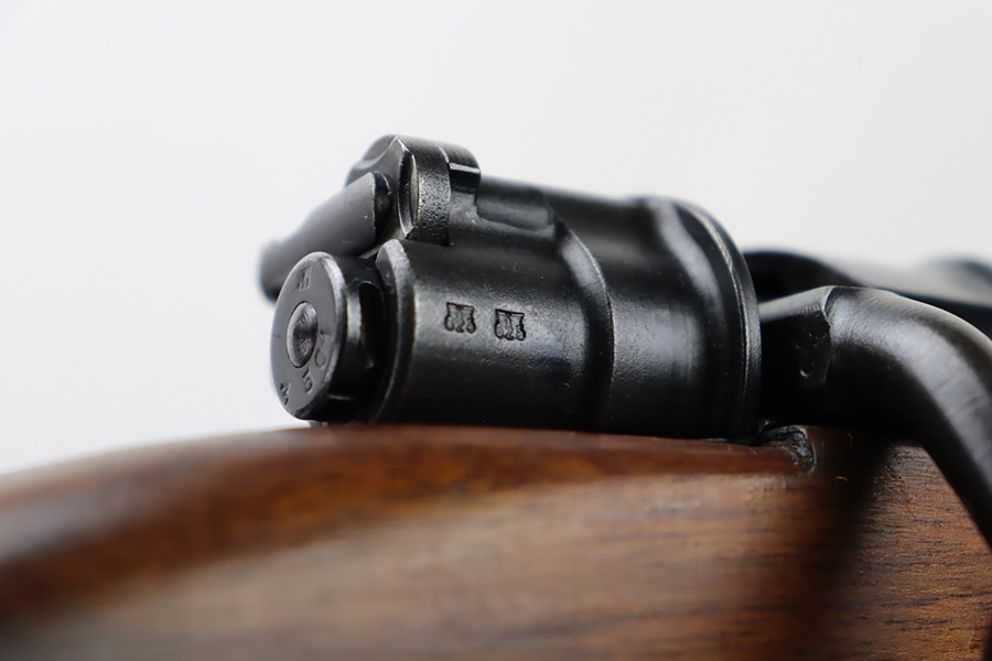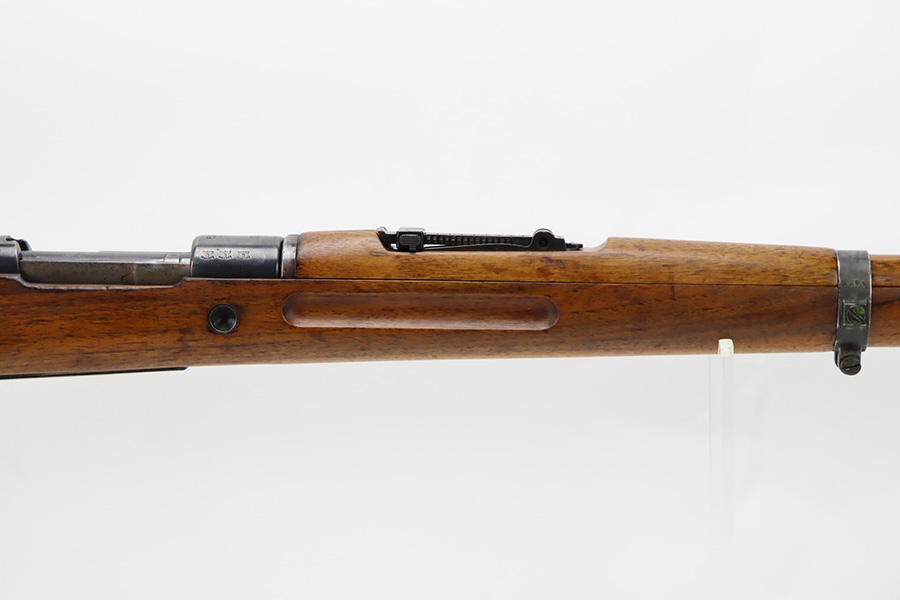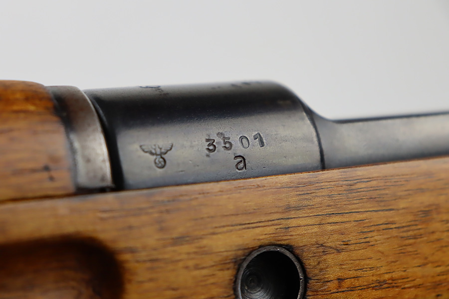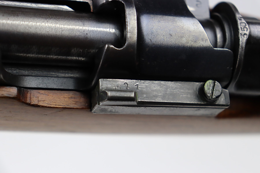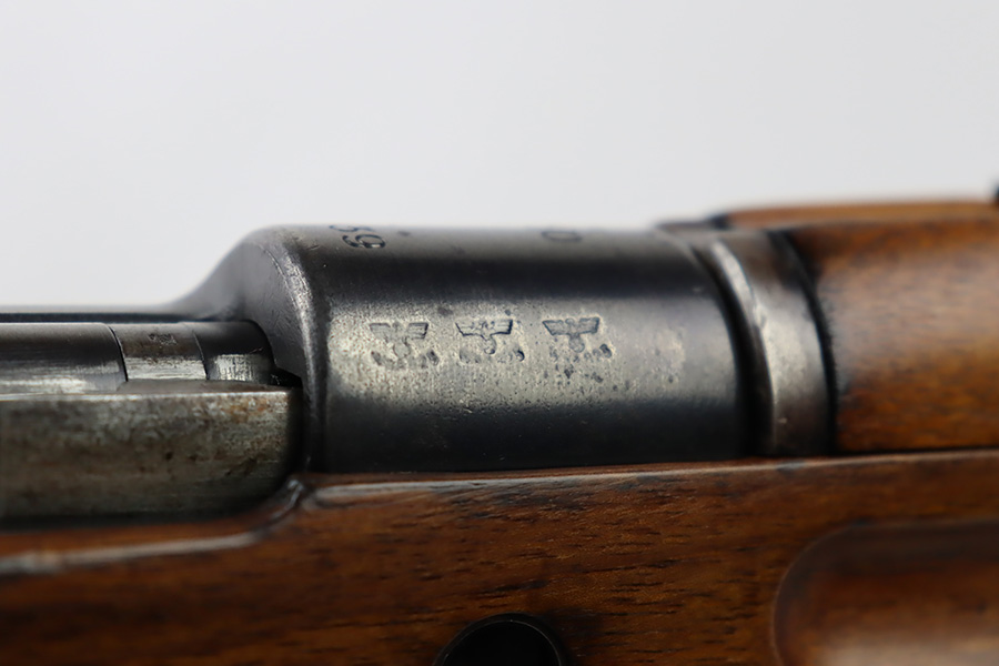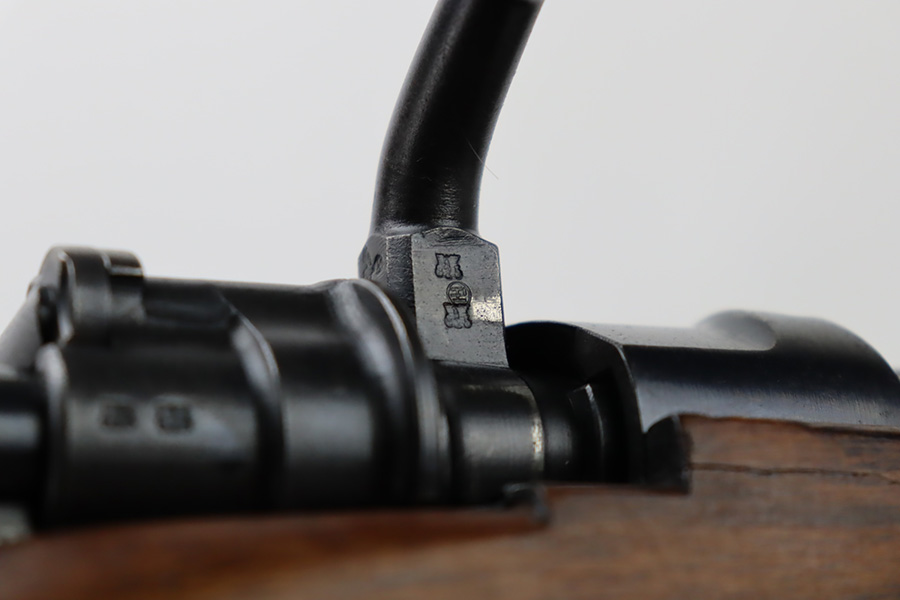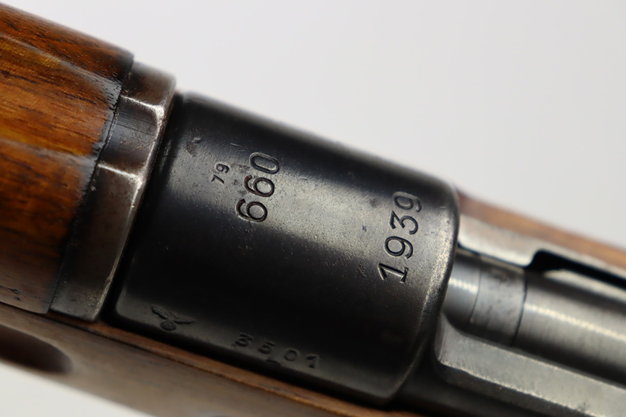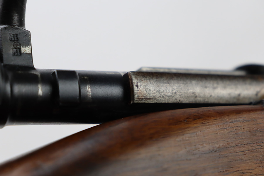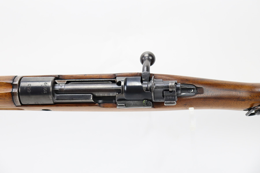 10/5/23 – This is a very rare Steyr G29(o) assembly that was part of a small Luftwaffe contract. These rifles were part of a separate contract that was being manufactured at Steyr when the 1938 annexation of Austria occurred. The Luftwaffe, in desperate need of small arms, immediately took over the production and the rifle was modified as much as possible to the standard 98k Rifle configuration. It was made briefly in 1938 and early 1939, after which the factory was re-tooled to manufacture the standard K98k. This one is matching and has retained roughly 75-80% of its finish. There is some spotty wear around the muzzle and areas of finish loss on the barrel bands and on the floor plate/trigger group. Spotty oxidation on the butt plate. Excellent wood stock that has been lightly sanded. Minty bore.