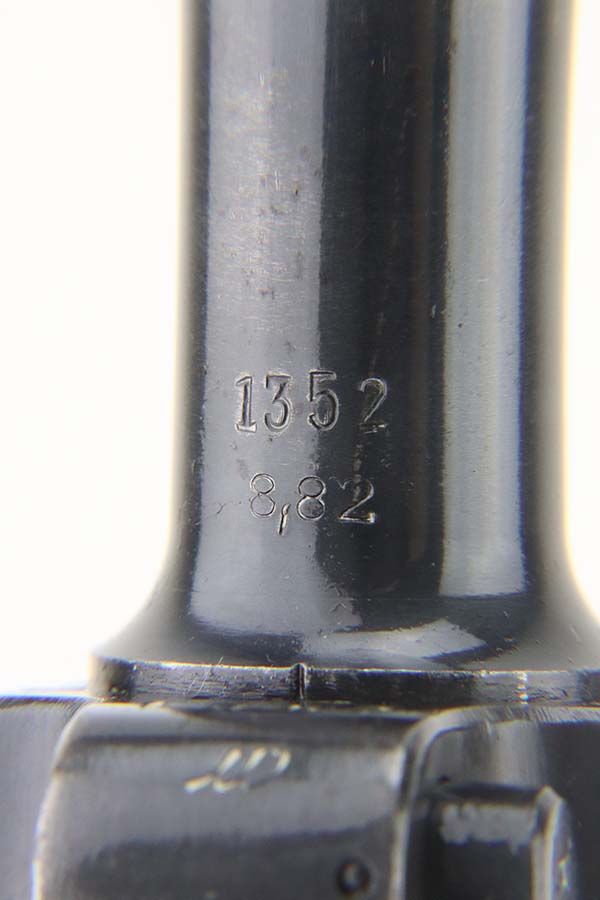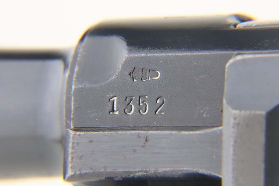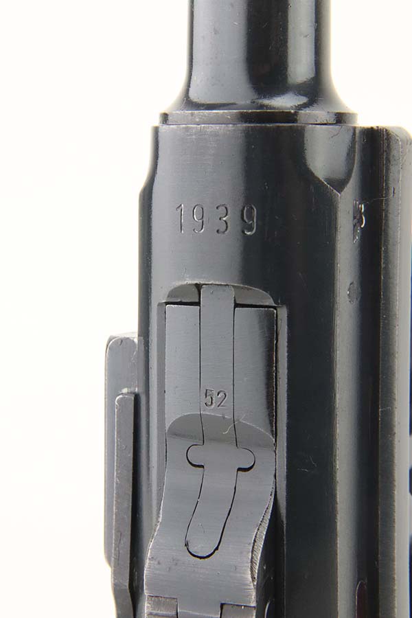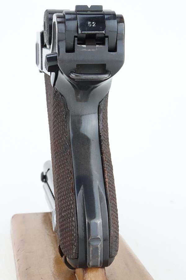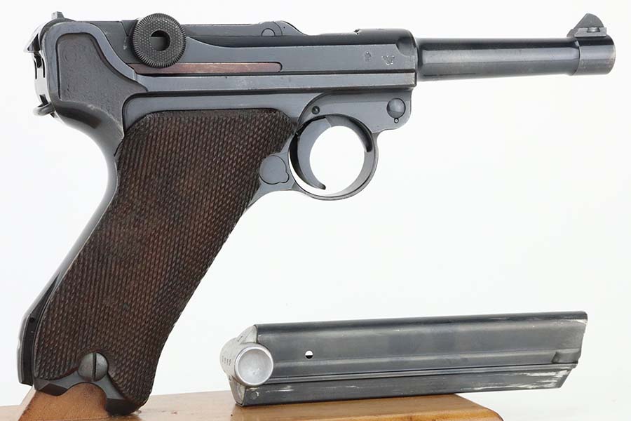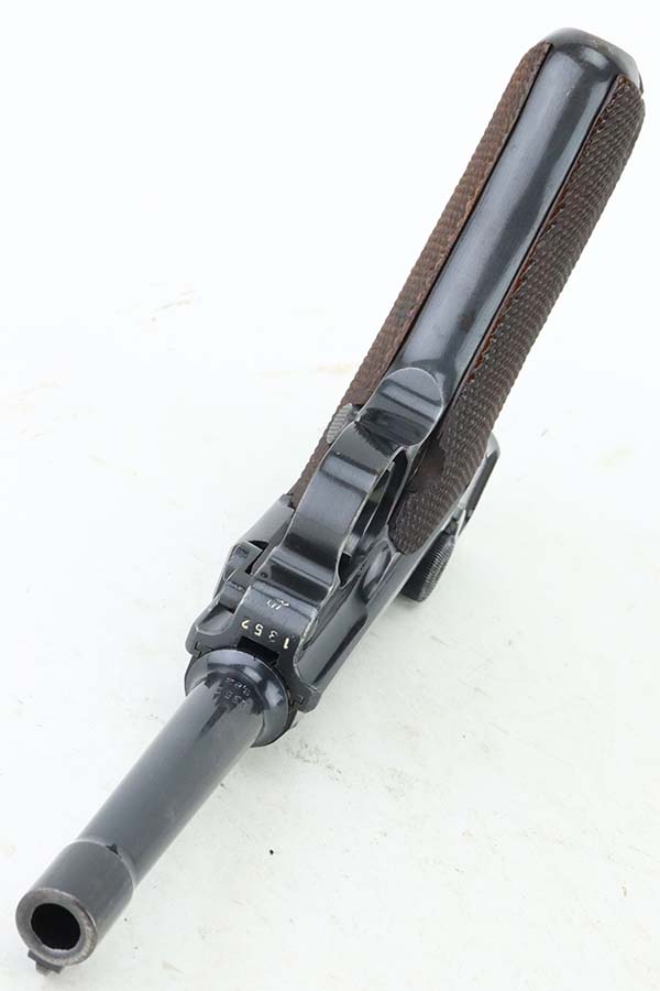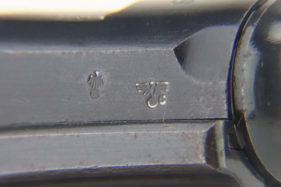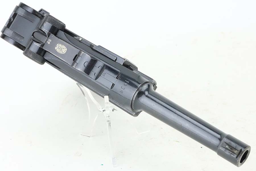 5/20/24 – This is a very rare and desirable Police Mauser Banner Luger from 1939 with Eagle/C inspection stamp on receiver, as well as the Eagle/6 Simson proof. There were only ~1,500 of this variation produced in 1939, and this one is all matching, including the original grips and one of the original magazines. The pistol has about 98% of the original blue with only minor high edge wear and an excellent bore. The grips have sharp checkering and no chips or cracks.