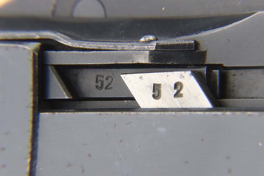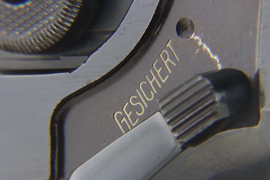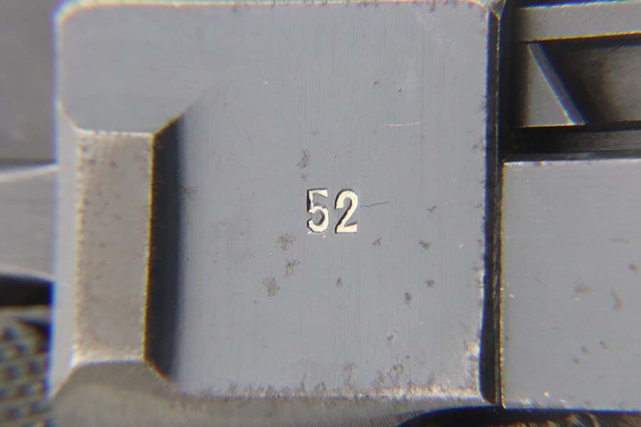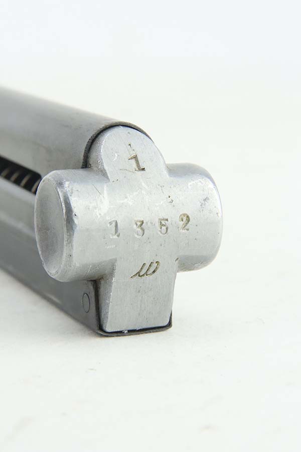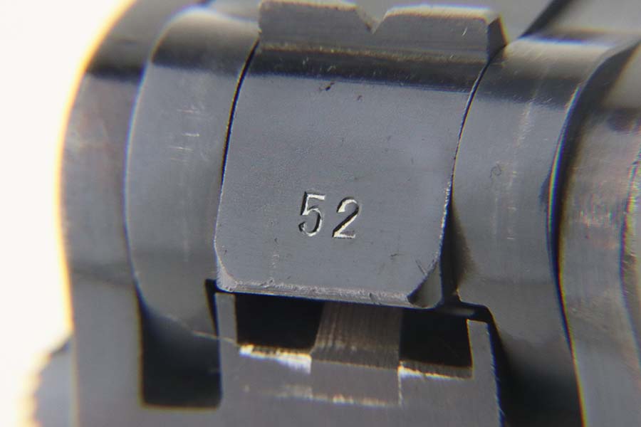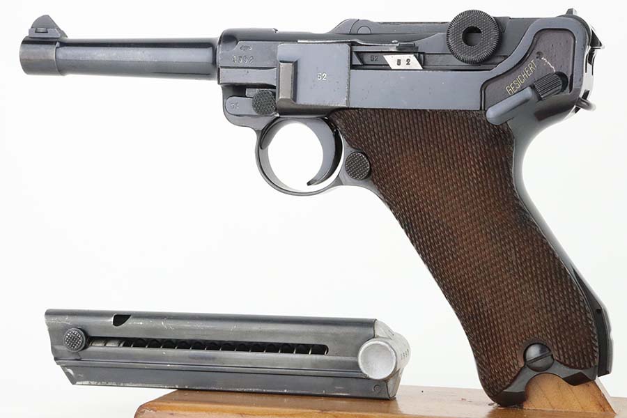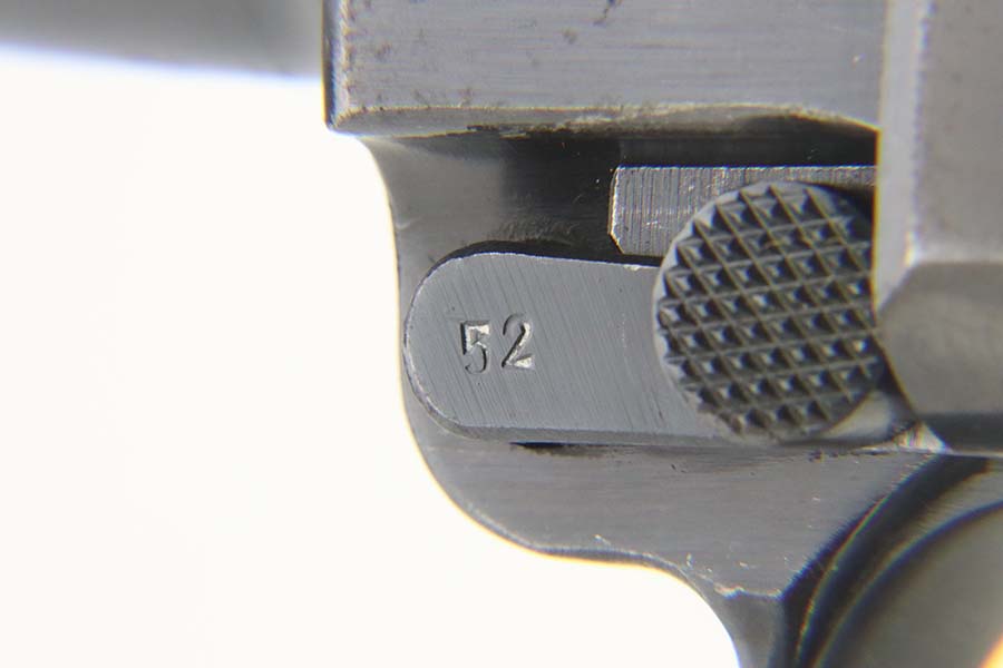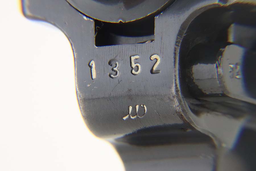 5/20/24 – This is a very rare and desirable Police Mauser Banner Luger from 1939 with Eagle/C inspection stamp on receiver, as well as the Eagle/6 Simson proof. There were only ~1,500 of this variation produced in 1939, and this one is all matching, including the original grips and one of the original magazines. The pistol has about 98% of the original blue with only minor high edge wear and an excellent bore. The grips have sharp checkering and no chips or cracks.