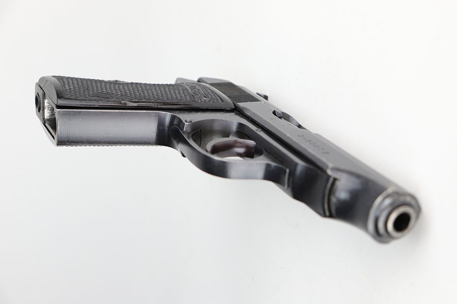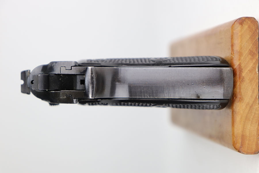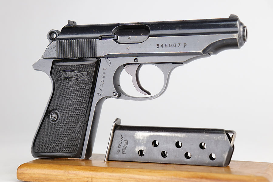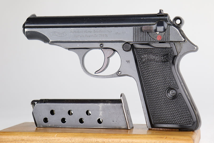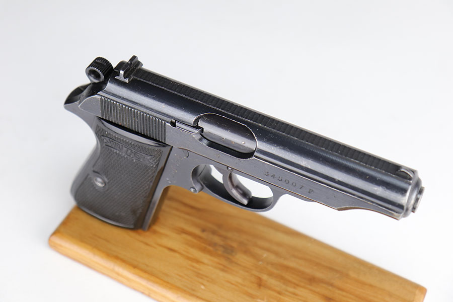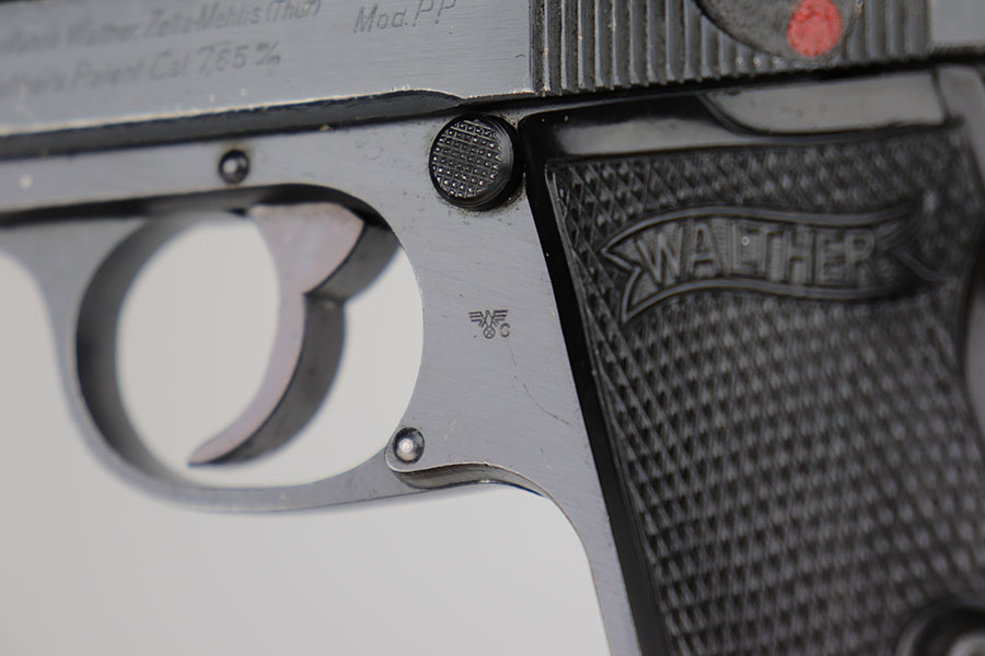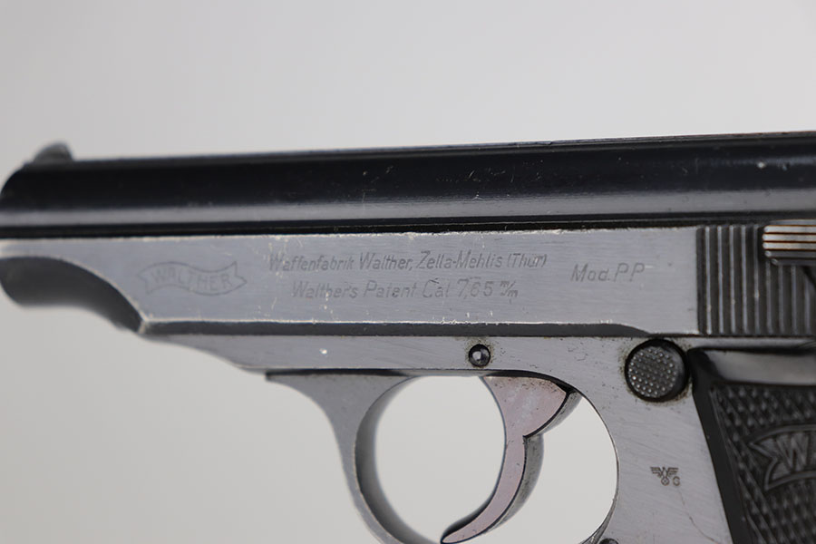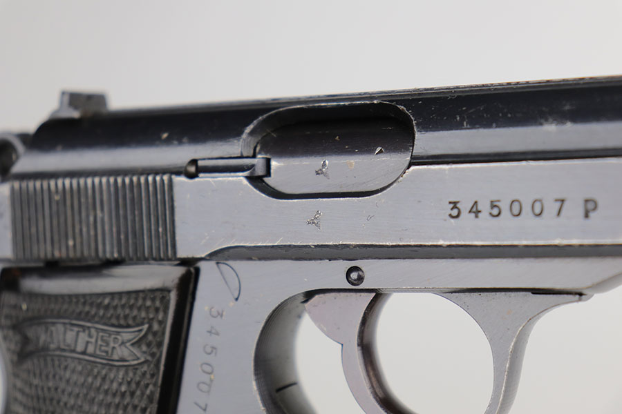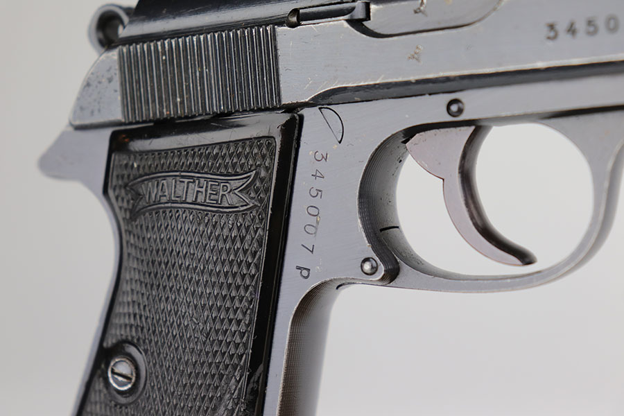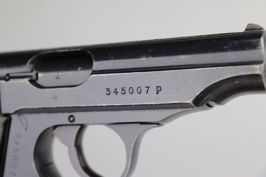 11/19/20 – This is a super rare Police Walther PP variation from late in the war. It’s Eagle/C proofed with military blue, one of only 2,000 produced. It’s in the correct and very narrow serial range for these pistols. The bluing rates at 97+% with only tiny hints of wear here or there on the slide, and a little bit of pitting on the right rear portion of the slide. Minty bore. Left grip panel is nice but right grip panel shows smoothing/handling wear. Original wartime magazine.