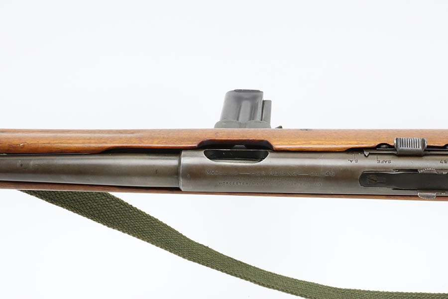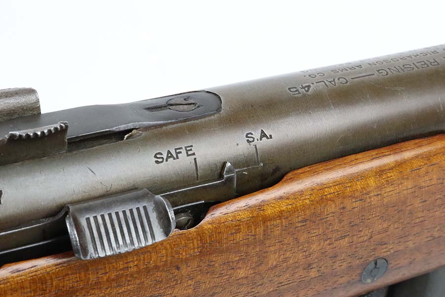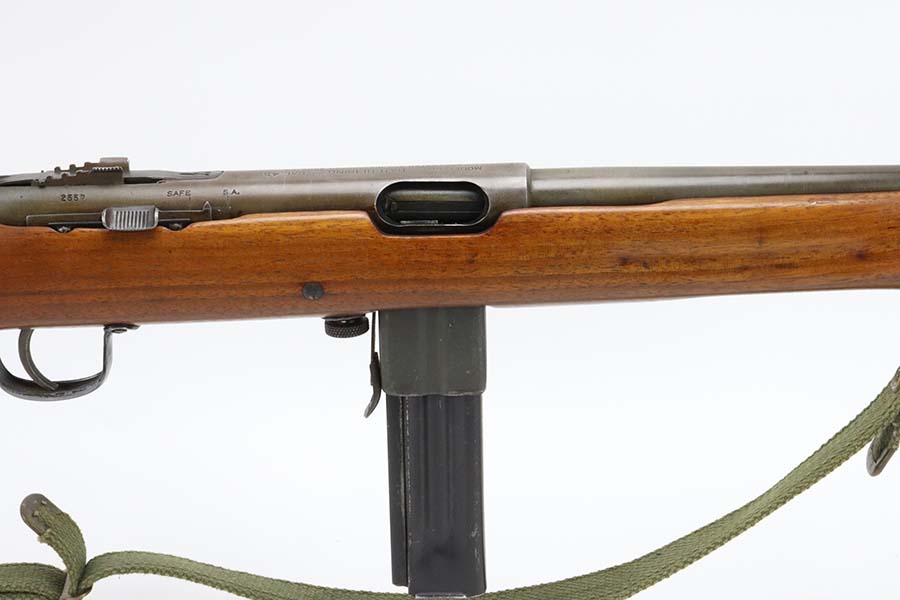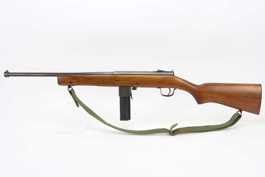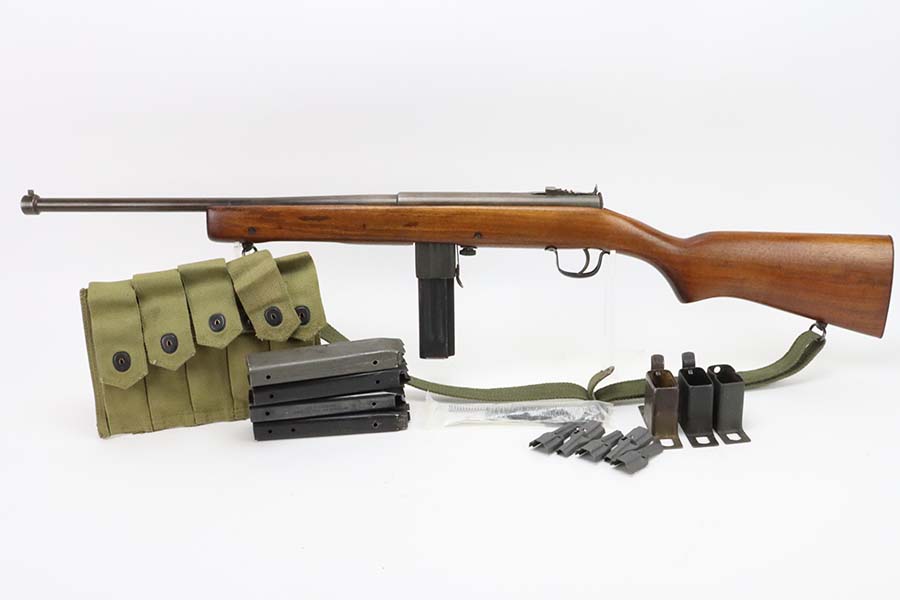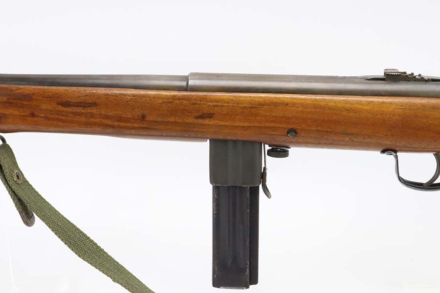 3/14/24 – This is a rare and excellent H&R Reising Model 60 semiautomatic rifle. This rifle was the semiautomatic variant of the Model 50, and were typically used by the Marines for training, guard duty and other non-combat roles. This variant was only manufactured from 1941-1945, and this serial would be towards the end of that range. There were only about 3,000 of this model produced during the war, compared to over 120,000 of the submachine guns. And of that production number, about ~2000 were parkerized. This rifle shows minor thinning and patina to the metal finish. The stock is in terrific shape with no issues. Strong, shiny bore. The listing includes a canvas sling. Also comes with a US marked mag pouch with four spare magazines. The listing also includes some spare parts.