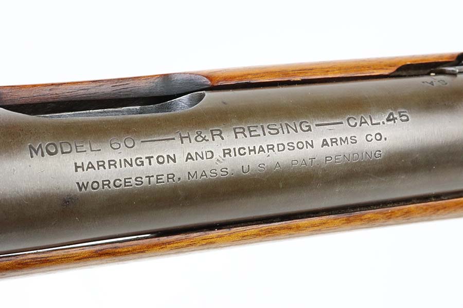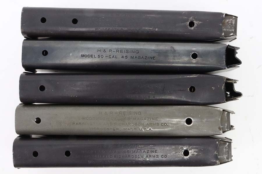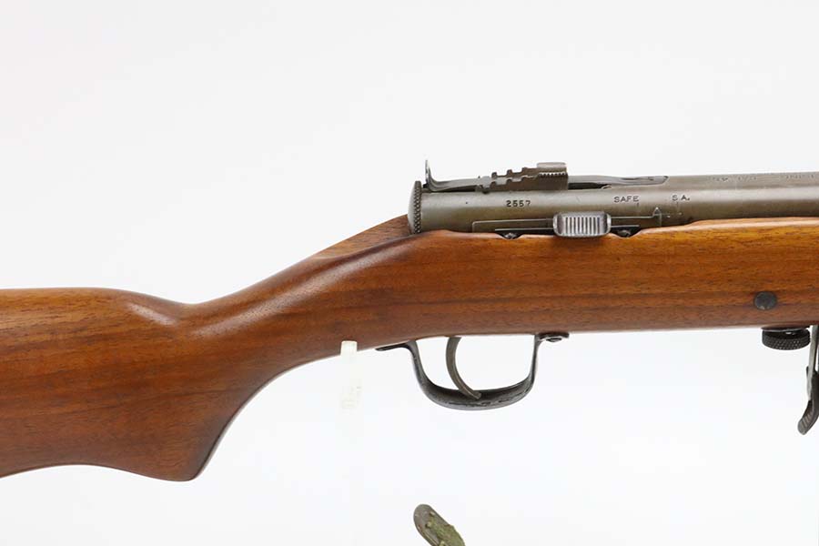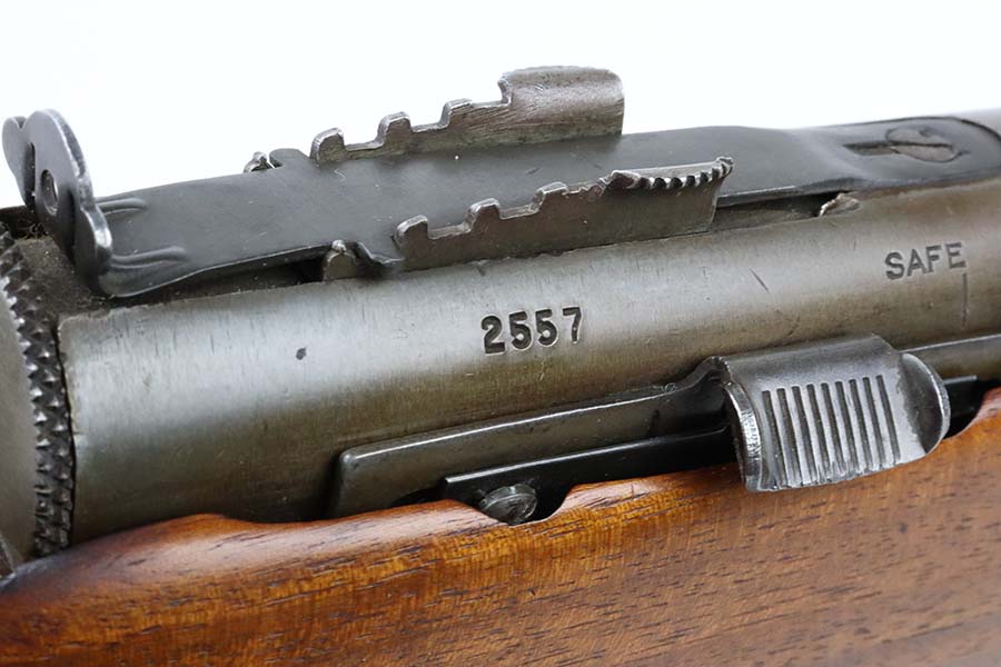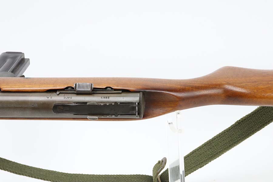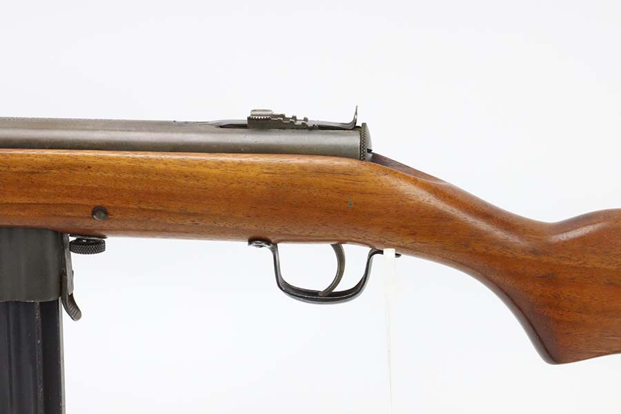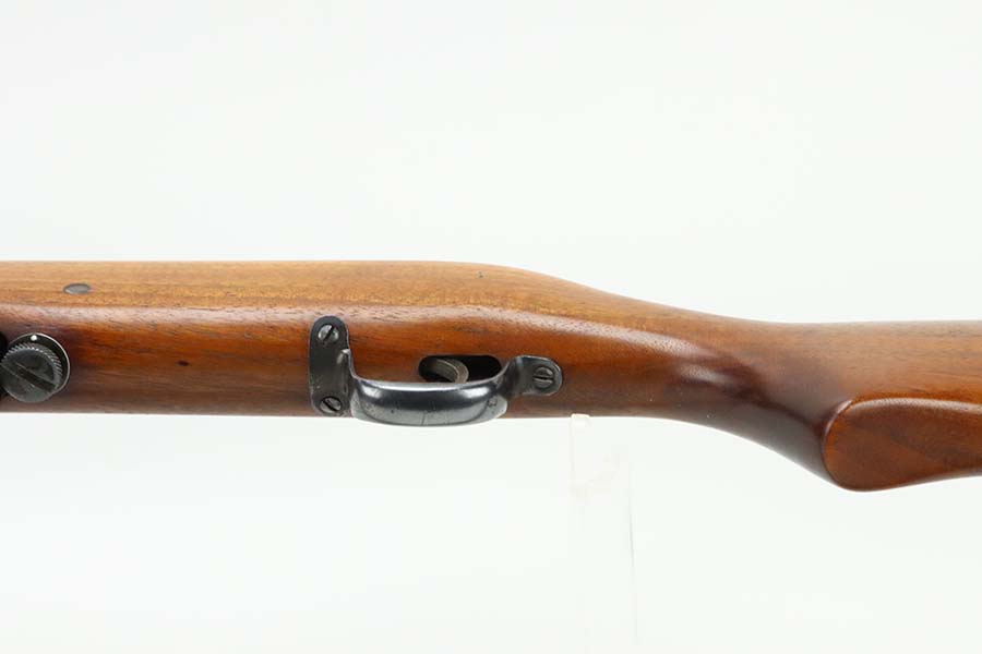 3/14/24 – This is a rare and excellent H&R Reising Model 60 semiautomatic rifle. This rifle was the semiautomatic variant of the Model 50, and were typically used by the Marines for training, guard duty and other non-combat roles. This variant was only manufactured from 1941-1945, and this serial would be towards the end of that range. There were only about 3,000 of this model produced during the war, compared to over 120,000 of the submachine guns. And of that production number, about ~2000 were parkerized. This rifle shows minor thinning and patina to the metal finish. The stock is in terrific shape with no issues. Strong, shiny bore. The listing includes a canvas sling. Also comes with a US marked mag pouch with four spare magazines. The listing also includes some spare parts.