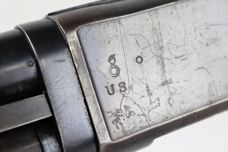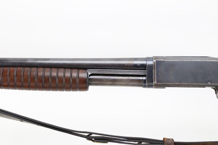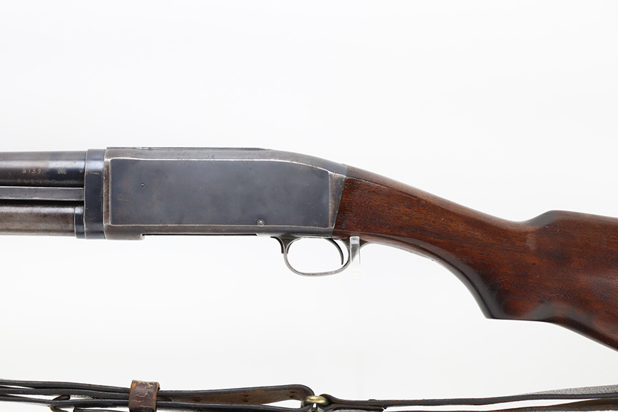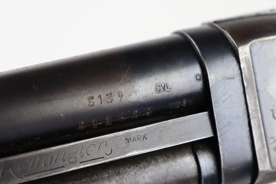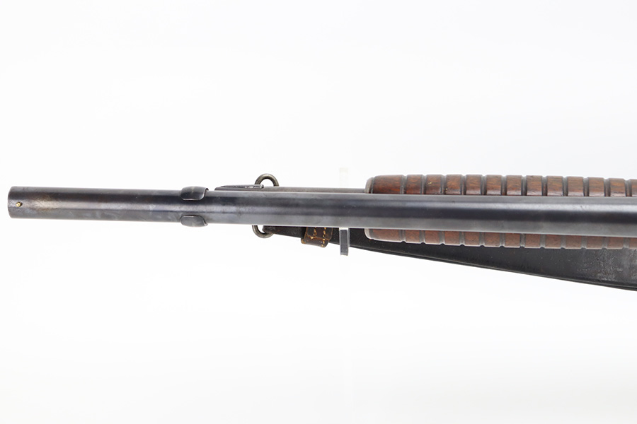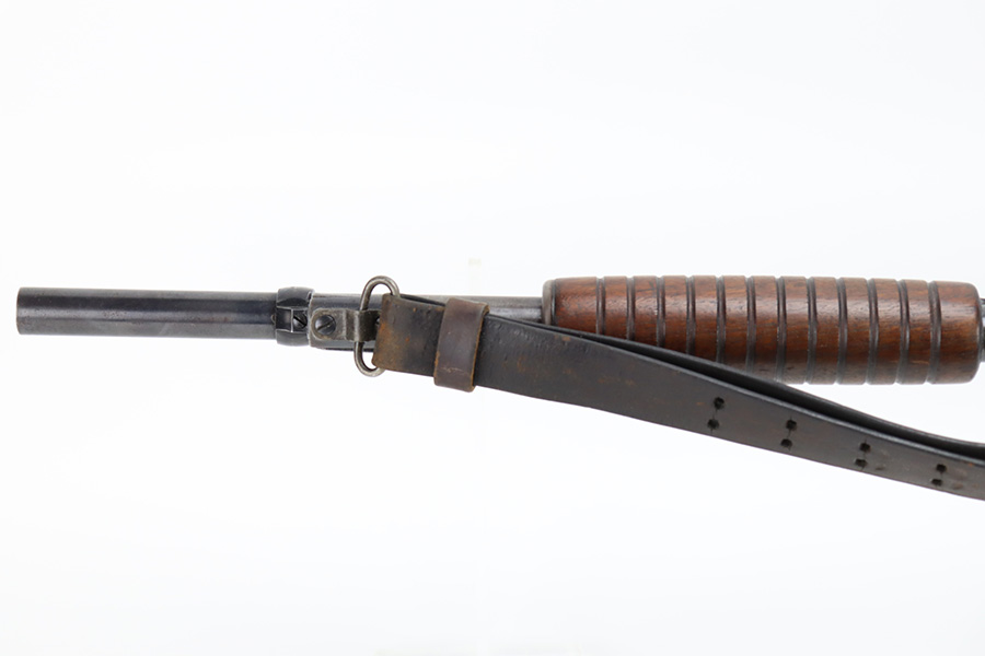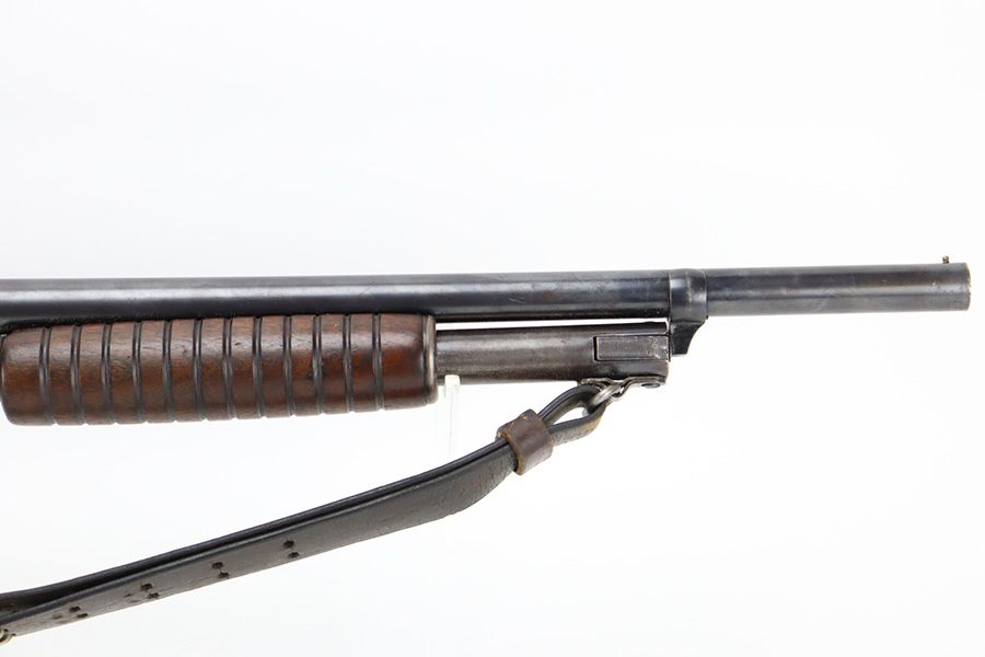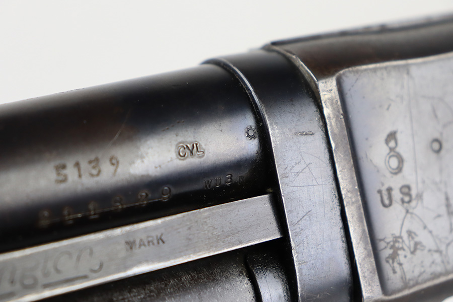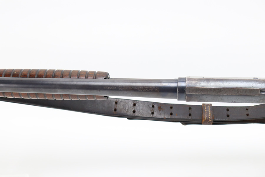 1/9/24 – This is a super rare Remington Model 10 shotgun that was issued to the U.S. military. A correct Model 10 trench is probably the rarest and hardest-to-find U.S. military shotgun from either World War. The majority of them were converted back into riot or sporting shotguns over time, as you see with this one. The proper serial range for such military examples goes from 117731-165566, so this is one of the latest produced serial numbers. The barrel shows signs of that conversion, as the military crossed out the original serial and etched the matching last four digits of the receiver on it. The receiver is marked with the flaming bomb and U.S. proof. Barrel is marked ‘Model 10’ and has the 1905 patent date. The wood furniture is unmarked and all in excellent condition. Shiny bore with only minor hints of frost. Comes with an original wartime leather sling. The bluing is original throughout, and shows some thinning, patina and surface scuffs on the receiver.