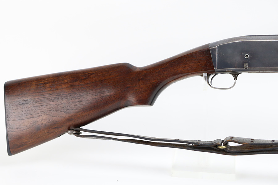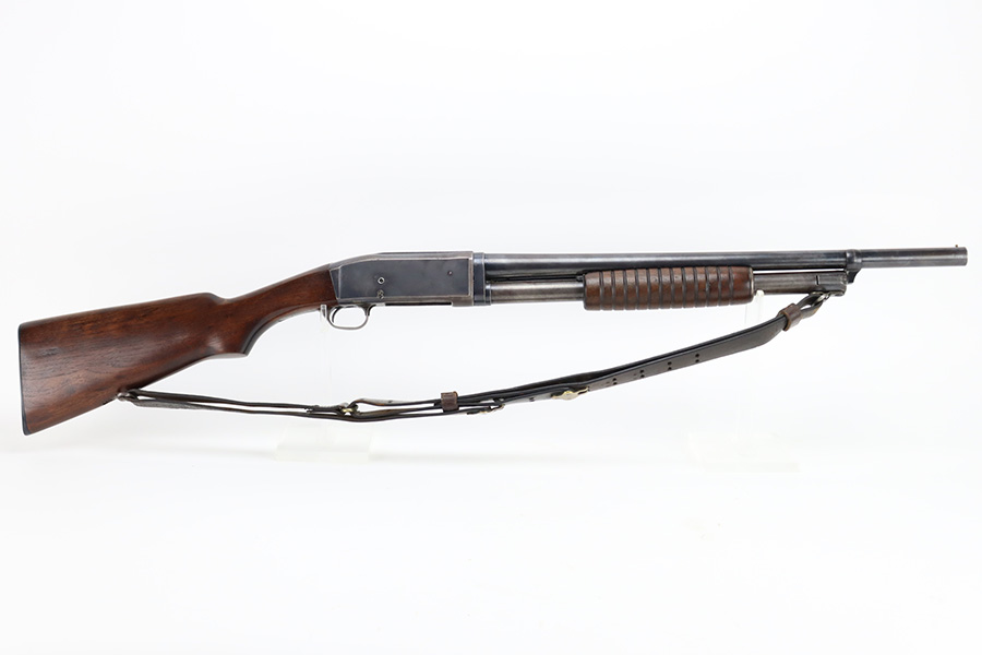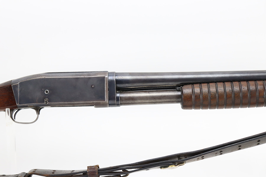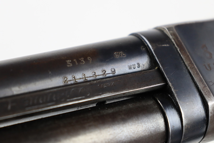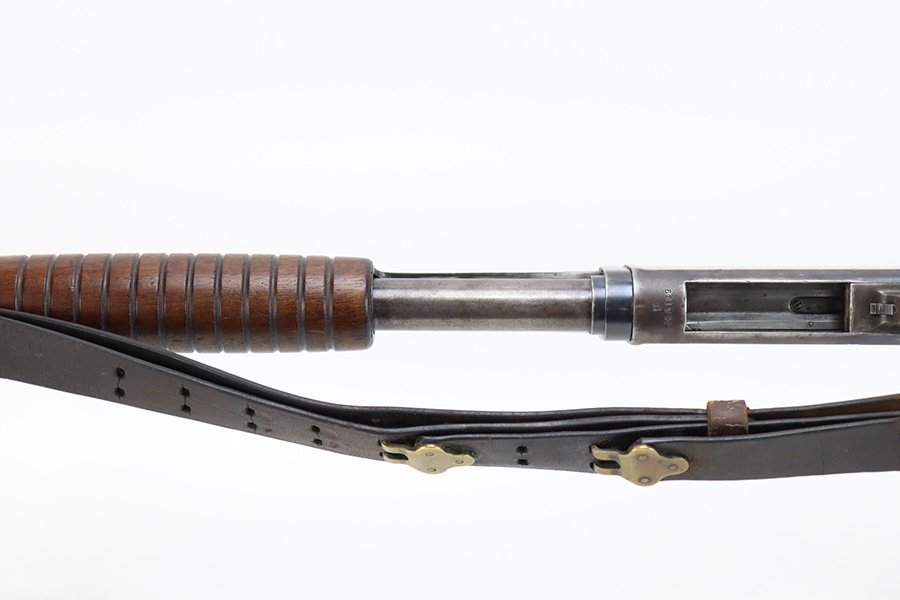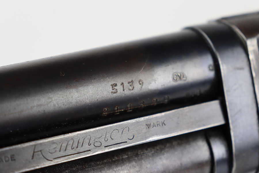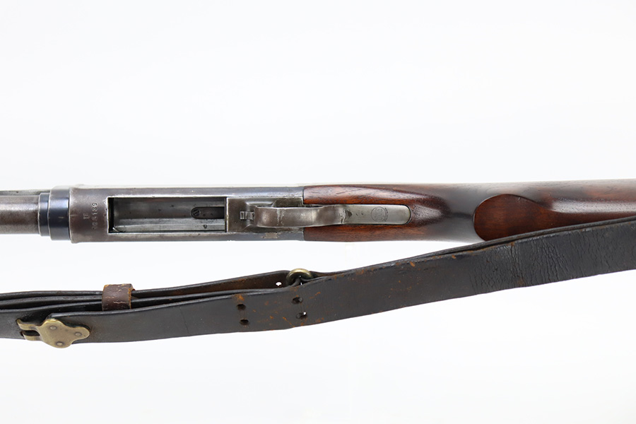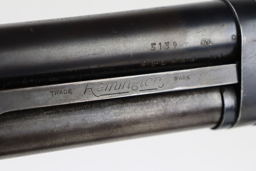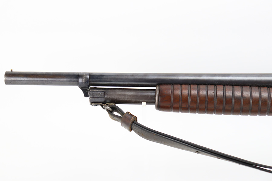 1/9/24 – This is a super rare Remington Model 10 shotgun that was issued to the U.S. military. A correct Model 10 trench is probably the rarest and hardest-to-find U.S. military shotgun from either World War. The majority of them were converted back into riot or sporting shotguns over time, as you see with this one. The proper serial range for such military examples goes from 117731-165566, so this is one of the latest produced serial numbers. The barrel shows signs of that conversion, as the military crossed out the original serial and etched the matching last four digits of the receiver on it. The receiver is marked with the flaming bomb and U.S. proof. Barrel is marked ‘Model 10’ and has the 1905 patent date. The wood furniture is unmarked and all in excellent condition. Shiny bore with only minor hints of frost. Comes with an original wartime leather sling. The bluing is original throughout, and shows some thinning, patina and surface scuffs on the receiver.