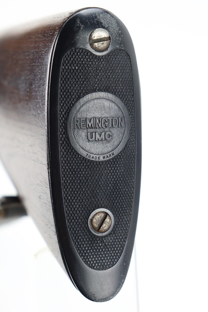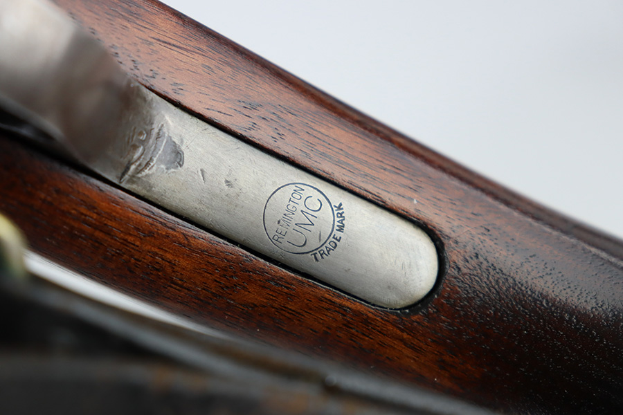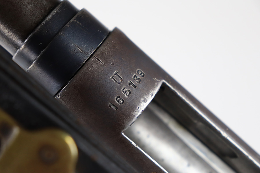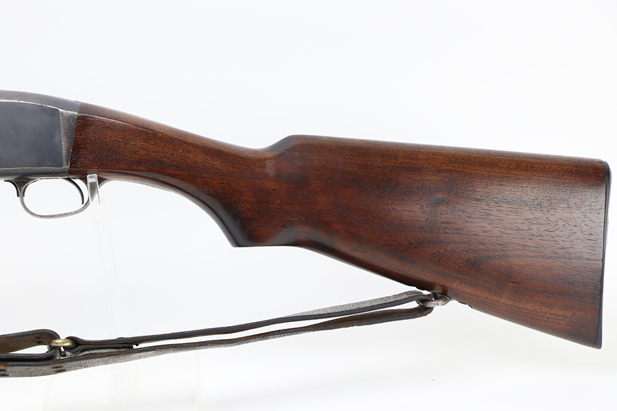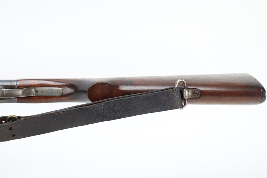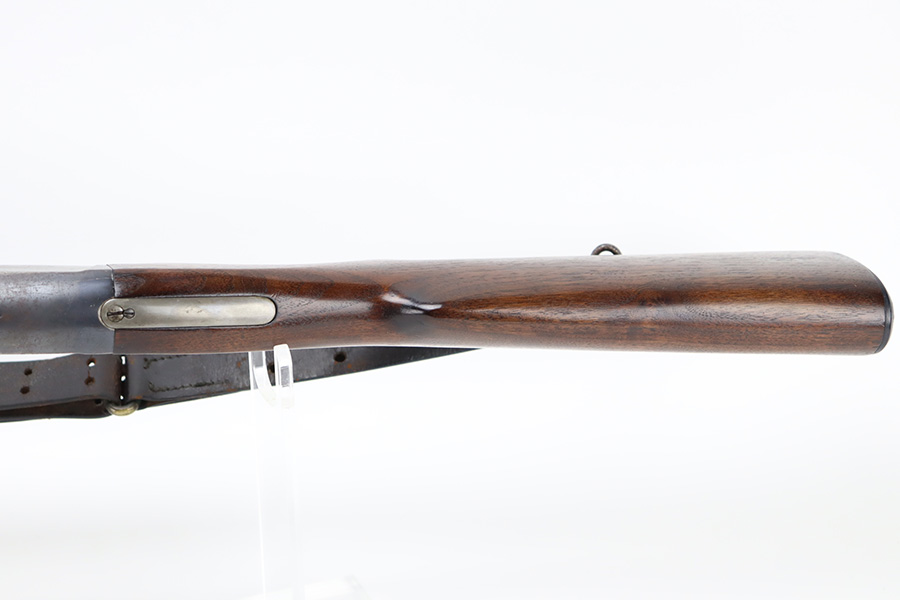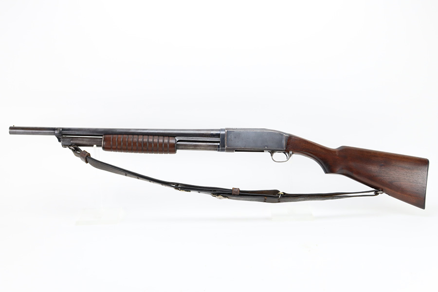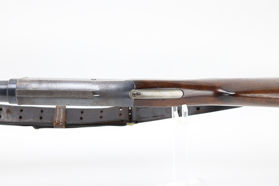 1/9/24 – This is a super rare Remington Model 10 shotgun that was issued to the U.S. military. A correct Model 10 trench is probably the rarest and hardest-to-find U.S. military shotgun from either World War. The majority of them were converted back into riot or sporting shotguns over time, as you see with this one. The proper serial range for such military examples goes from 117731-165566, so this is one of the latest produced serial numbers. The barrel shows signs of that conversion, as the military crossed out the original serial and etched the matching last four digits of the receiver on it. The receiver is marked with the flaming bomb and U.S. proof. Barrel is marked ‘Model 10’ and has the 1905 patent date. The wood furniture is unmarked and all in excellent condition. Shiny bore with only minor hints of frost. Comes with an original wartime leather sling. The bluing is original throughout, and shows some thinning, patina and surface scuffs on the receiver.
