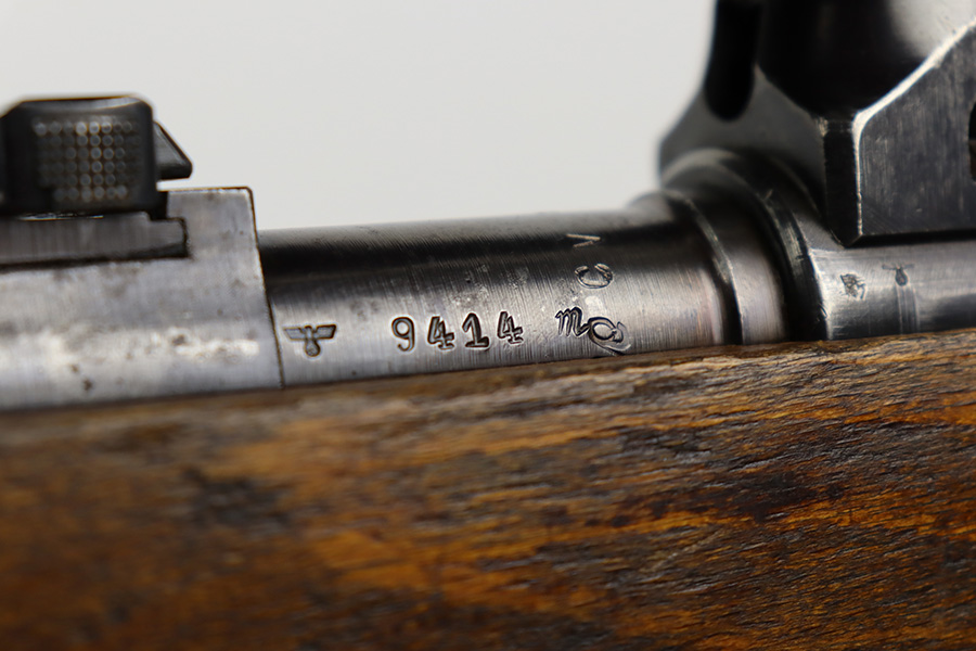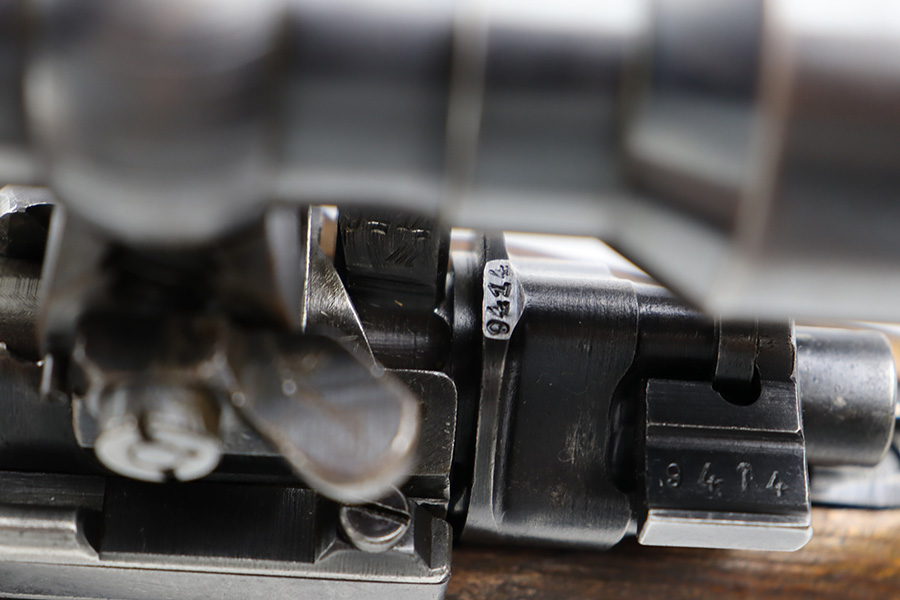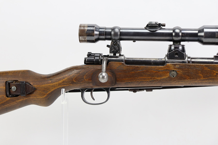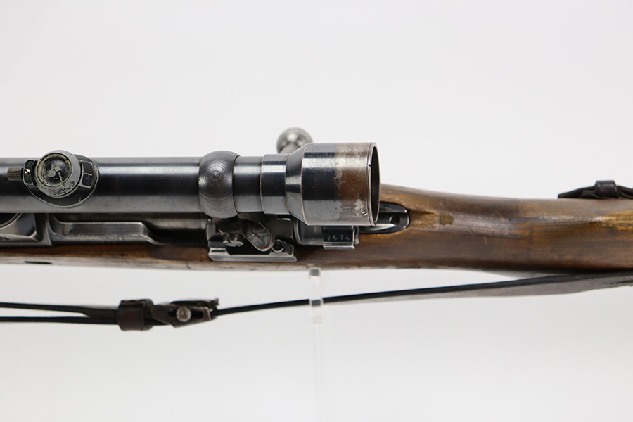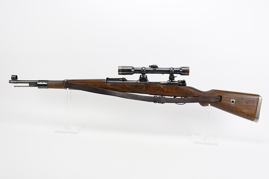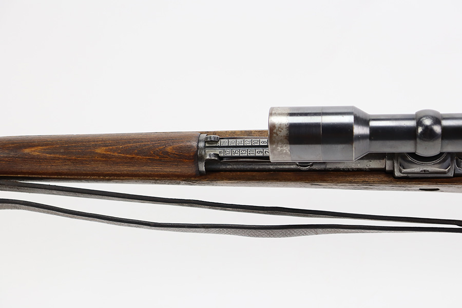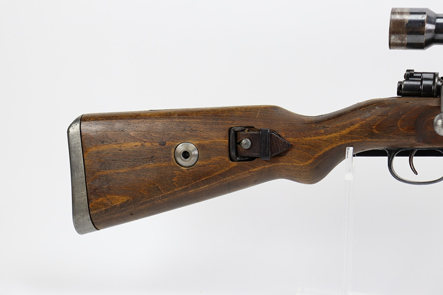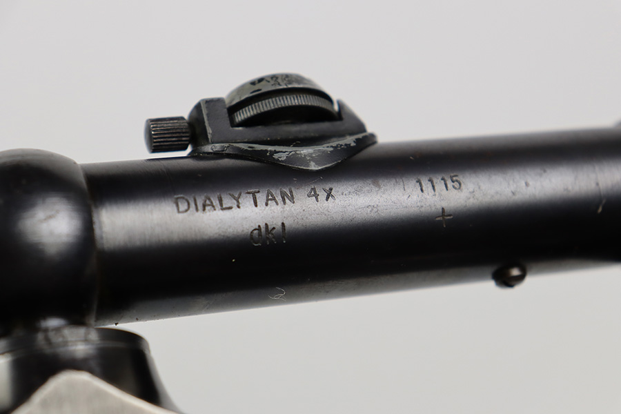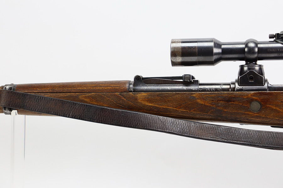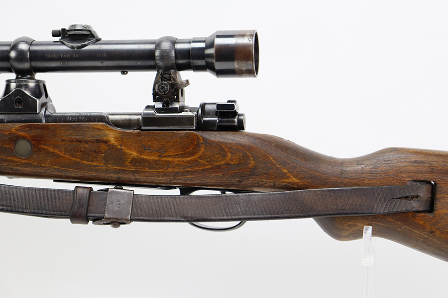 7/12/23 – This is an extremely rare, original example of a Sauer K98 High Turret sniper rifle, the first we’ve ever offered. In 1939, the Wehrmacht started a sniper program, and the turret sniper was the result of this program. In late 1943 the front base and front scope ring of the low turret was modified and thus became the high turret. The reasoning for this simplification was most certainly to produce a more cost effective, easier to produce sniper system. One of the results of this simplification was the front turret being 4mm taller. This is an original such example, with matching numbers throughout. The finish is original with minor speckling on the sides of the barrel, and minor oxidation in a few areas. Strong, shiny bore. Comes with cleaning rod, sight hood and original leather sling. The scope mount is numbered but mismatched to the rifle. The scope is an original Dialytan 4x example with ‘dkl’ marking. It shows finish loss around both front and rear hoods. The optics show a clear reticle but are a little cloudy and dirty around the edges of the viewing field. The stock has various dings and nicks, and there are a few areas showing some minor “splintering” but no cracks or structural issues. It has Heer Army marked on the right face.