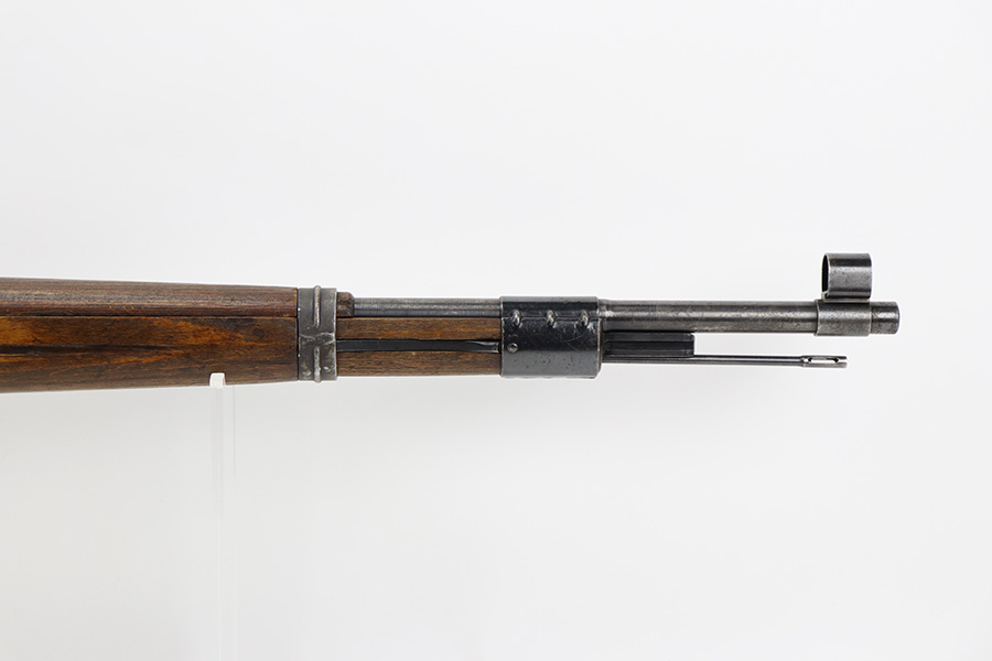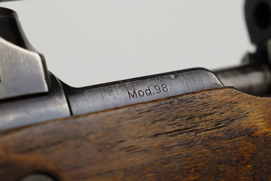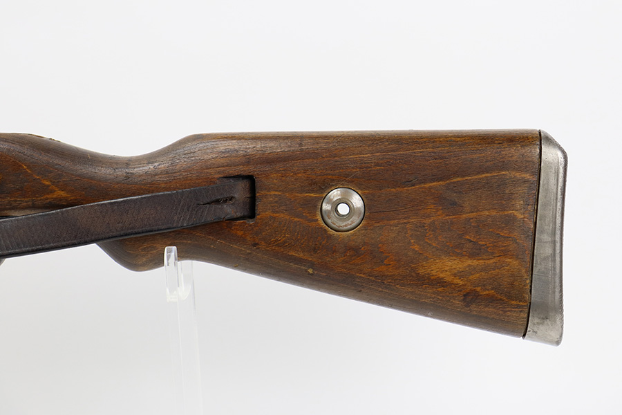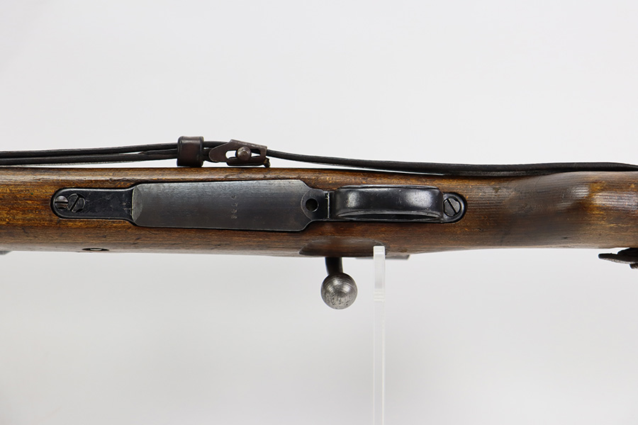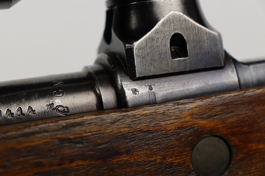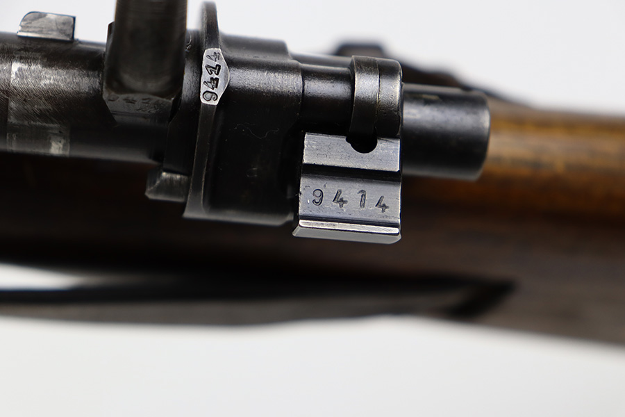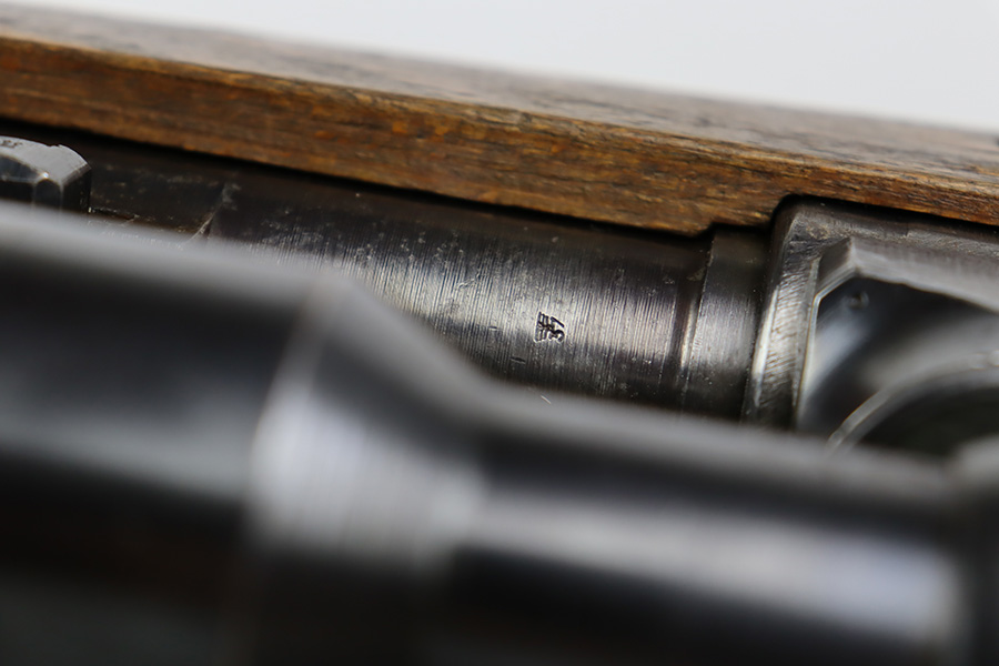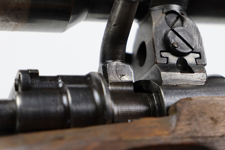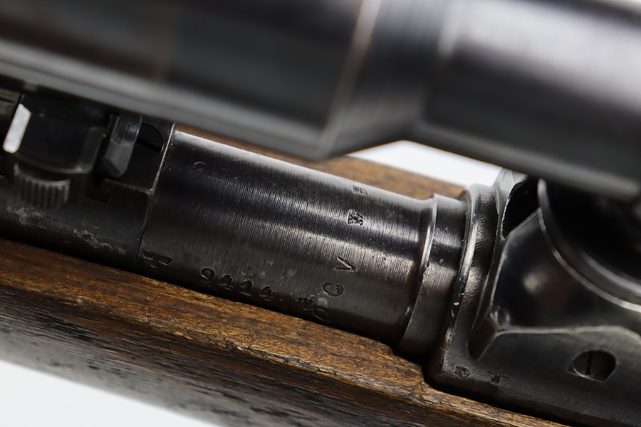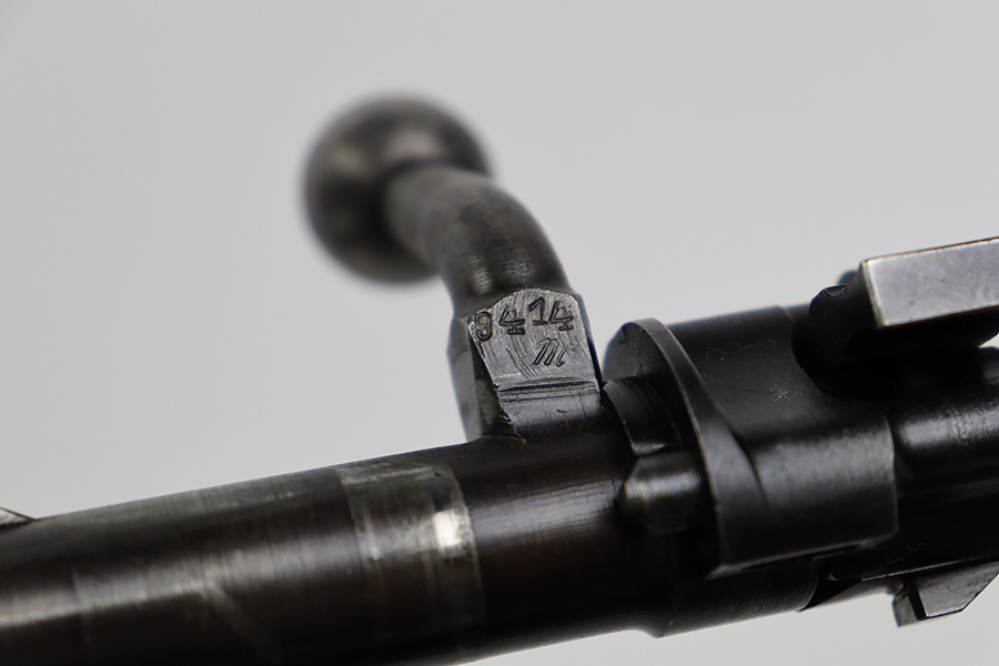7/12/23 – This is an extremely rare, original example of a Sauer K98 High Turret sniper rifle, the first we’ve ever offered. In 1939, the Wehrmacht started a sniper program, and the turret sniper was the result of this program. In late 1943 the front base and front scope ring of the low turret was modified and thus became the high turret. The reasoning for this simplification was most certainly to produce a more cost effective, easier to produce sniper system. One of the results of this simplification was the front turret being 4mm taller. This is an original such example, with matching numbers throughout. The finish is original with minor speckling on the sides of the barrel, and minor oxidation in a few areas. Strong, shiny bore. Comes with cleaning rod, sight hood and original leather sling. The scope mount is numbered but mismatched to the rifle. The scope is an original Dialytan 4x example with ‘dkl’ marking. It shows finish loss around both front and rear hoods. The optics show a clear reticle but are a little cloudy and dirty around the edges of the viewing field. The stock has various dings and nicks, and there are a few areas showing some minor “splintering” but no cracks or structural issues. It has Heer Army marked on the right face.