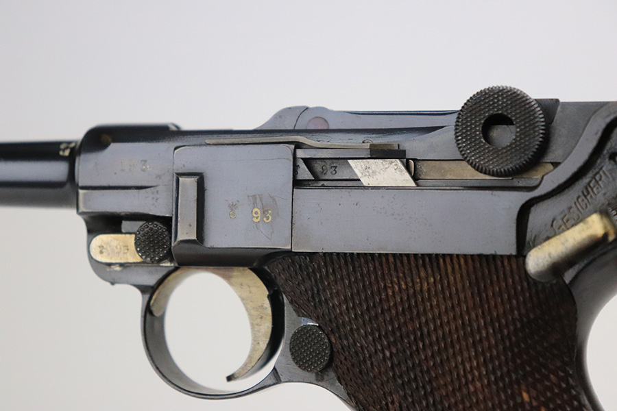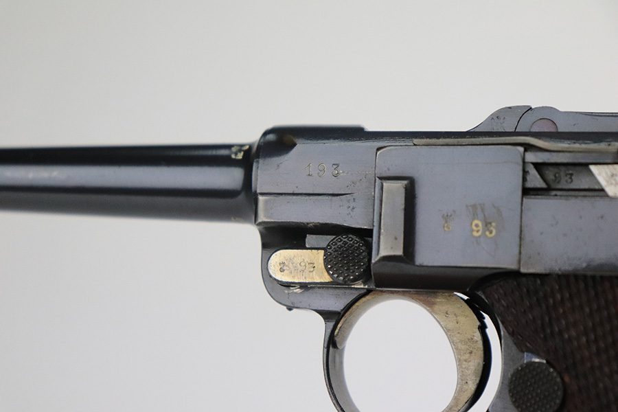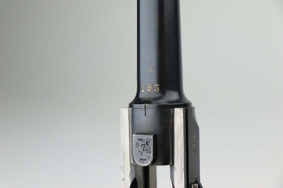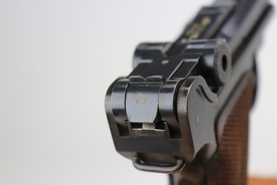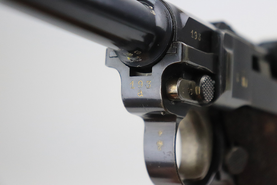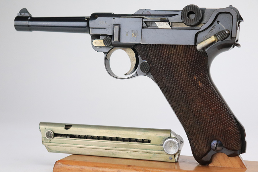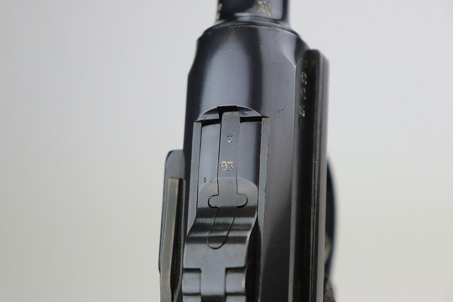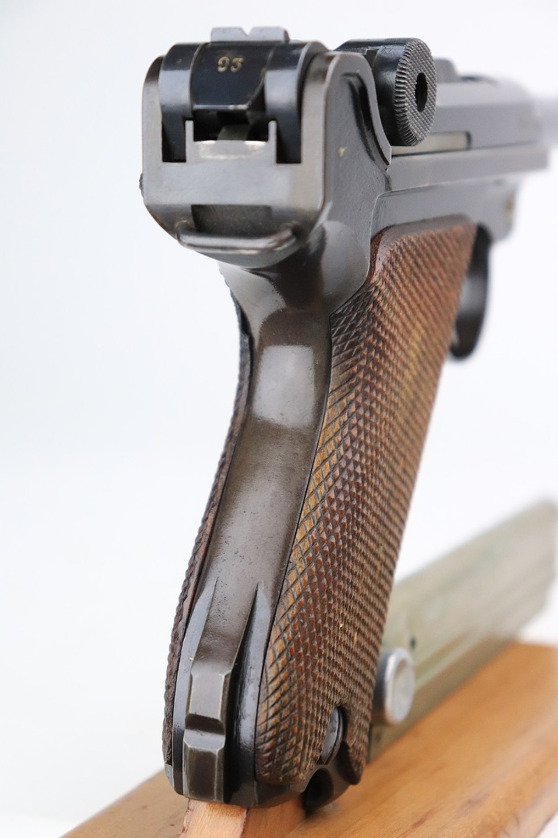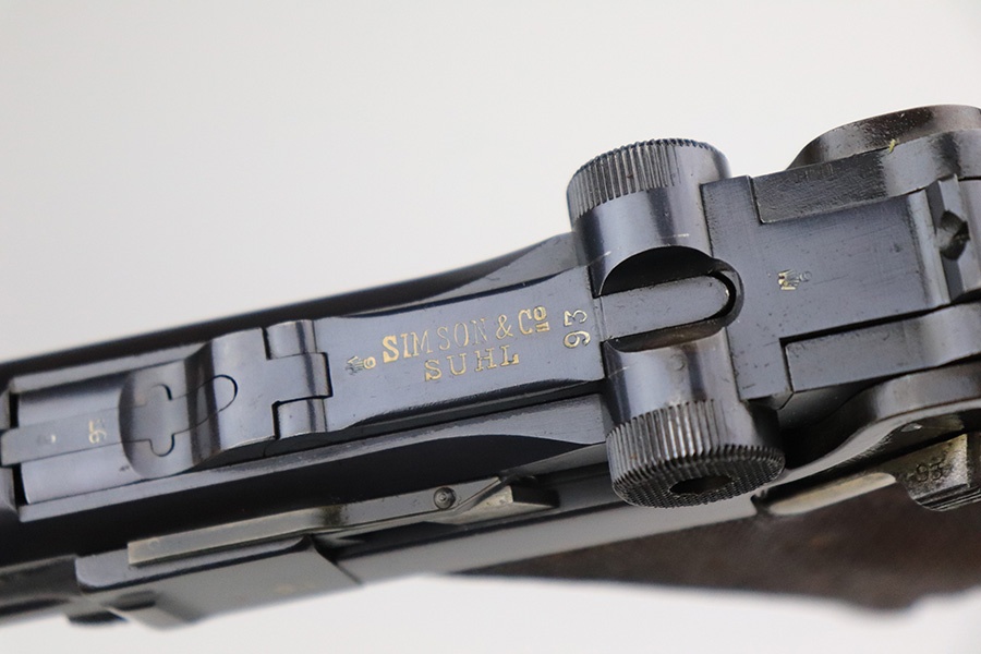6/23/22 – This is a very rare 1929 or 1930 made Simson luger that was issued to the German Police. Only about 12,000 total Simsons were made, with only about 1,000 going to the police. The pistol is all matching, has the proper Simson proofs throughout (even on both grip screws), and has an installed police sear safety. It has retained roughly 85% of its bluing. The majority of the finish loss is on the grip straps where there is also some light brown patina and spotty oxidation. Minor wear on the side plate, side rails, and around the muzzle. A few tiny scratches on the side plate. Comes with very nice wood grips – the right panel is numbered and matching, the left panel is not numbered but is “Eagle 655” proofed. Also comes with a period-correct but mismatched Simson magazine. Very nice bore with good rifling.