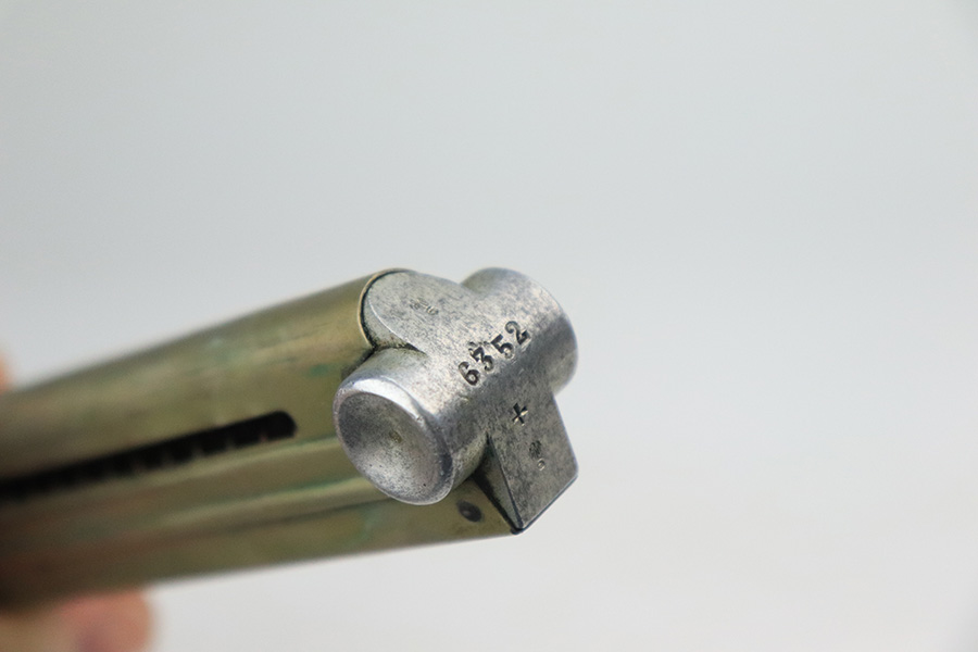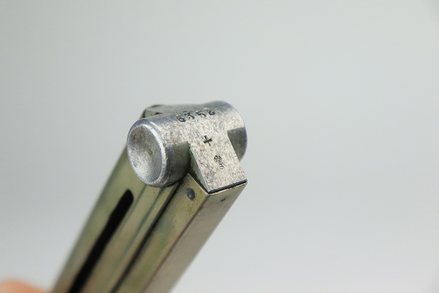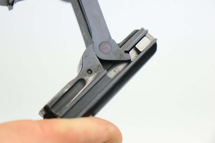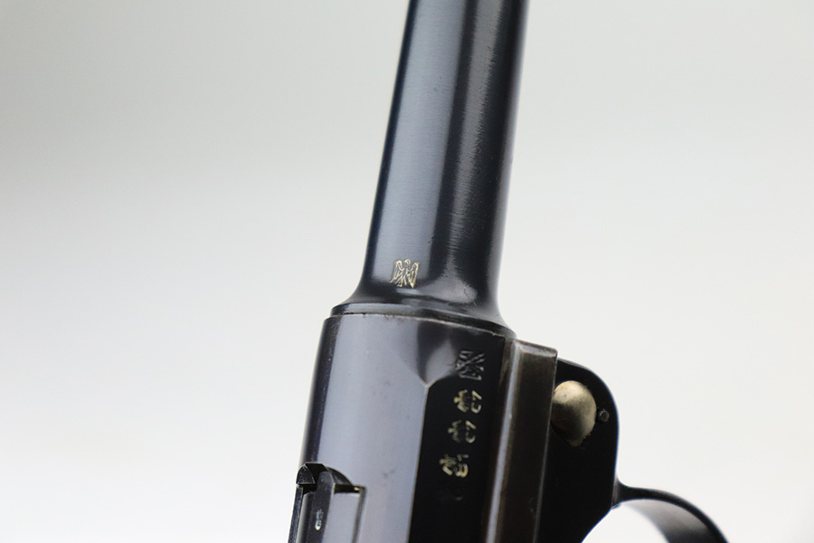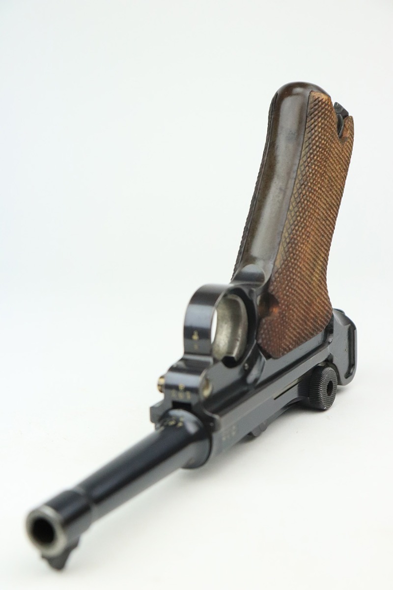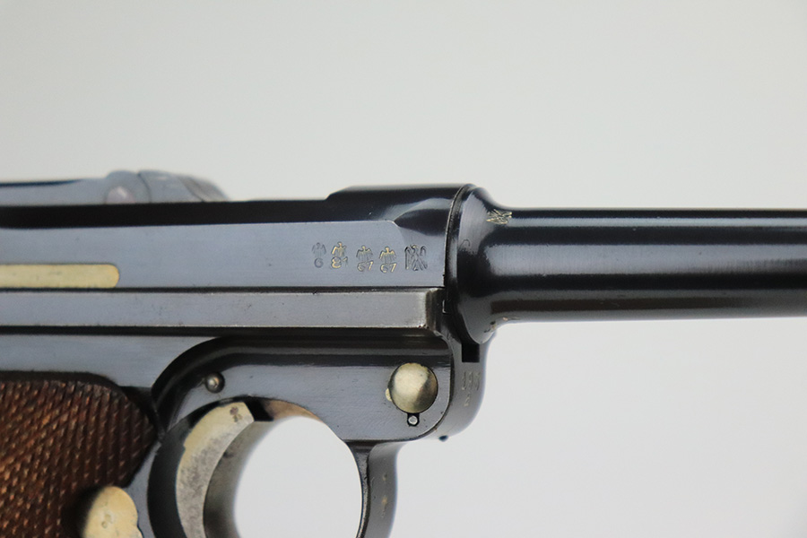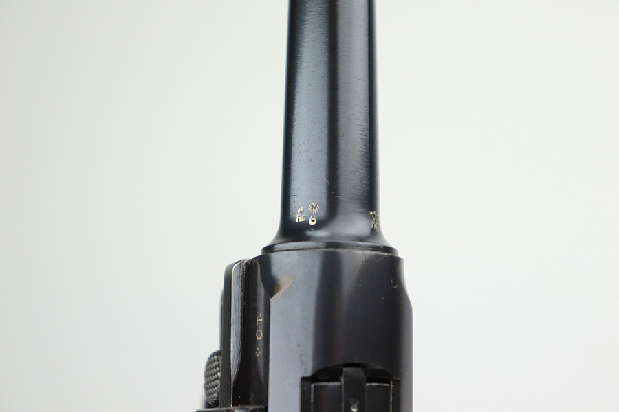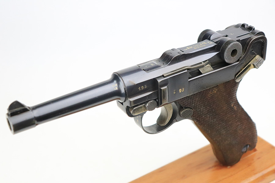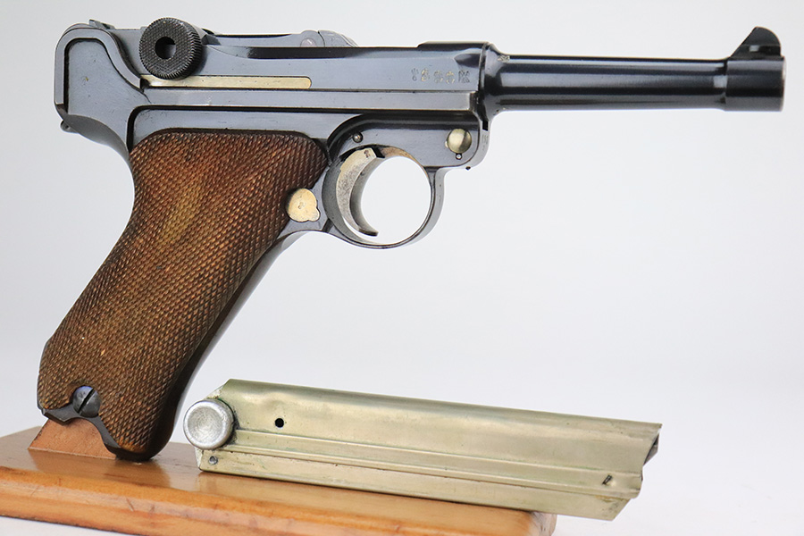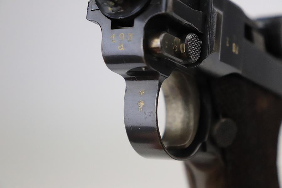 6/23/22 – This is a very rare 1929 or 1930 made Simson luger that was issued to the German Police. Only about 12,000 total Simsons were made, with only about 1,000 going to the police. The pistol is all matching, has the proper Simson proofs throughout (even on both grip screws), and has an installed police sear safety. It has retained roughly 85% of its bluing. The majority of the finish loss is on the grip straps where there is also some light brown patina and spotty oxidation. Minor wear on the side plate, side rails, and around the muzzle. A few tiny scratches on the side plate. Comes with very nice wood grips – the right panel is numbered and matching, the left panel is not numbered but is “Eagle 655” proofed. Also comes with a period-correct but mismatched Simson magazine. Very nice bore with good rifling.