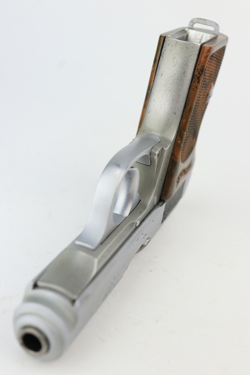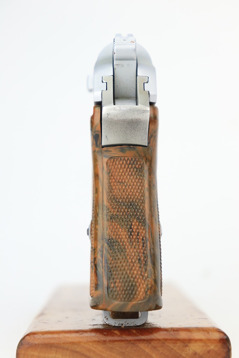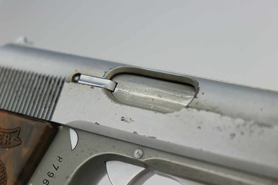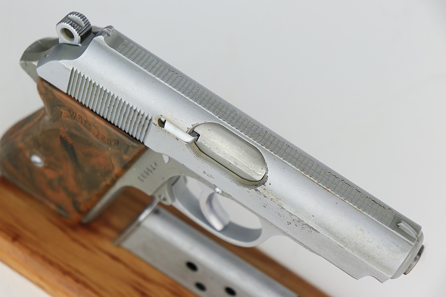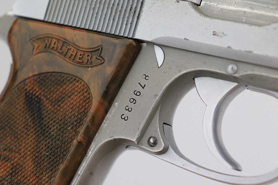 3/27/23 – This is an excellent example of a rare Walther PPK with an experimental verchromt or satin nickel finish. All matching with the proper “Crown N” proofs. This one is even rarer because it has a lightweight duraluminum frame. It has retained about 95% of its original finish. There is very minor wear on some of the high edges and around the ejection port. Some light freckling on the frame and very minor thinning on the front strap. Excellent brown Walther grip – no cracks or chips. Comes with one factory-verchromt Walther banner magazine. The bore is shiny with strong rifling, but there are some areas with tiny pits.