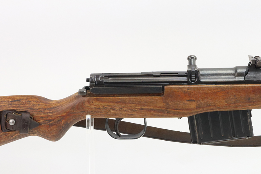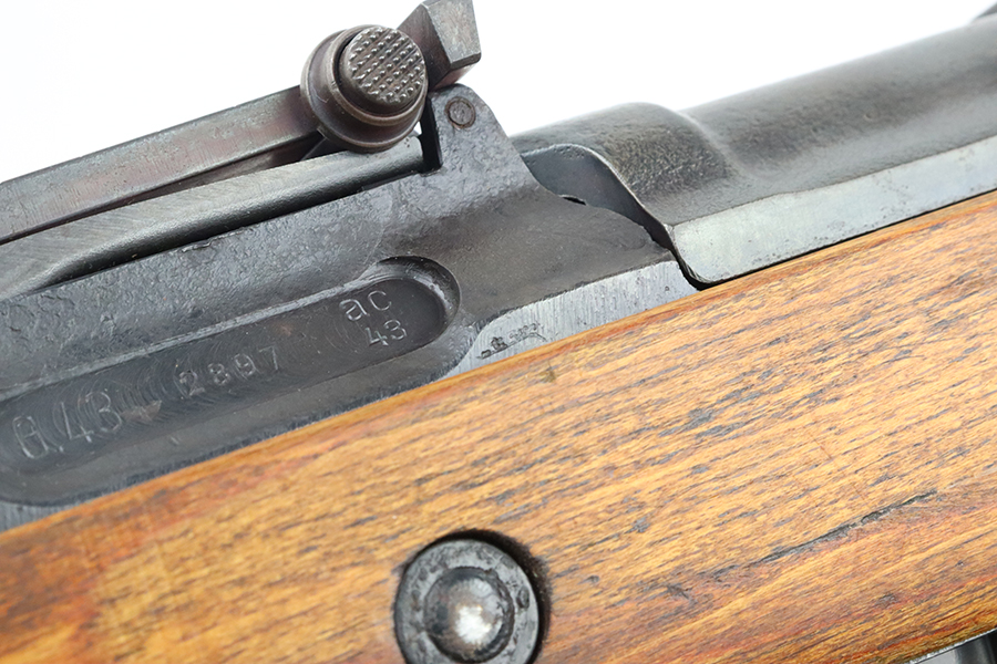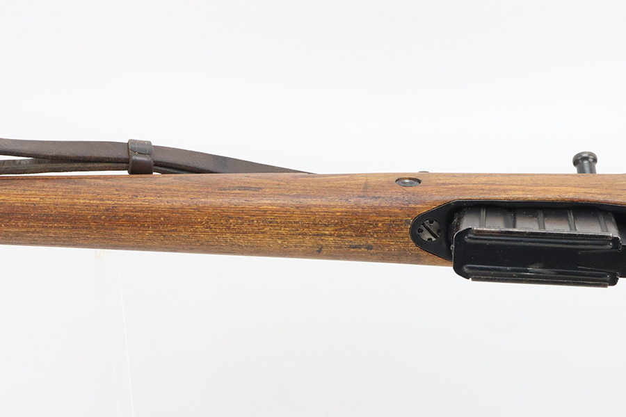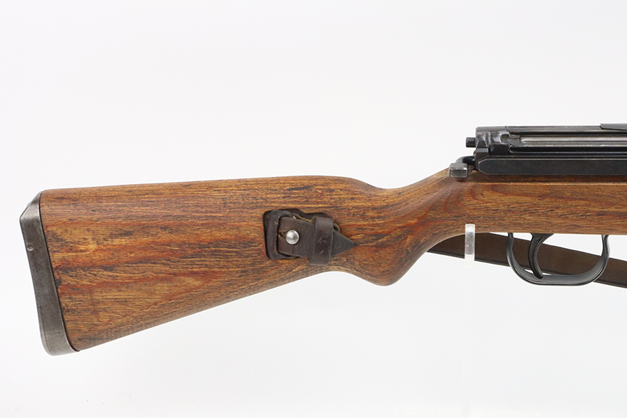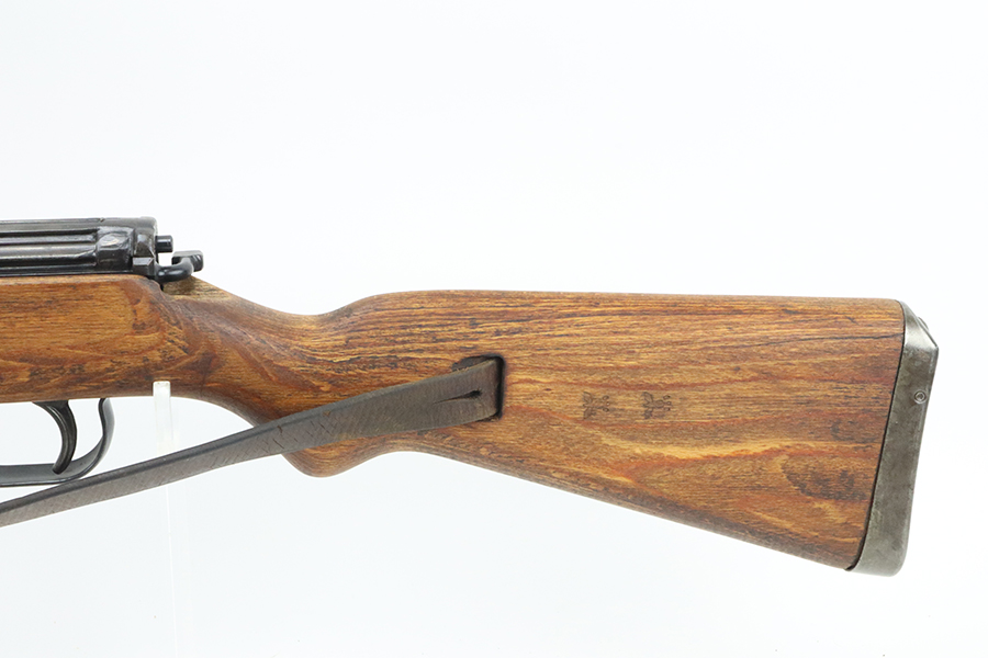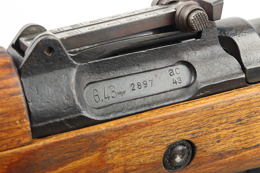 6/29/24 – This is a very rare Walther G.43 rifle with an “ac 43” code. Less than 40 documented examples. It is all matching, including the stock, and has the proper waffen proofs throughout. It has retained essentially all of its bluing, but the metal parts have been professionally refinished. It’s still a very nice looking gun. The wood is in above average condition with clear markings. Very nice bore – great rifling with just very light pin-pricking throughout. Comes with a correct magazine and a period-correct leather sling.