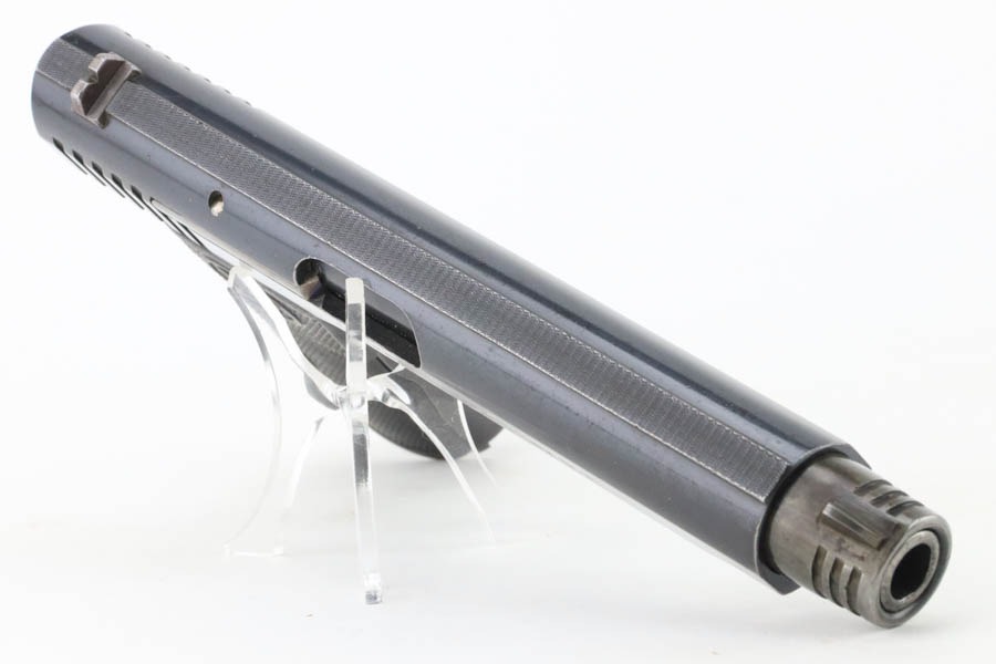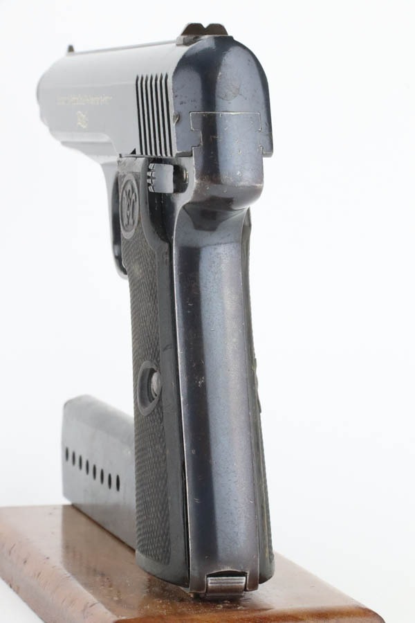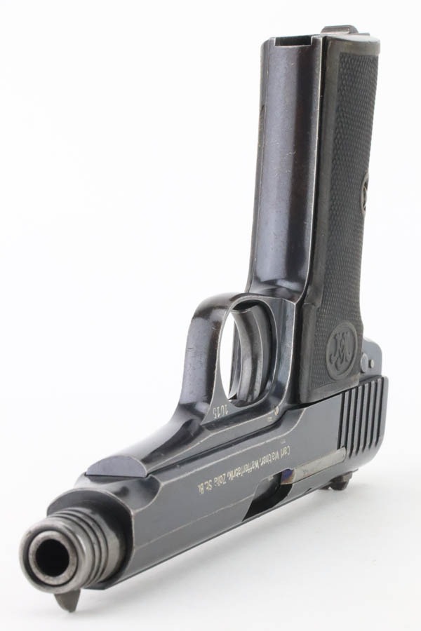 9/30/24 – This is a super rare Walther Model 6, one of only 1,000 produced. The Model 6 was an attempt by Walther to develop a service pistol for the armed forces in the standard military caliber of 9mm Luger. The design was refused due to weak mechanics, so very few were ever military accepted. Some officers did buy their own model 6 on the commercial market, and carried them as their service pistol. This particular example is all original and matching. “Germany” export marking on the left side of the slide. The consignor told us this gun was owned by Warren Buxton, premier Walther collector and author in the US. It was auctioned in 2017, along with Buxton’s entire collection by James Julia in Maine. Its original finish rates about 90% with muzzle and general high edge wear. Areas of very light spotty patina throughout with tiny dings and scratches. Fitted with period-correct grips and comes with one magazine. Very nice bore with good rifling.