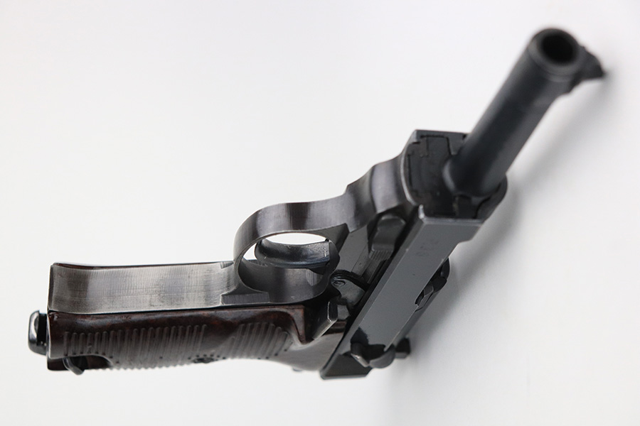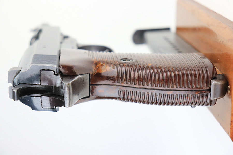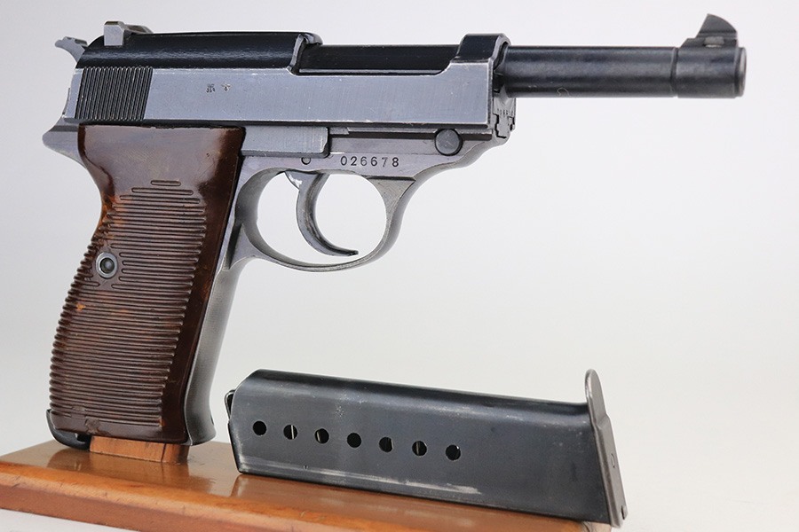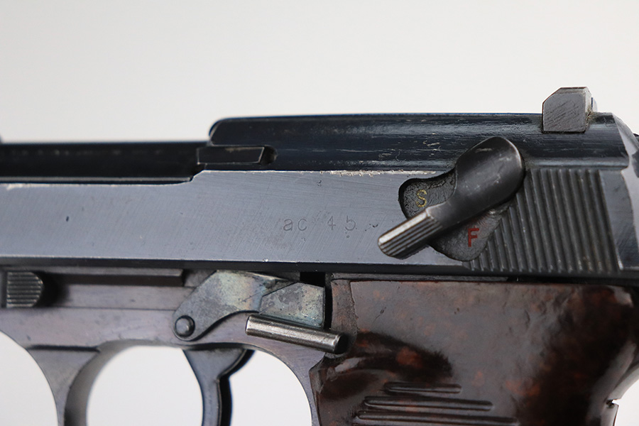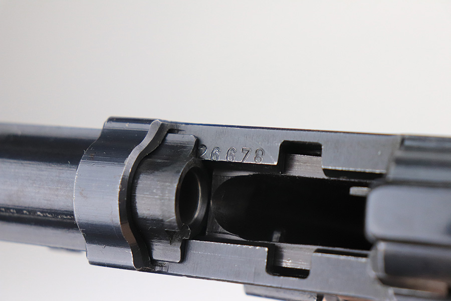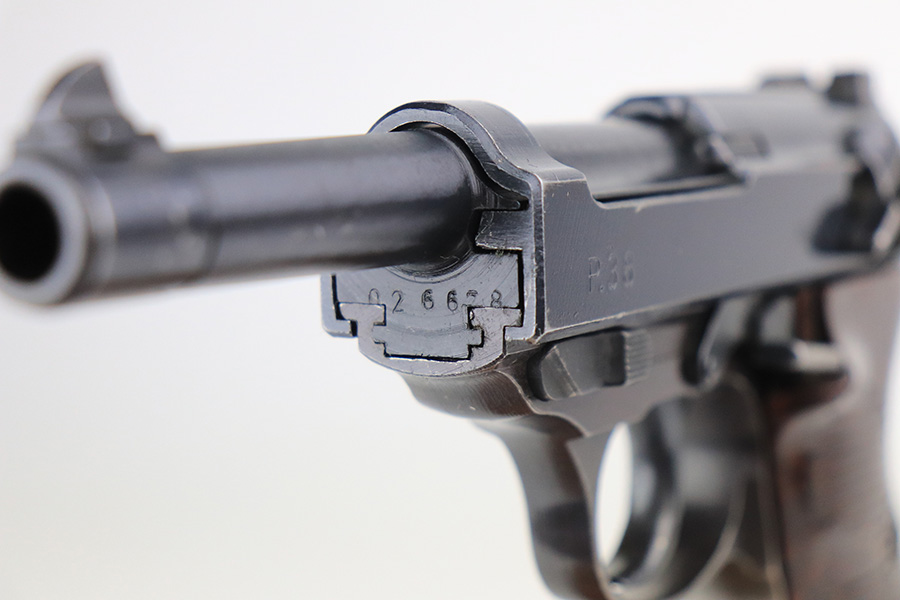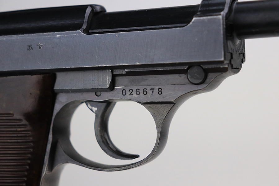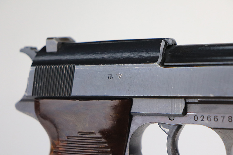 1/24/22 – This is an all matching and original example of a very rare Walther P.38 variation from 1945, one of only 1,800 produced. We’ve seen these referred to as zero series or zero-prefix Walther P.38s, but Krutzek’s P.38 book states this is the last Mod. HP variation. It features two inspection marks on the right side of the slide as it used ‘ac 45’ slides but serializing continued from where Mod. HP production ended. The zero was added to distinguish from the commercial production that preceded it. This one has a terrific profile but nearly all of the bluing loss is on the front strap. Matching numbers on slide, frame and barrel. Excellent bore. Terrific reddish grips with no notable defects. Good mechanics, including de-cocker. WaA135 marked magazine.