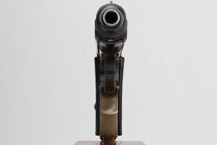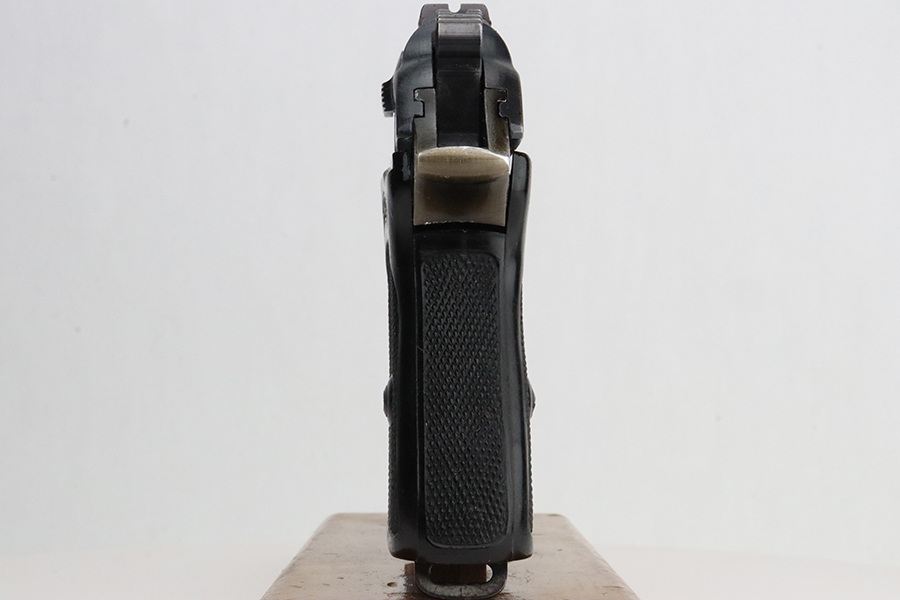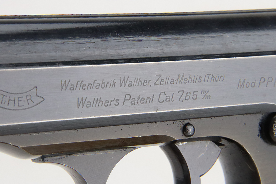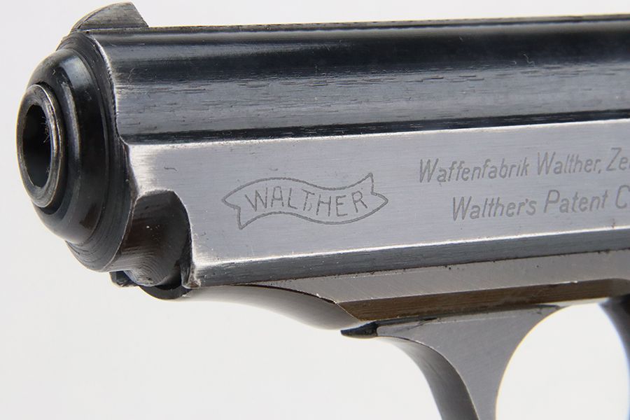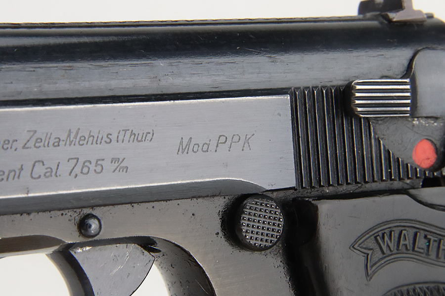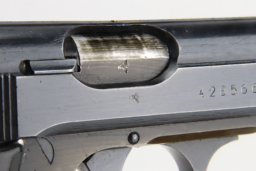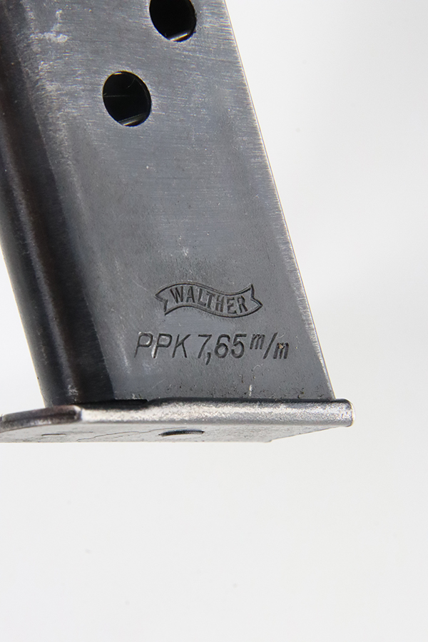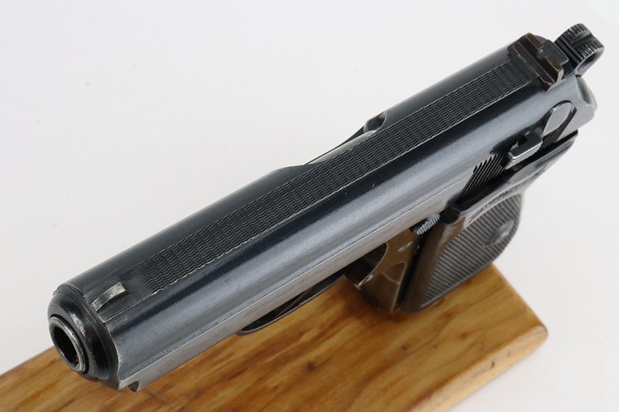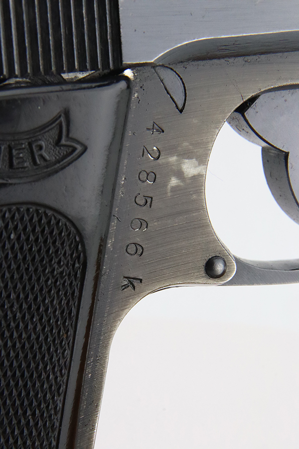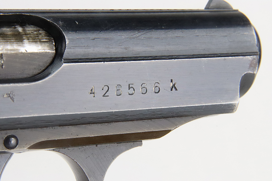 3/1/24 – This is a very rare Walther PPK from 1944 with Police Eagle/F acceptance stamp, one of only 1,500 produced! All matching and original, these were all produced with lightweight duraluminum frame. The slide shows excellent bluing with only minor wear around the muzzle. The front strap shows a small patch of wear, and the generally thinner anodized finish found on the aluminum frame PPKs. Excellent, shiny bore. Wartime mag. Nice black grip with no major issues.
