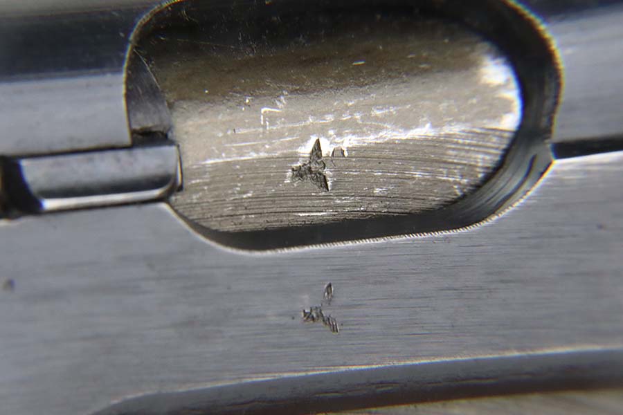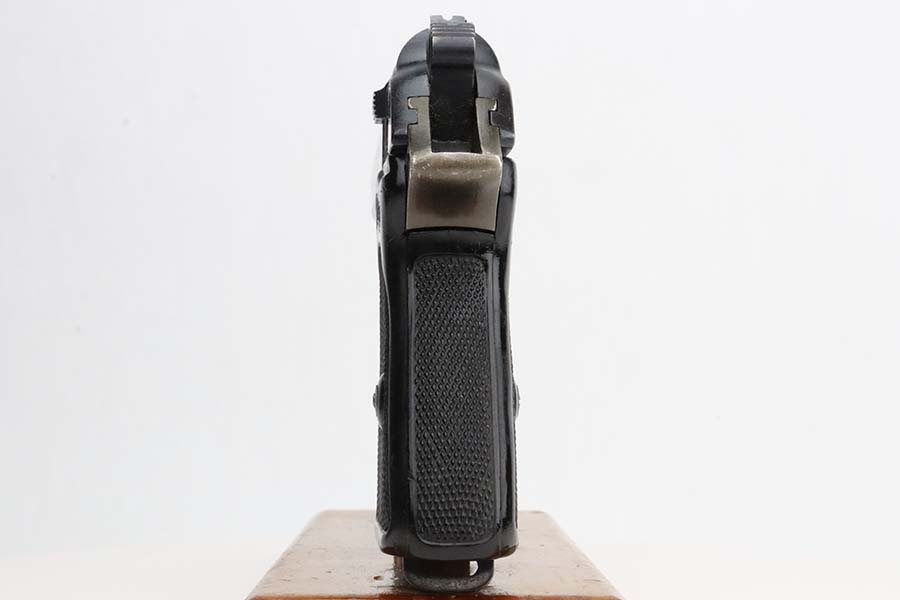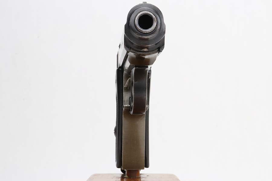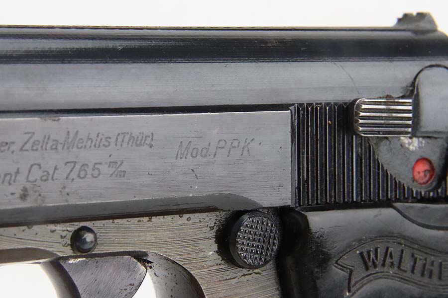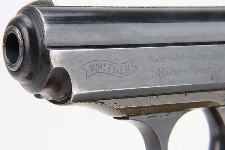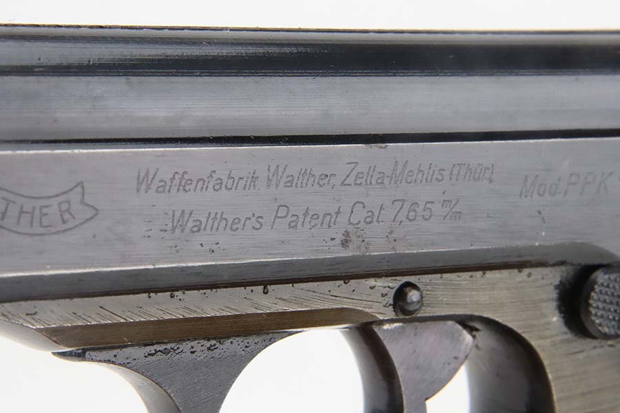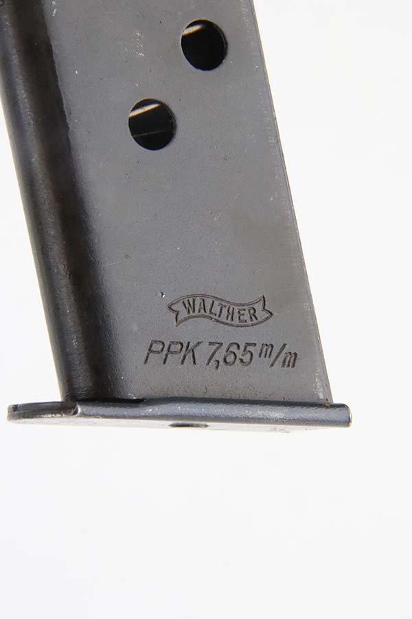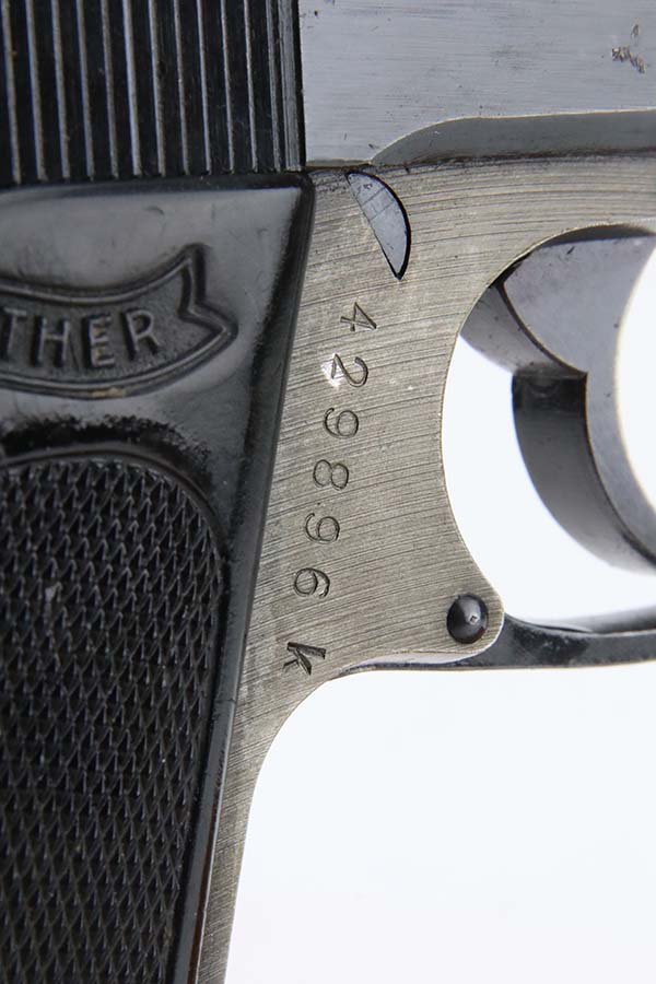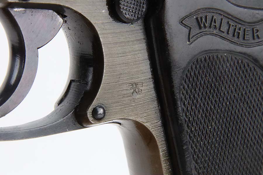 3/4/24 – This is a very rare Walther PPK from 1944 with Police Eagle/F acceptance stamp, one of only 1,500 produced! All matching and original, these were all produced with lightweight duraluminum frame. The slide shows excellent bluing with only minor wear around the muzzle. Generally thinner anodized finish found on the aluminum frame PPKs. Excellent, shiny bore. Wartime mag. Nice black grip with no major issues.