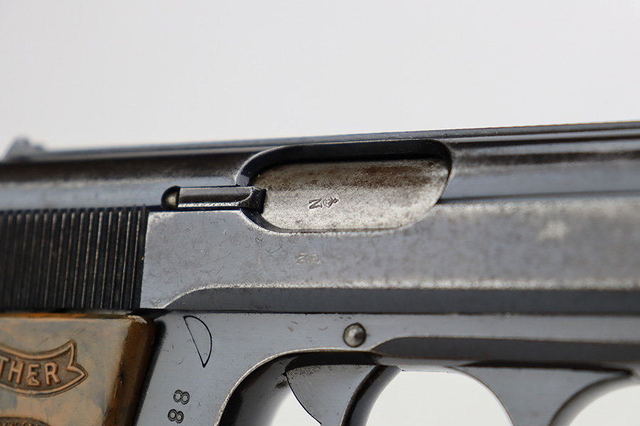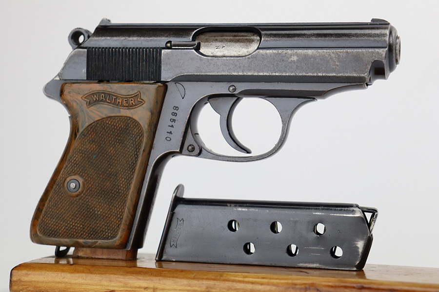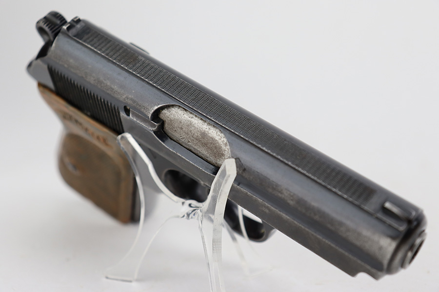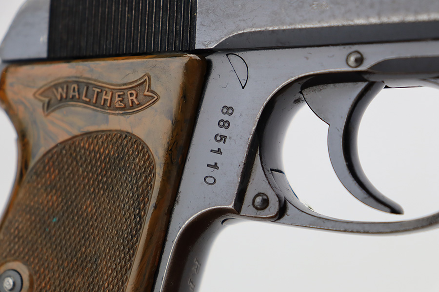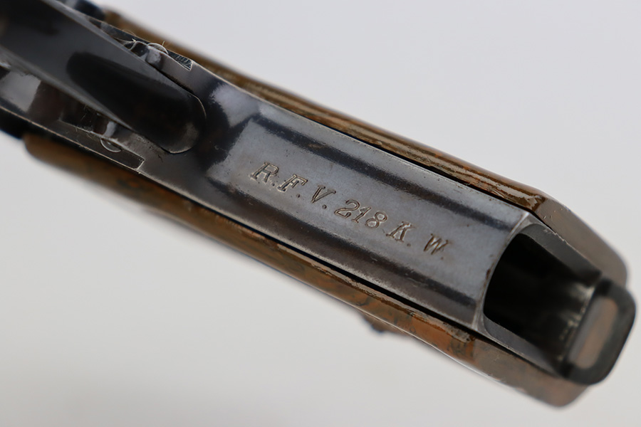 7/11/23 – This is a very rare Walther PPK that was issued to the R.F.V. in 1935. There were fewer than 1,000 RFV-marked PPK’s produced. All matching with an “R.F.V. 218 K.W.” marking on the front strap. It has retained roughly 75-80% of its original bluing with obvious wear and pin-pricking along both sides of the slide. Fitted with an excellent brown Walther grip – no cracks or chips. Comes with a proper Walther banner-only magazine. Mint bore.
