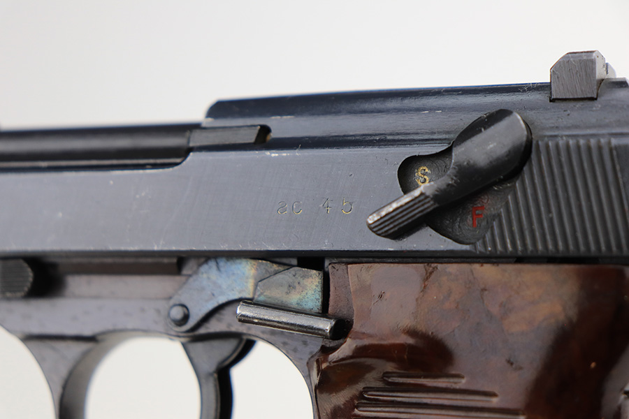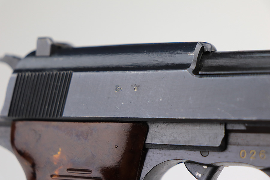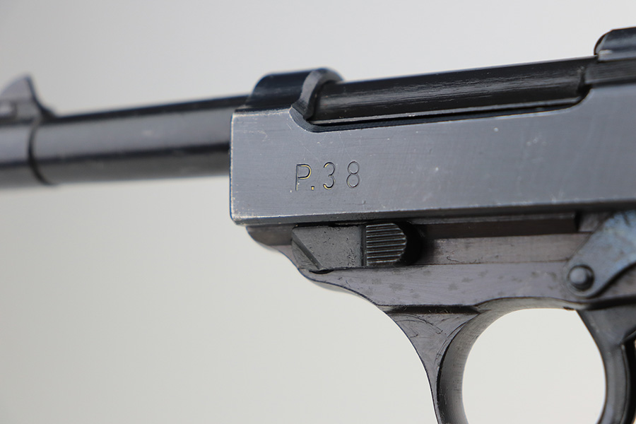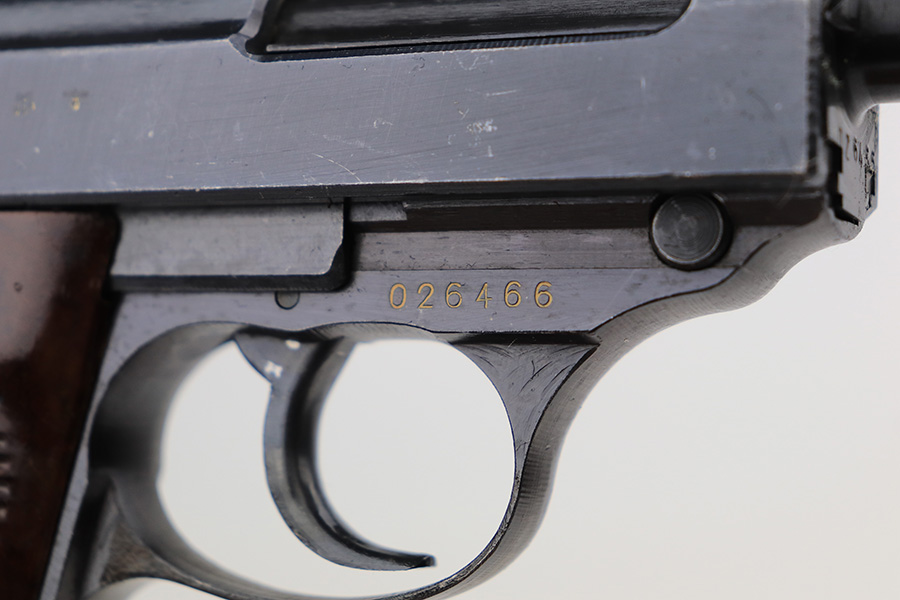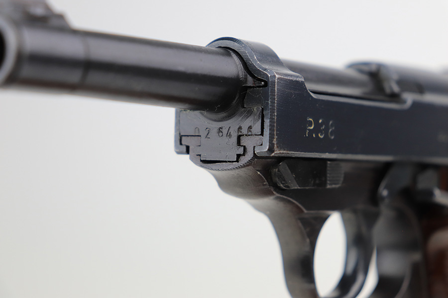 3/3/22 – This is an all matching and original example of a very rare Walther P.38 variation from 1945, one of only 1,800 produced. We’ve seen these referred to as zero series or zero-prefix Walther P.38s, but Krutzek’s P.38 book states this is the last Mod. HP variation. It features two inspection marks on the right side of the slide as it used ‘ac 45’ slides but serializing continued from where Mod. HP production ended. The zero was added to distinguish from the commercial production that preceded it. The pistol is in excellent condition, with about 98% of the original blue remaining. Just a small spot of wear on the barrel, and another on the front strap. Mint bore and grips, hardly looks used. The front strap does have the very common casting flaw seen on many late-war P.38s.