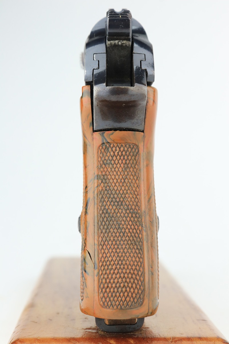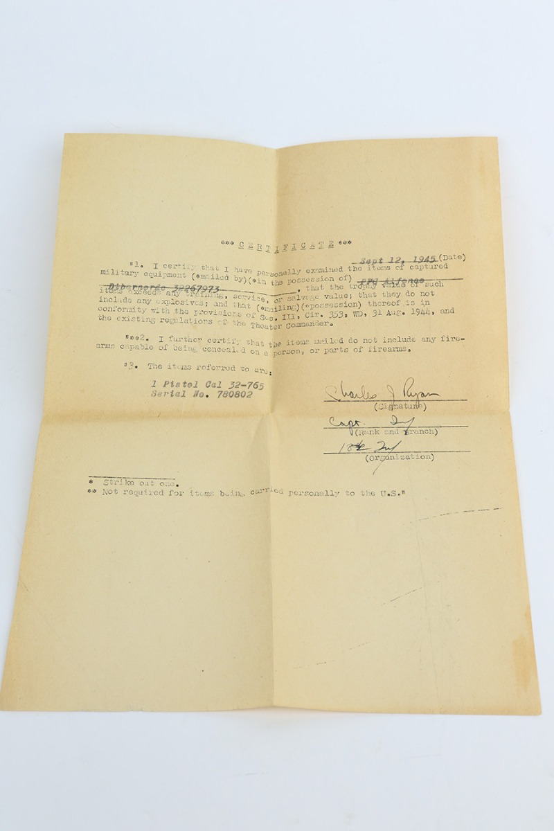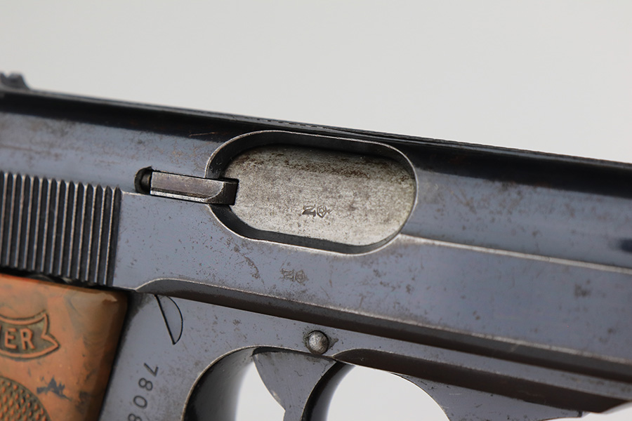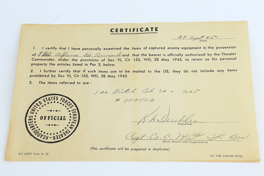 2/11/23 – This one comes to us from a family member of the vet that brought it back, PFC Alfonso Di Bernardo. It’s a commercial Walther PPK from 1933 with original bluing and parts. There’s high edge wear on the slide and more finish loss on the grip frame, but also shows notable patina and oxidation in a few areas. Excellent grip with just a very small hairline crack on the underside. Terrific bore. Proper mechanics, including the de-cocker.
