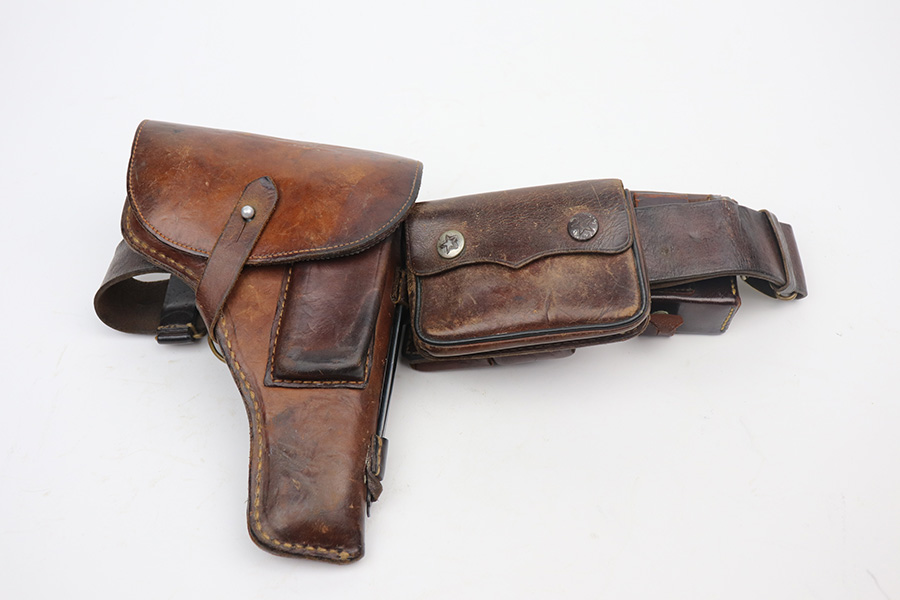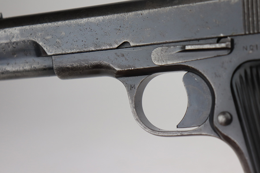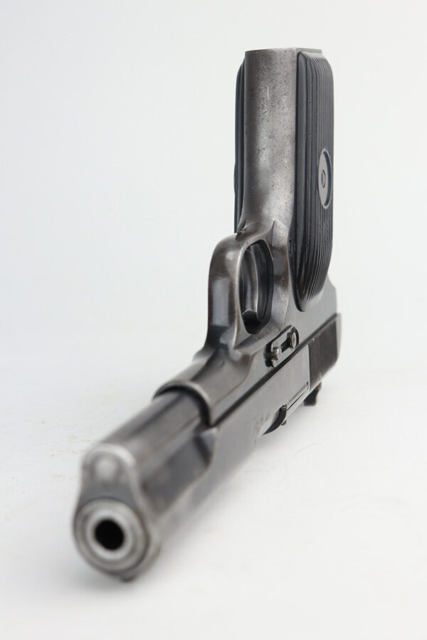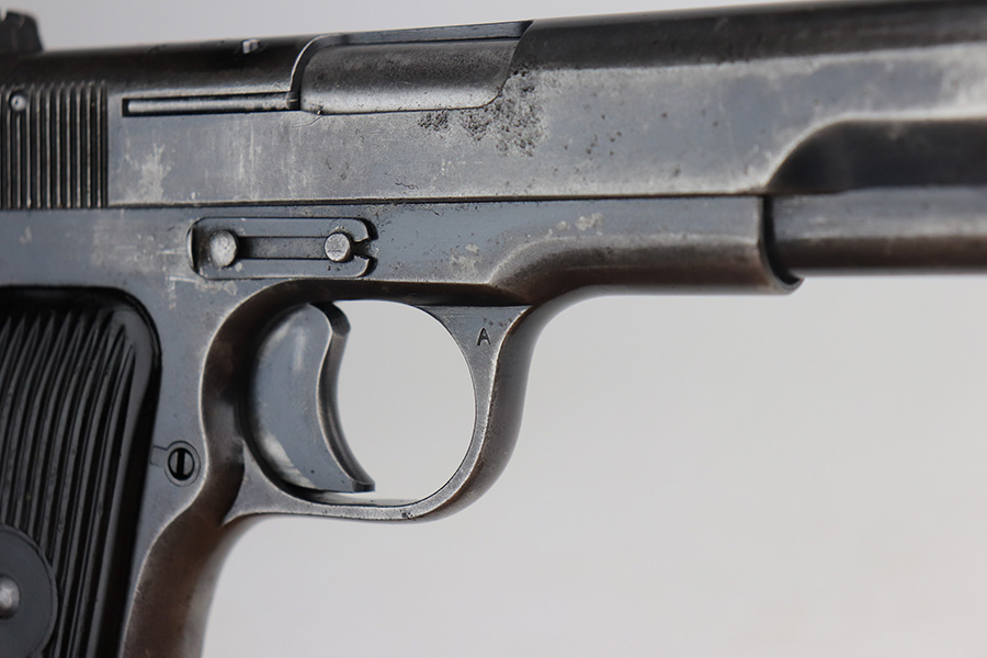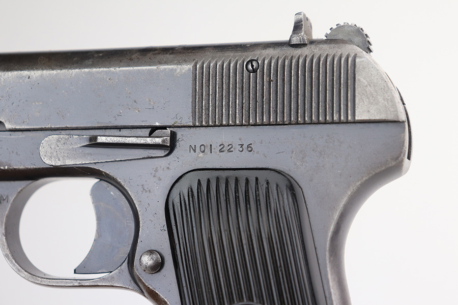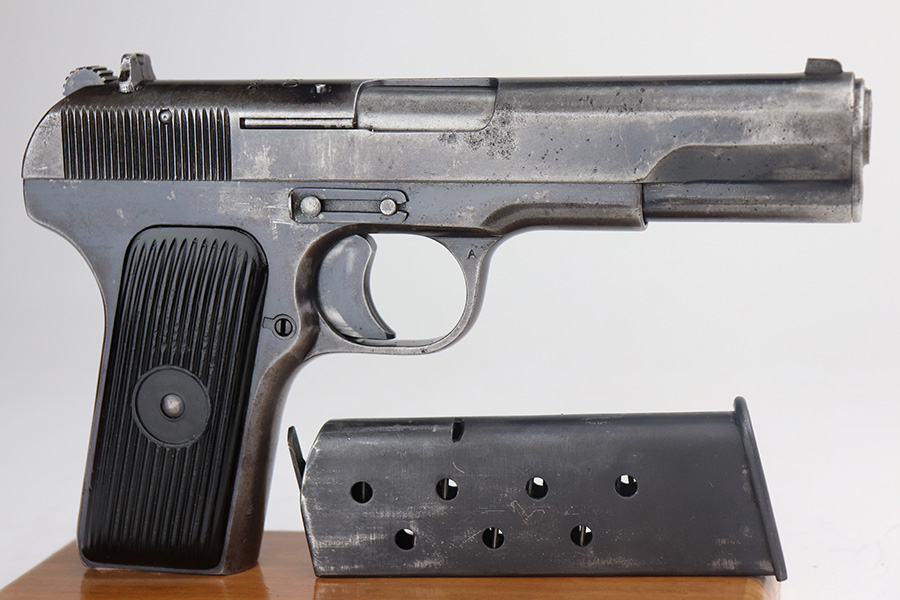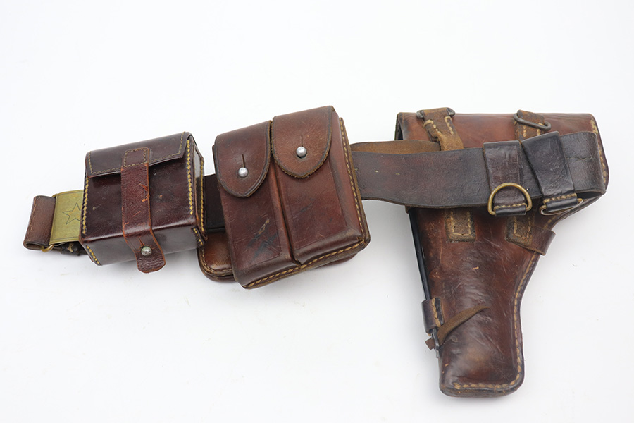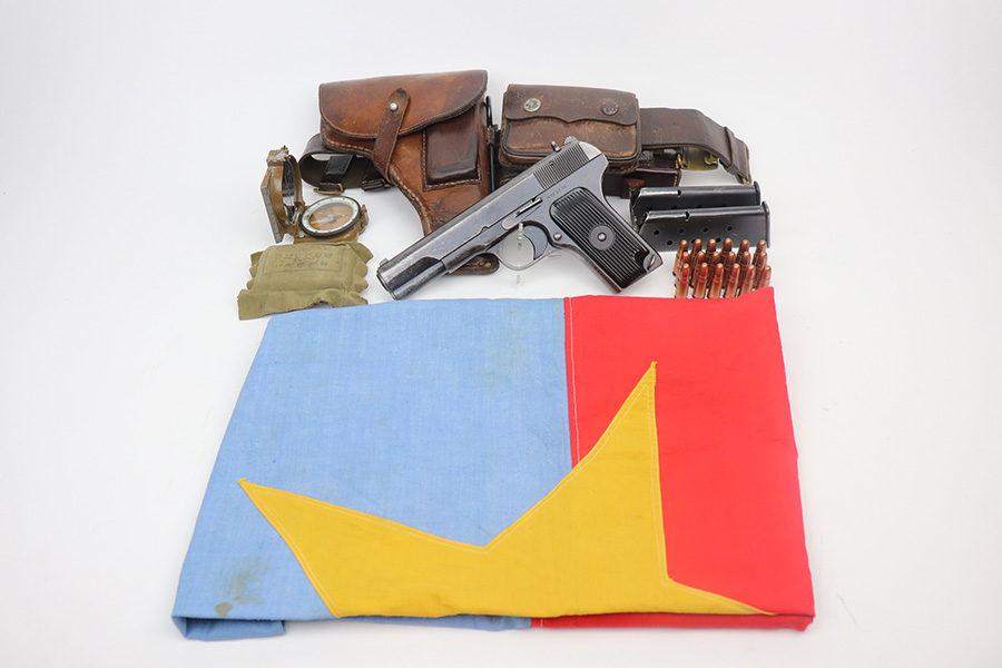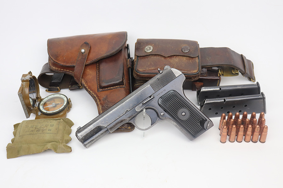 6/21/21 – This is a nice assembly of a Vietnam War-Era Chinese Tokarev M20 with extras. The M20 was a version of the Type 54 made without factory markings to conceal the weapon’s origins. Many of these were provided to Vietnamese forces during the Vietnam War. This one comes with a captured Viet Cong flag, original holster, original belt, magazine pouch, field medic kit, 1955-dated Chinese field compass and mirror, cleaning rod, about 20-rds of modern 7.63 ammunition, and two period-correct magazines. The gun is all matching and has retained about 60% of its original finish with spotty wear and minor pitting throughout. Excellent grips. Excellent bore – shiny with strong rifling.