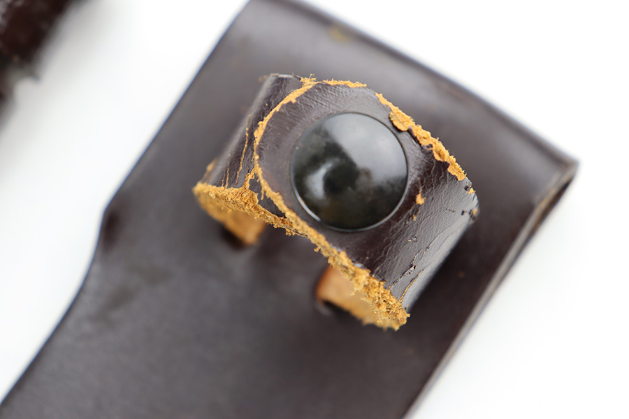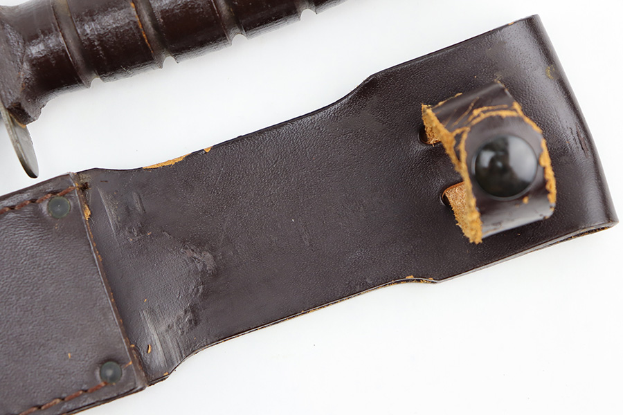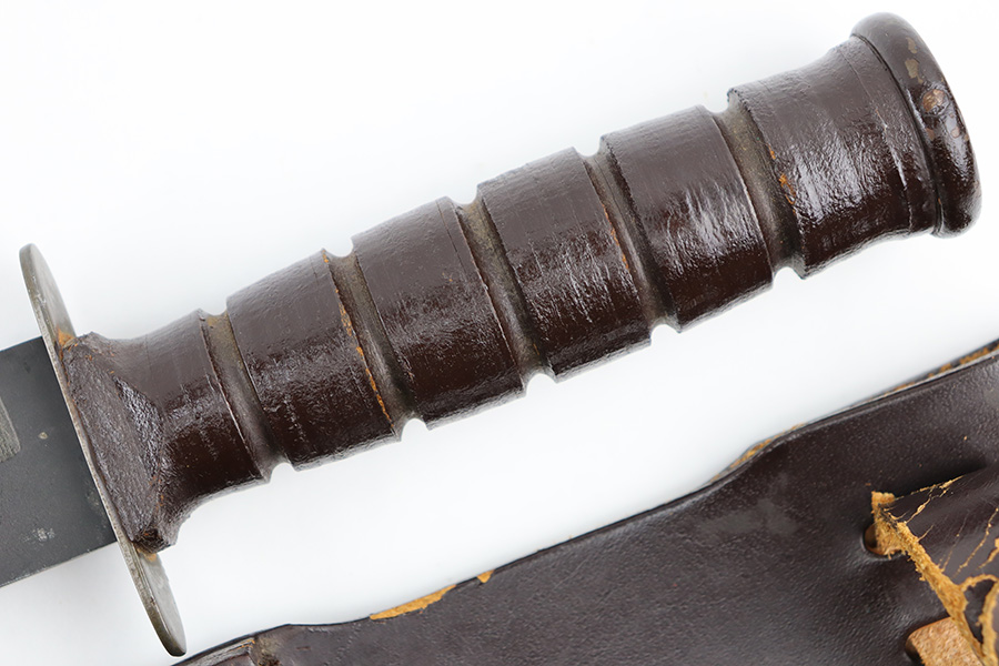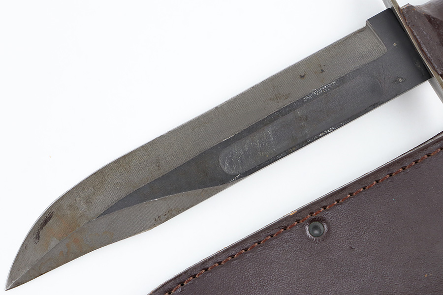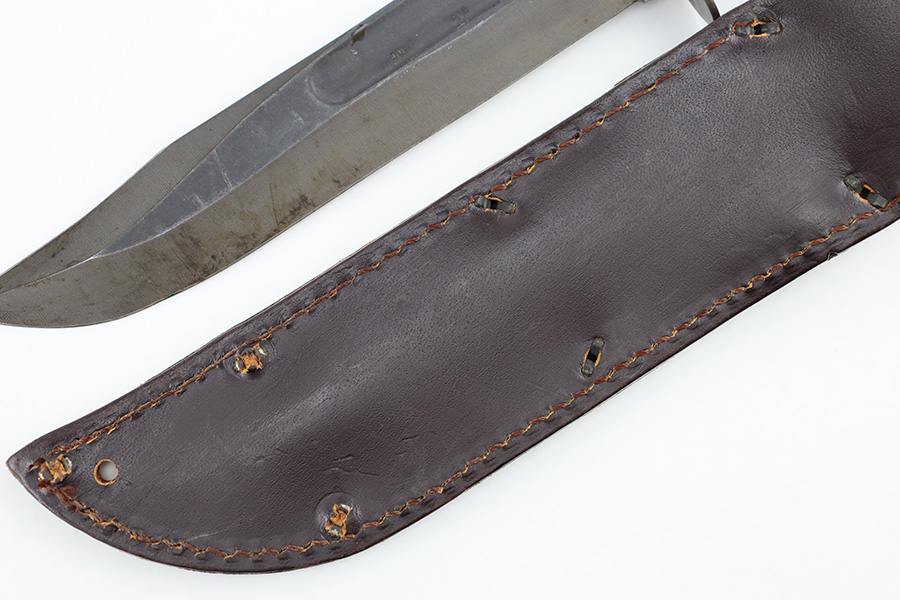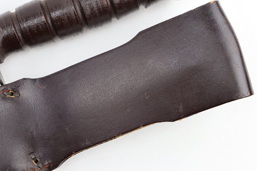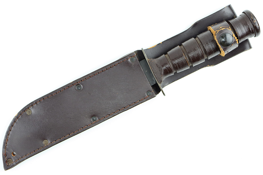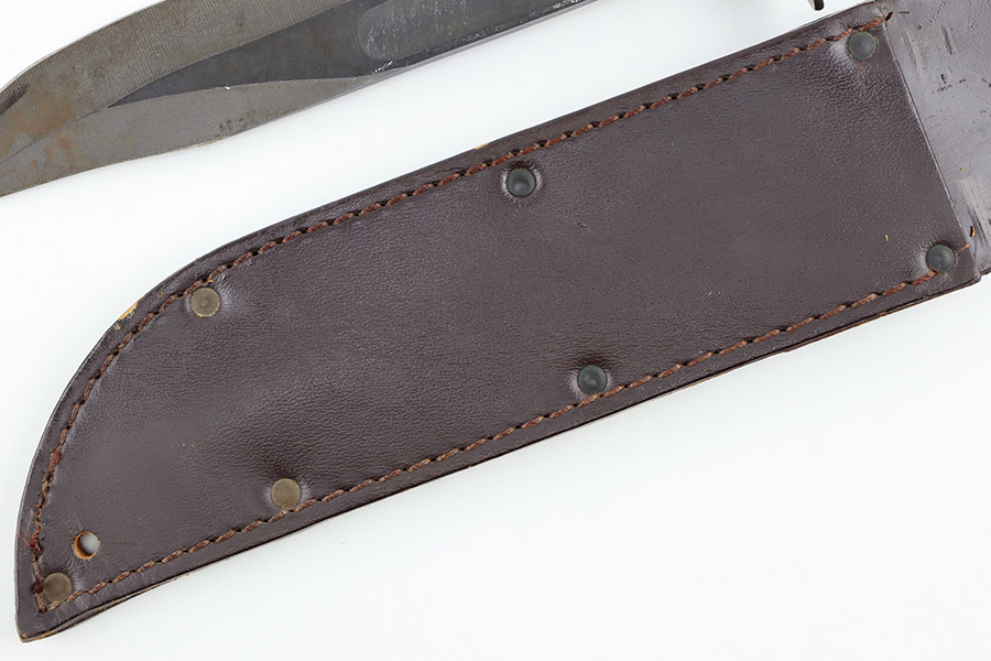8/30/23 – This is an original Camillus MK 2 fighting and utility knife from the Vietnam era. The knife is in great overall condition with some mild surface patina and light wear on the blade, but no major issues and a clean edge. The base of the blade is maker stamped as shown. The dark brown leather handle is excellent and tight. Comes with an original leather sheath that’s in great condition with no markings or stamps. The closure loop on the sheath has some mild cracking but is still intact.
