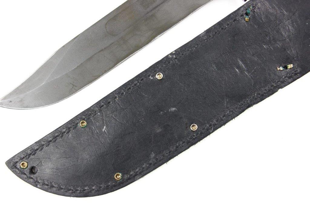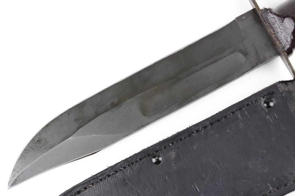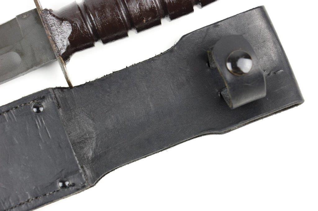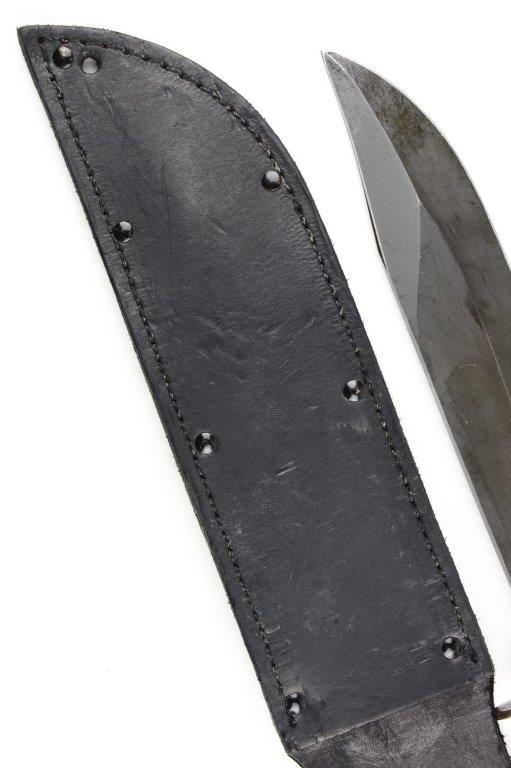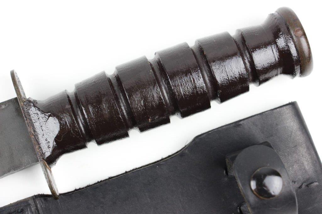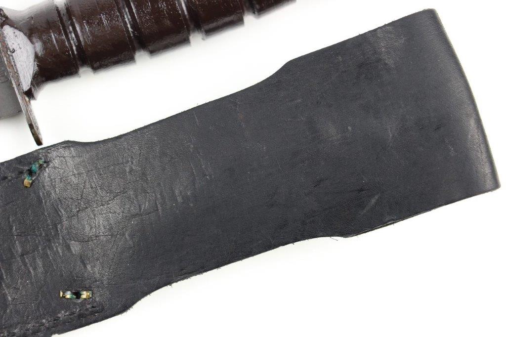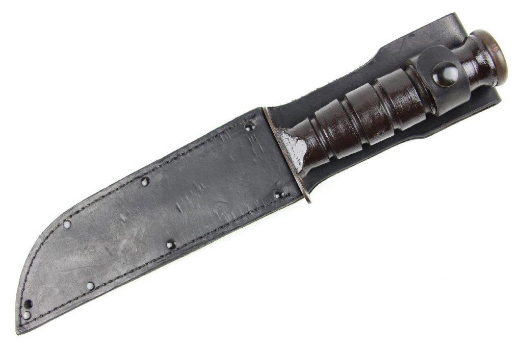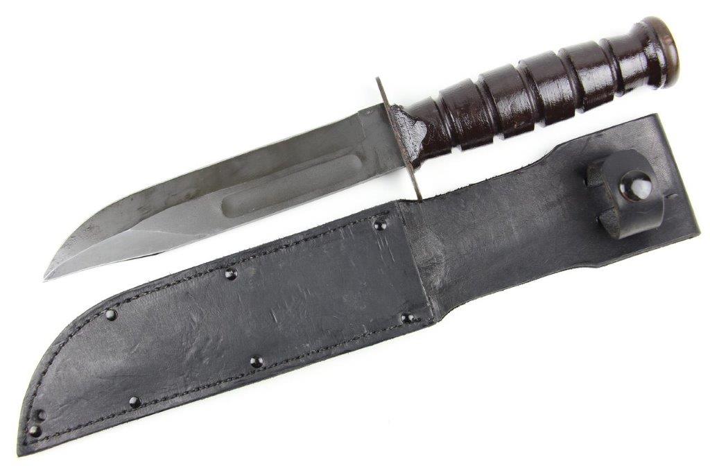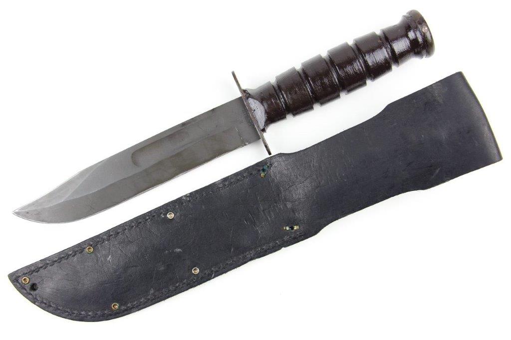 3/25/24 – This is an original Vietnam era Camillus MK 2 (KA-BAR) style knife. Excellent condition with a parkerized blade maker stamped on the base. The edge is clean and professionally sharpened. Excellent black leather handle is tight throughout. Comes with an black leather sheath as well, which is unmarked and equally excellent.
