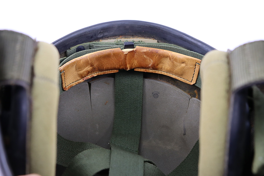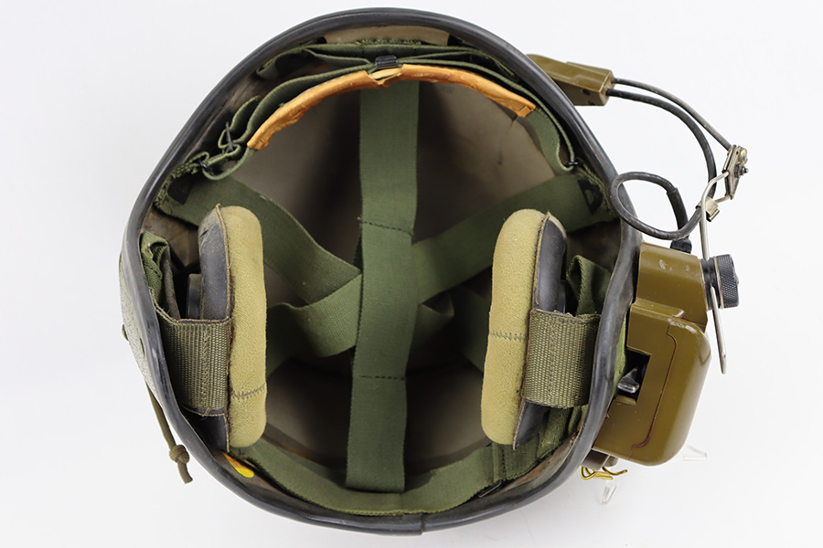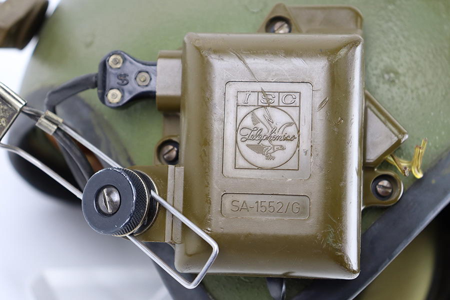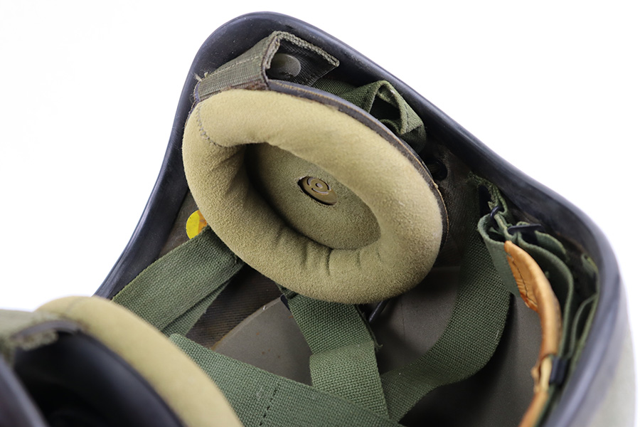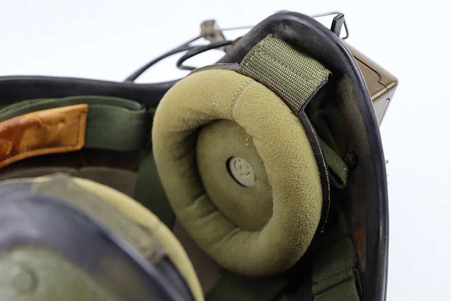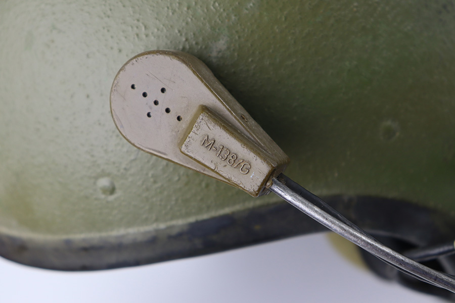 10/18/23 – This is an original 1966 production, Vietnam era CVC T56-6 Tanker Helmet with an original SA-1552/G Transceiver built in / attached. Excellent overall condition with a clean exterior. No dents or notable flaws, and nice rubberized lining around the rim of the shell. The interior is clean and excellent as well, with no markings or stamps of note except for the ink stamp on the back canvas adjustment strap. This ink stamp shows the manufacture date and labels the helmet size “Regular”. A very nice, complete example.