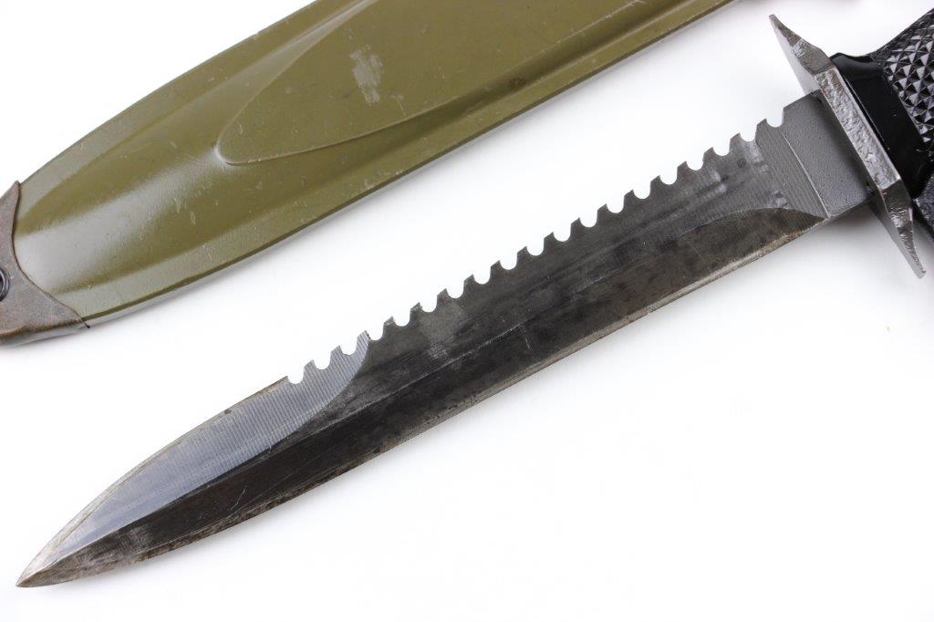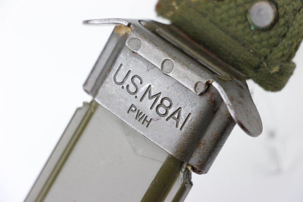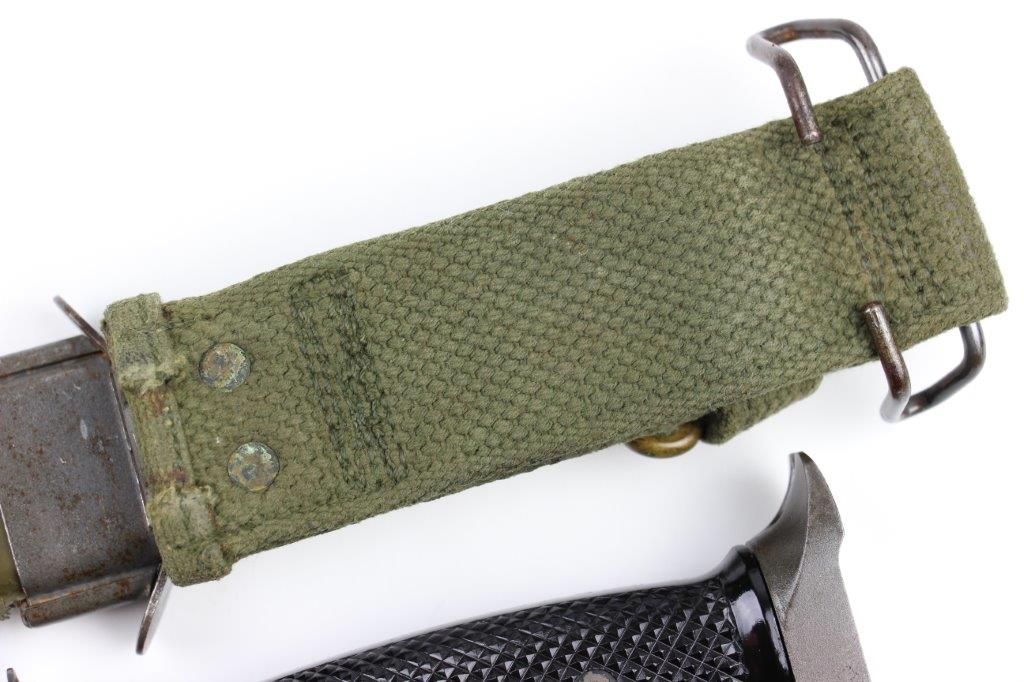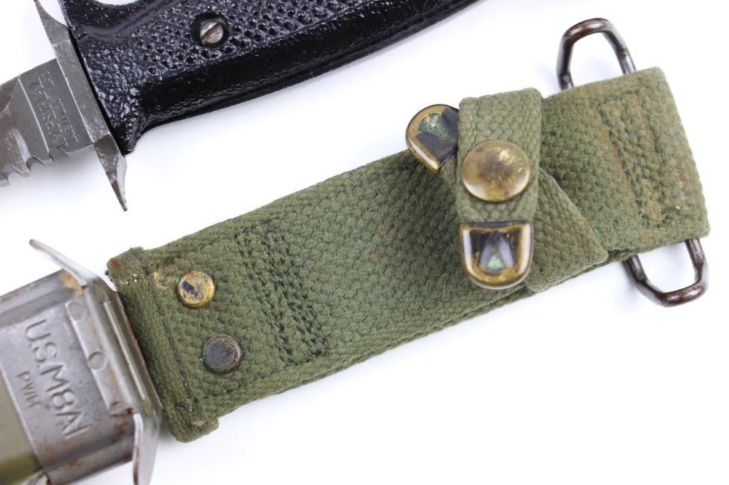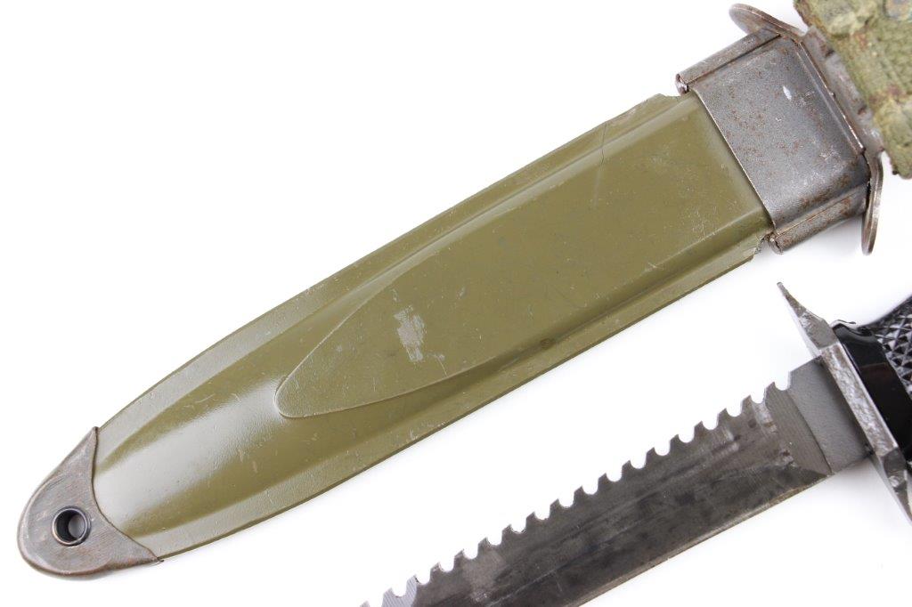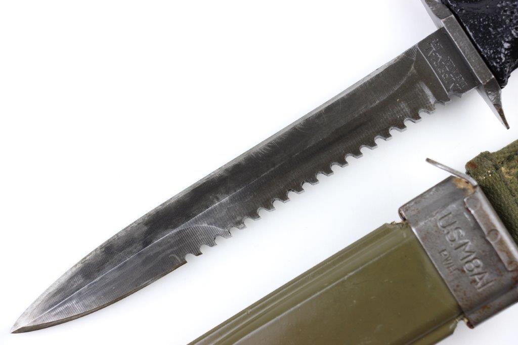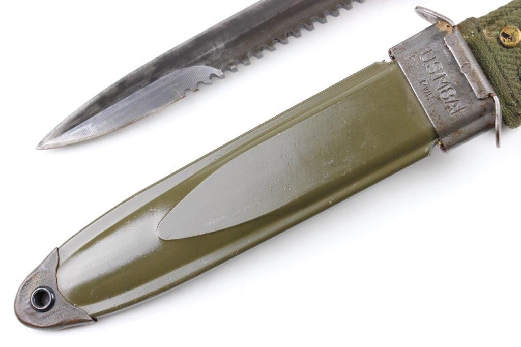 3/22/24 – This is a Vietnam era “theatre made” knuckle knife. This knife would have left the factory as an M7 bayonet for use with the M16 rifle. However GI’s commonly created their own “theatre weapons” out of m7 bayonets during Vietnam and throughout the 1980’s. An aluminum, one-piece handle with knuckle guards was added, and the blade was modified with a sawback on the spine and a highly-sharpened edge. Comes with an original M8A1 scabbard. A very interesting and somewhat unique US fighting knife. Most likely made during Vietnam.