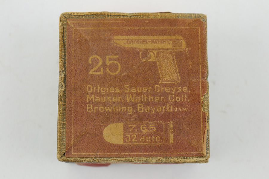 4/29/21 – Vintage 7.62mm Ammunition. The front label of this box of ammunition indicates that these cartridges are intended for Ortgies, Sauer, Dreyse, Mauser, Walther, Colt, Browning, Bayard firearms. Given this and the caliber we assume it was intended for WW2 period firearms and was manufactured then. The packaging is original and both seals are intact. The box is fragile on one side due to some tearing. The bottom of the box shows a Germany export stamp.