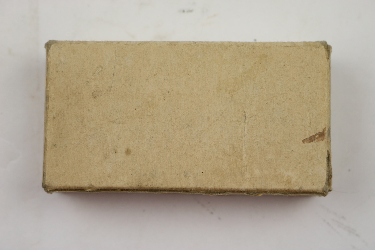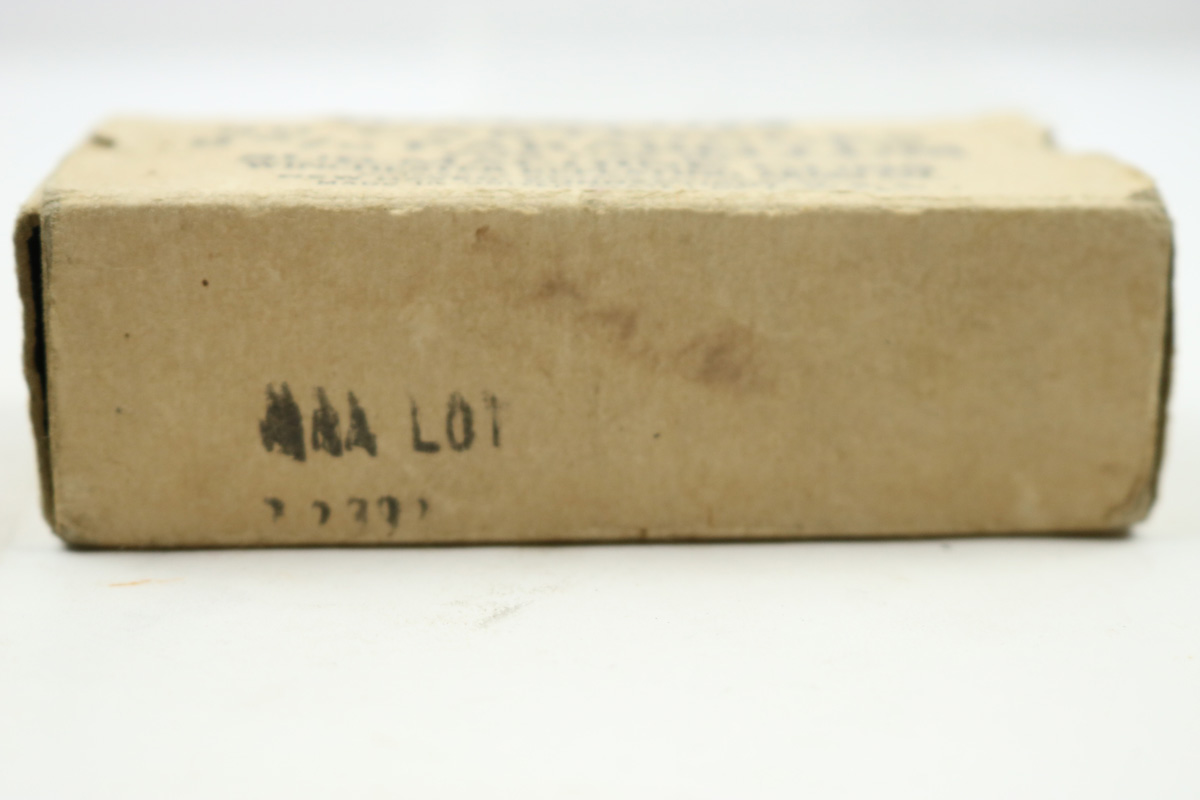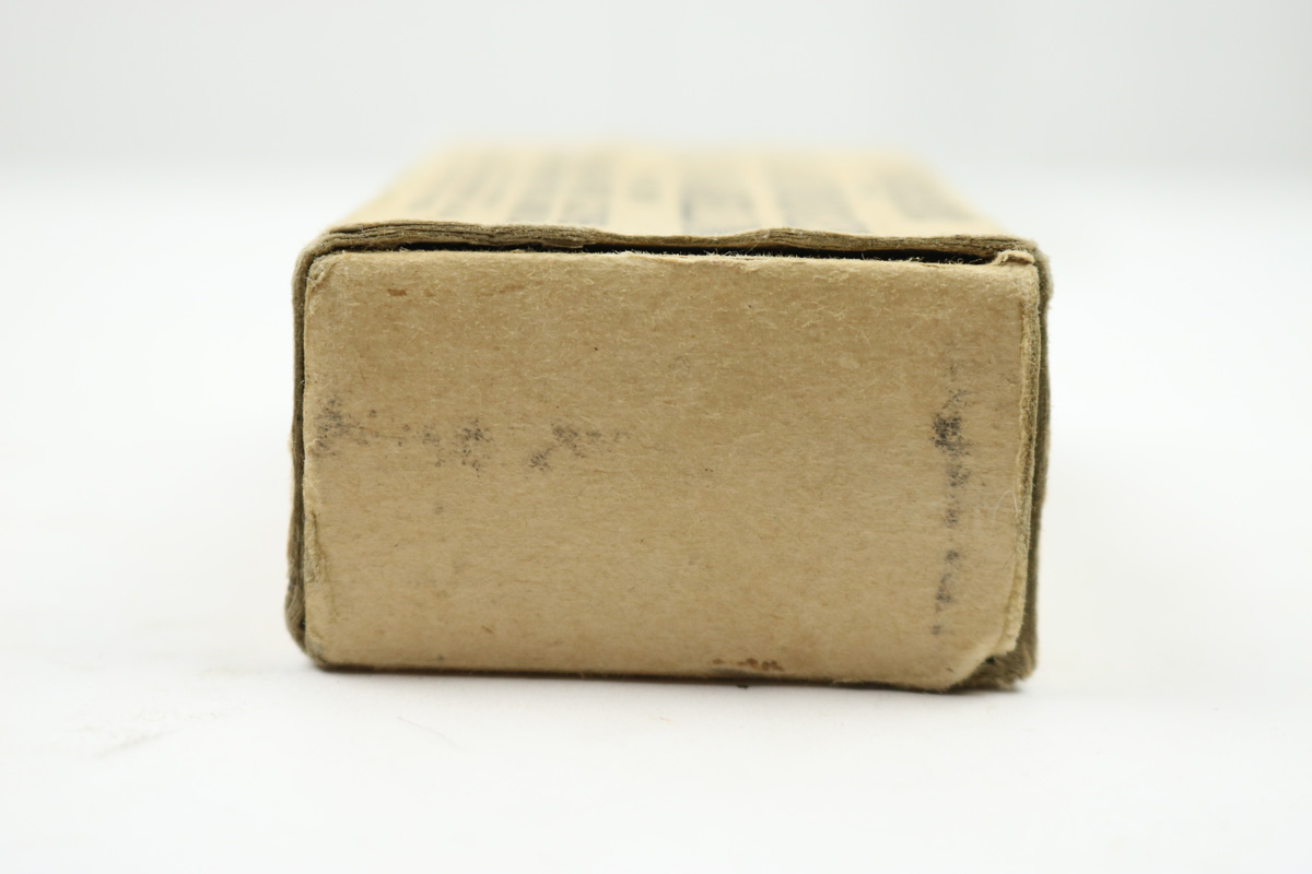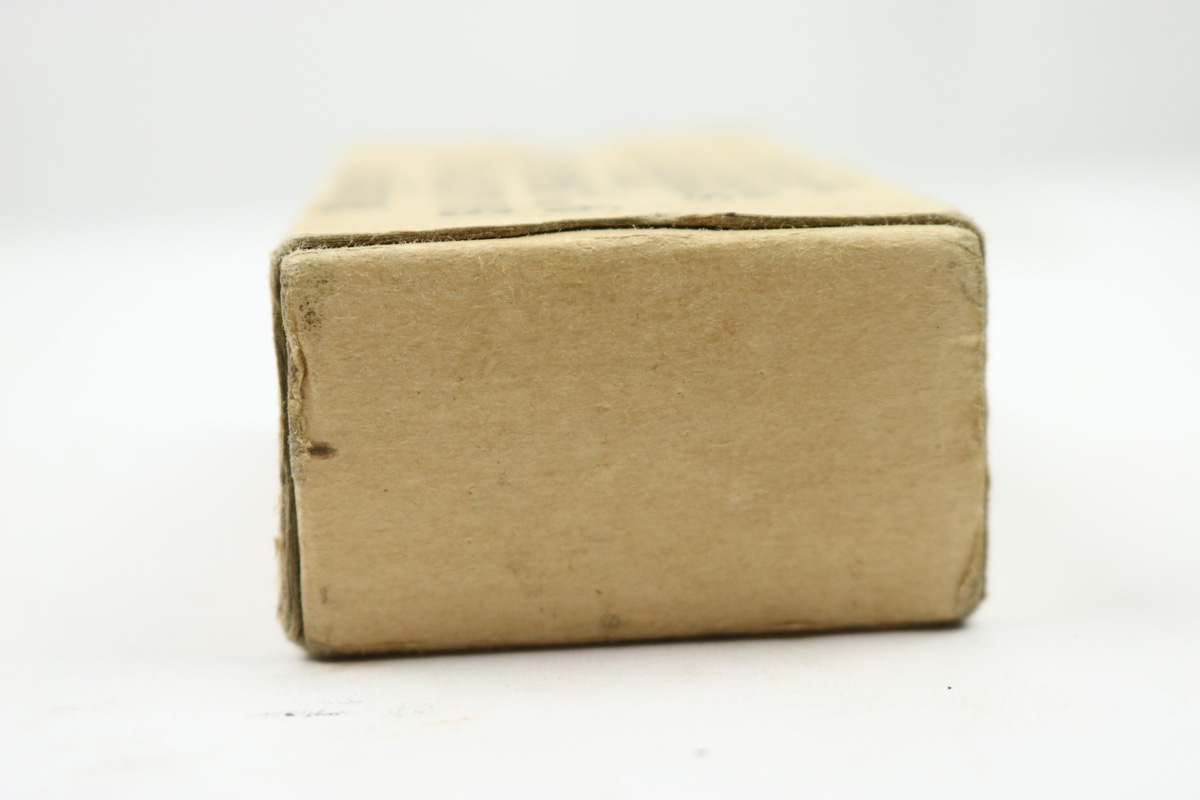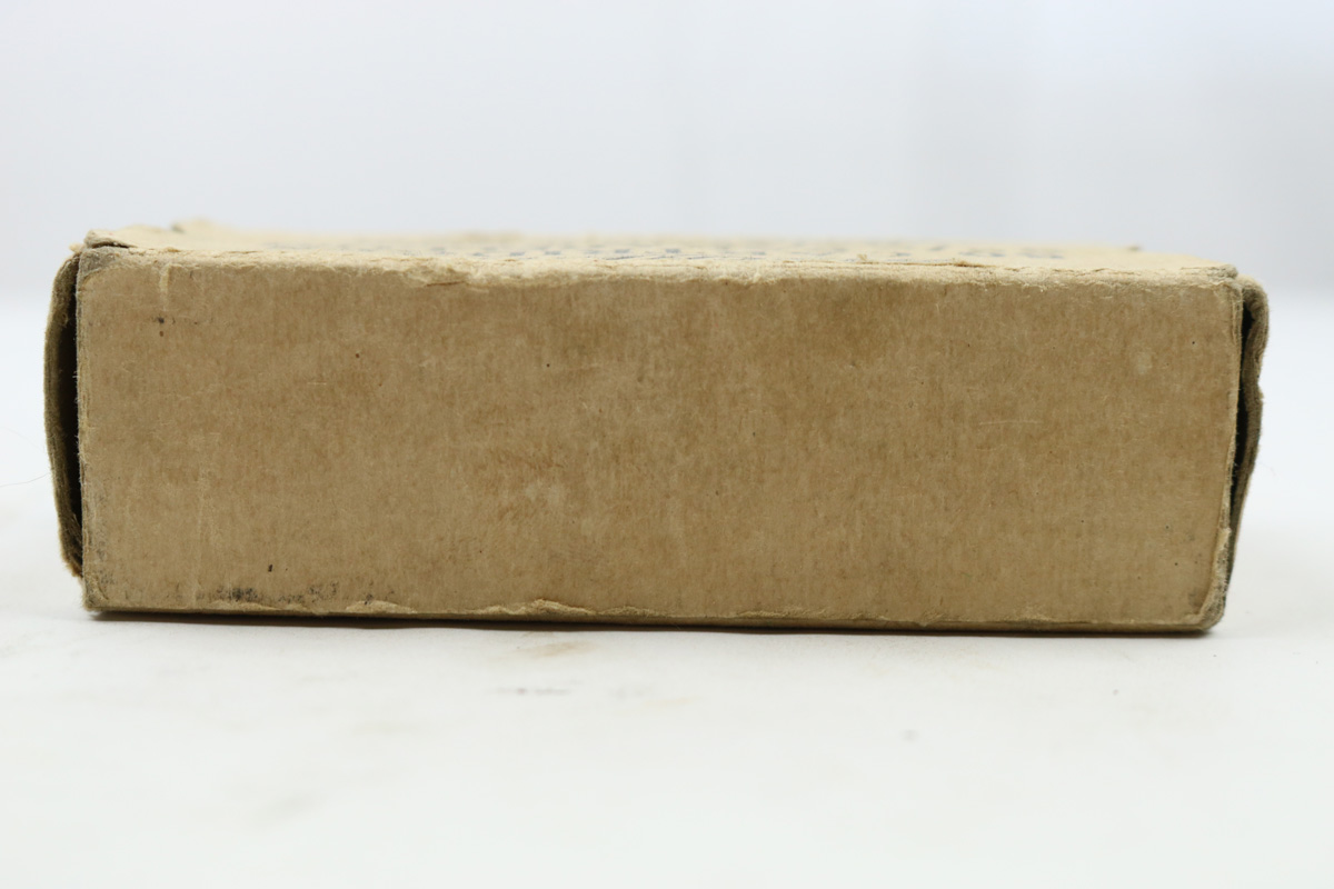 8/1/18 – This is an original box of vintage Winchester 9mm parabellum ammunition. The box is in tact and has an ink stamp for the lot number. The actual number is hard to read though and was a poor stamp. There are only 20 rounds included in the box – as shown in photos. The round are excellent, and this would go well as display with any vintage 9mm submachine gun. Could possibly have been made for United Defense Supply Corp’s M42 submachine gun made during 1942-43.