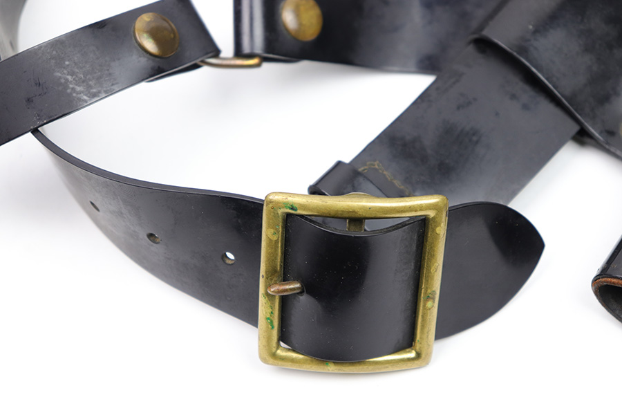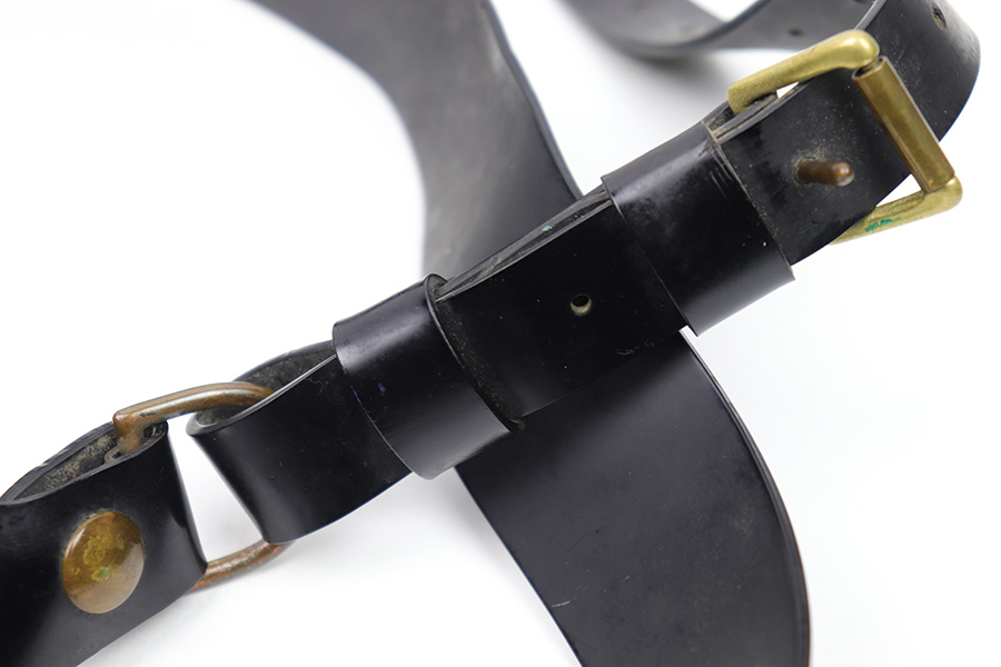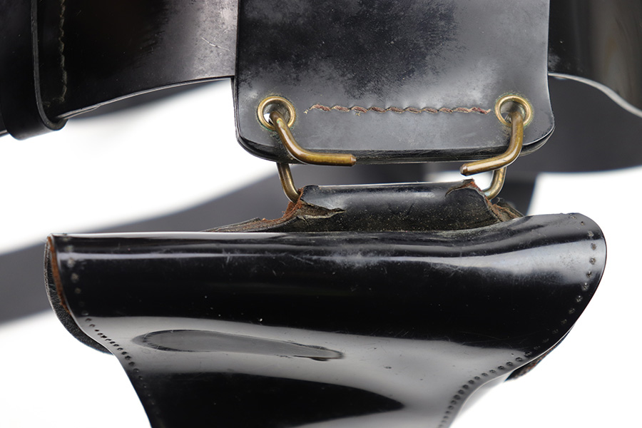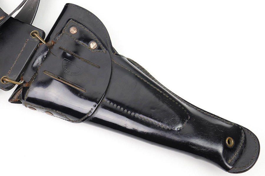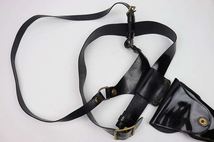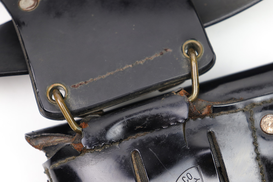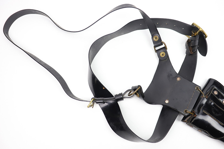 1/11/23 – This is a fairly scarce variation M1916 holster for a M1911A1 pistol made from Vinyl plastic-like material. The holster comes with an attached leg harness and belt, which are both also made from vinyl material. We believe this is likely an immediate post WW2 production item, as the brass fixtures have natural aging as shown. The holster is in great condition with mild pliability and signs of previous use. The front stitching is missing along the left side (when looking at the front of the holster) but this doesn’t affect functionality and is about 2.5 inches long. The rest of the stitching is original and intact. The vinyl material is excellent throughout, with the only notable cracking being on the top of the belt / harness loop (shown in photos). The back of the holster is maker stamped, and there are no other markings. An interesting and unusual grouping for 1911 collectors.