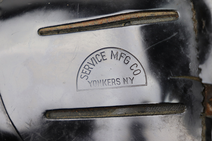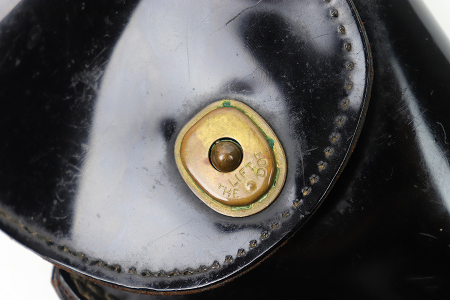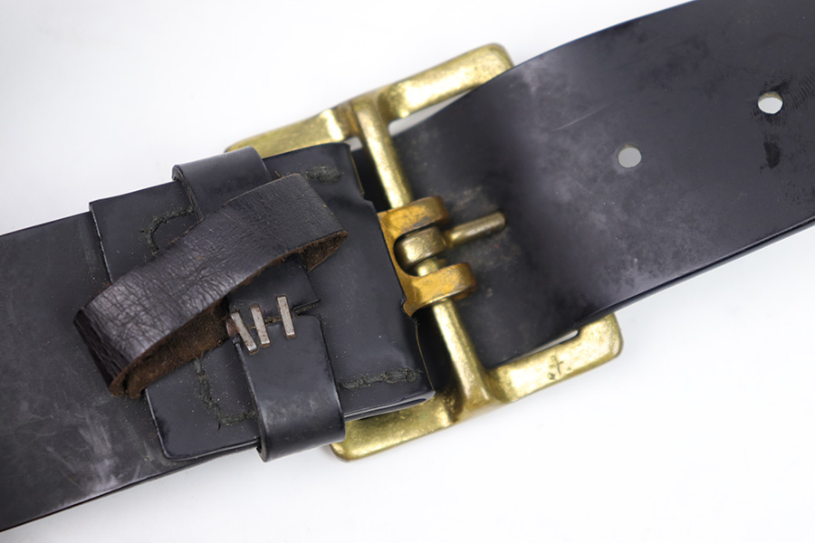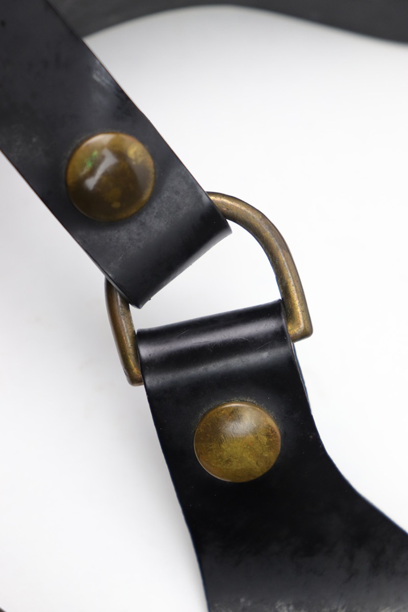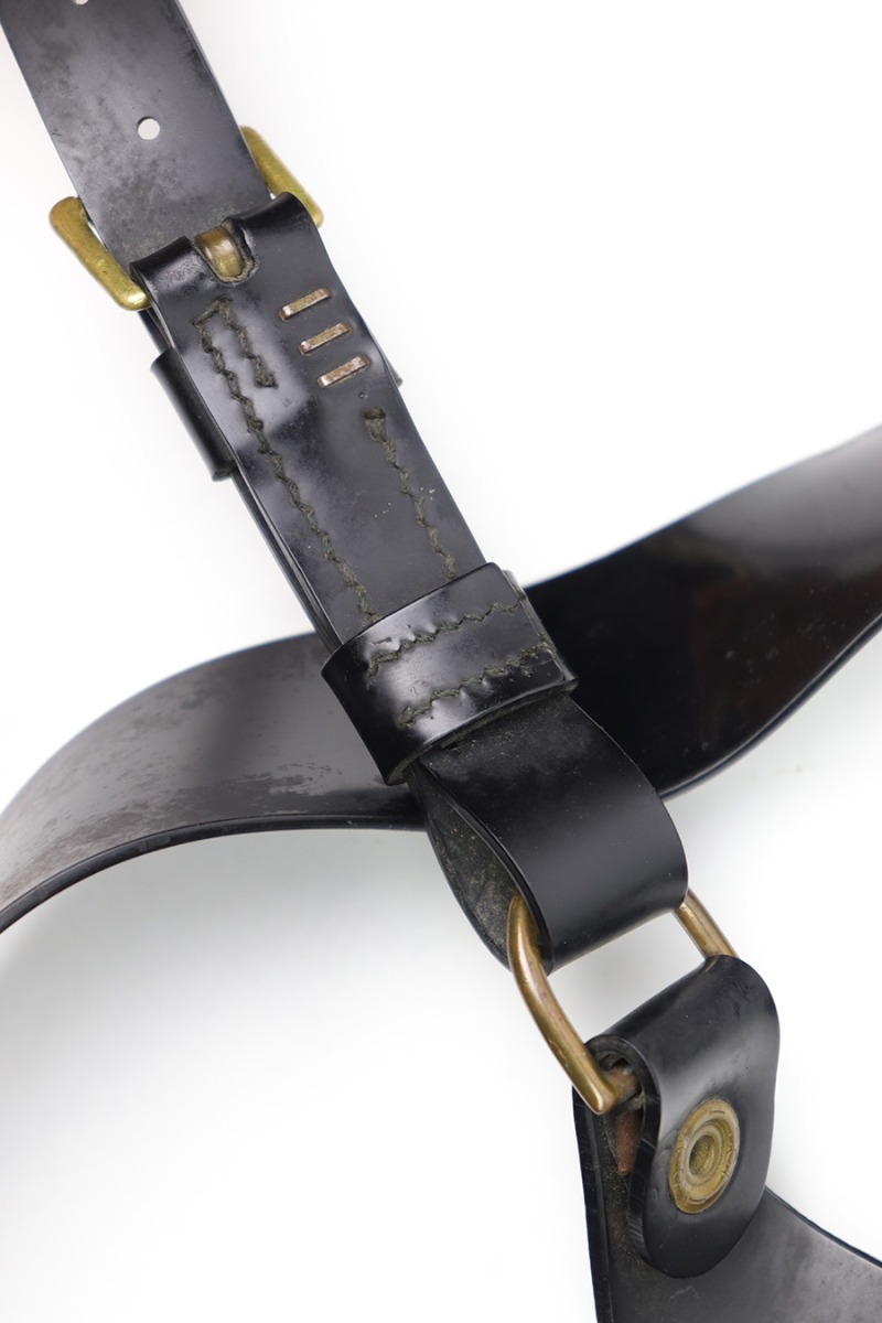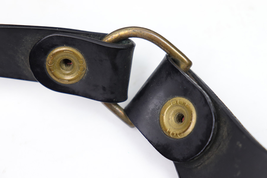 1/11/23 – This is a fairly scarce variation M1916 holster for a M1911A1 pistol made from Vinyl plastic-like material. The holster comes with an attached leg harness and belt, which are both also made from vinyl material. We believe this is likely an immediate post WW2 production item, as the brass fixtures have natural aging as shown. The holster is in great condition with mild pliability and signs of previous use. The front stitching is missing along the left side (when looking at the front of the holster) but this doesn’t affect functionality and is about 2.5 inches long. The rest of the stitching is original and intact. The vinyl material is excellent throughout, with the only notable cracking being on the top of the belt / harness loop (shown in photos). The back of the holster is maker stamped, and there are no other markings. An interesting and unusual grouping for 1911 collectors.