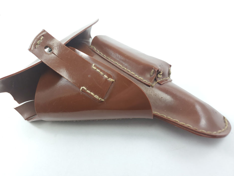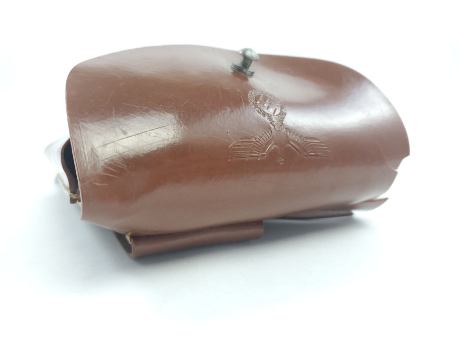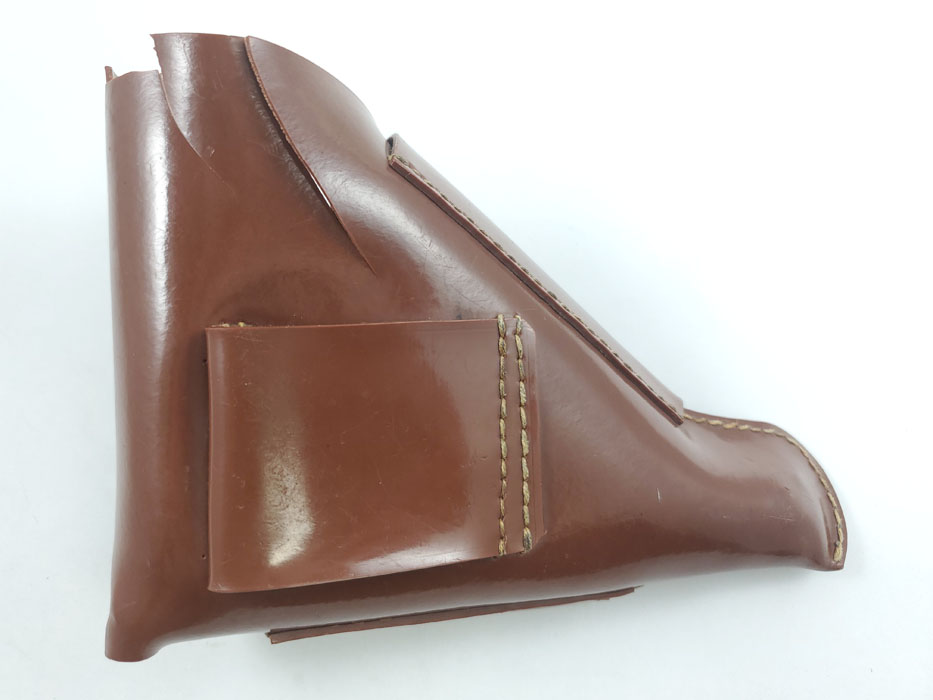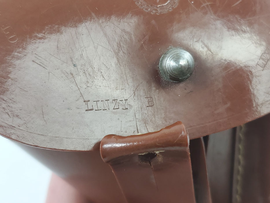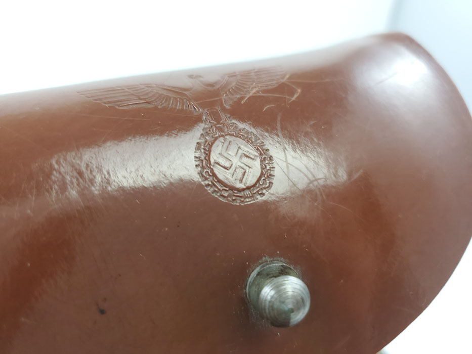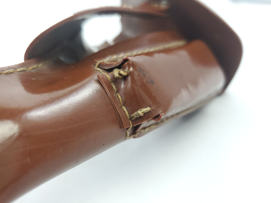 4/24/20 – This is one of the most rare variations of WW2 holsters on the market. During WW2 the nazi’s were trying different “technologies”, one of which being new holsters made out of a vinyl material instead of leather. This is a party leader vinyl holster. These holsters are extremely brittle, and we do not recommend actually putting a PPK pistol in this holster (you’ll further damage the material). The material hardened over time, and as the photos show, there are two large cracks on the top of the holster, as well as a chip missing. Otherwise this holster has a great party leader stamp in the front, and excellent stitching. SUPER RARE and hard to find, and priced based on condition.