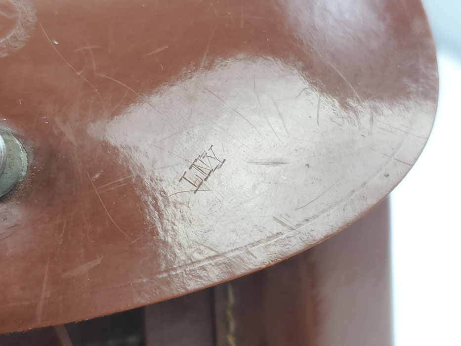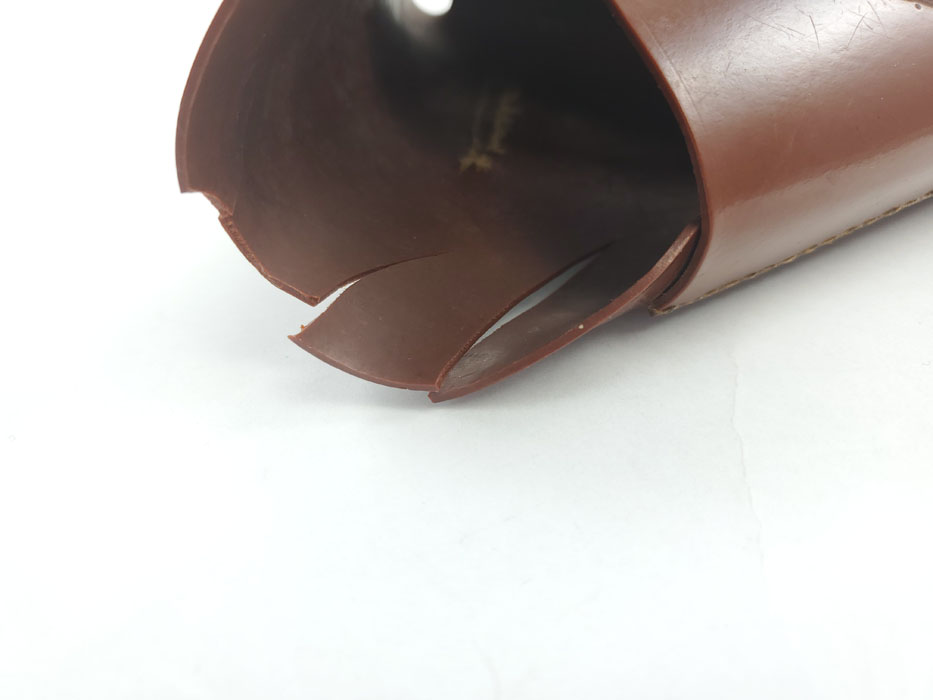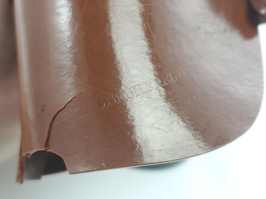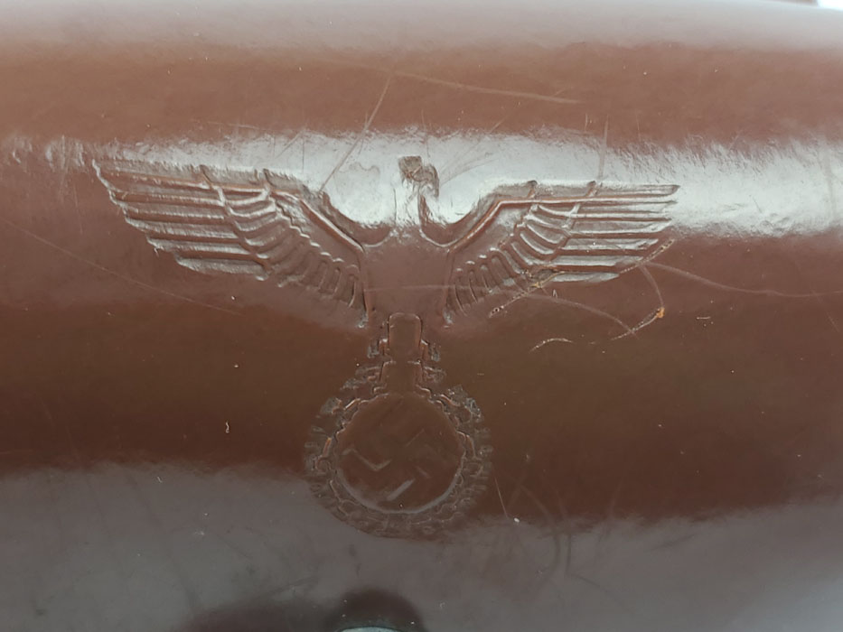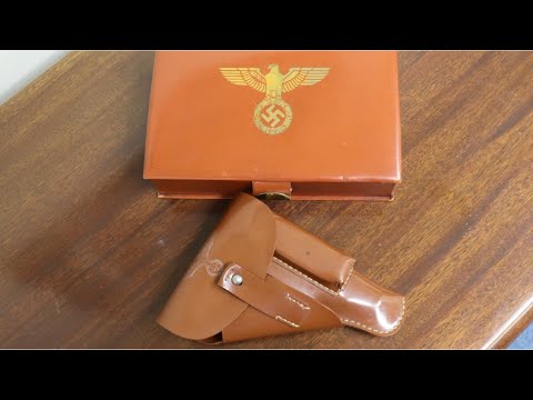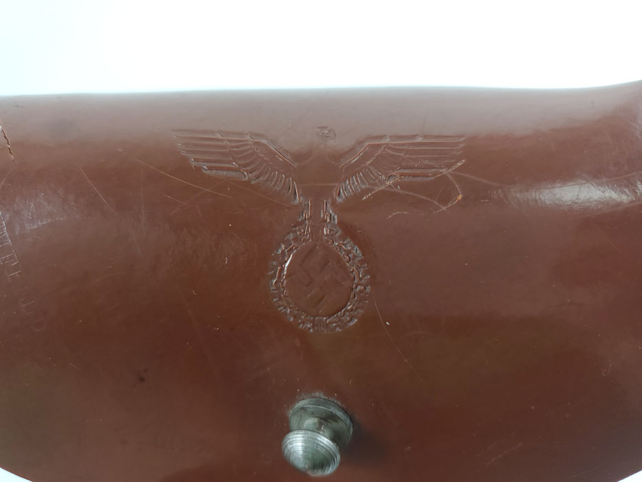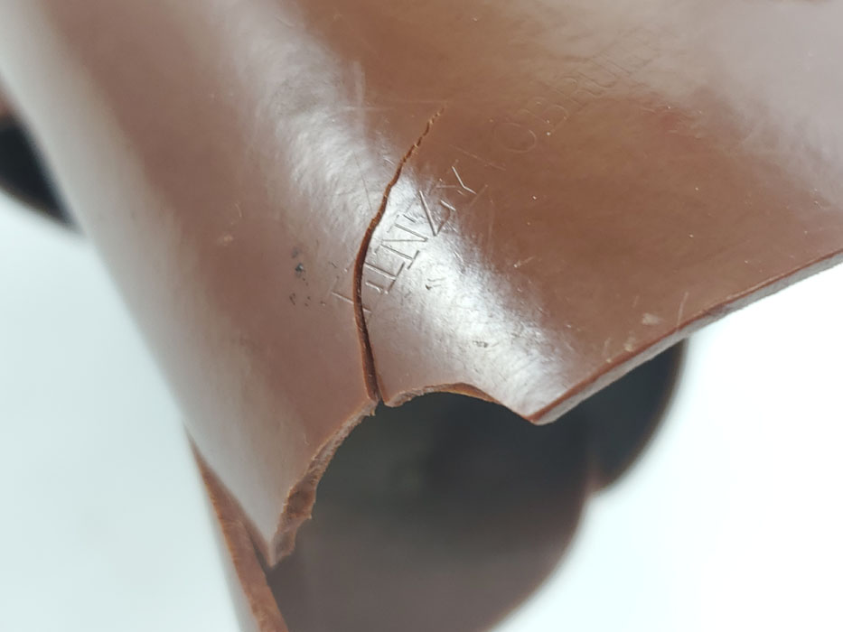 4/24/20 – This is one of the most rare variations of WW2 holsters on the market. During WW2 the nazi’s were trying different “technologies”, one of which being new holsters made out of a vinyl material instead of leather. This is a party leader vinyl holster. These holsters are extremely brittle, and we do not recommend actually putting a PPK pistol in this holster (you’ll further damage the material). The material hardened over time, and as the photos show, there are two large cracks on the top of the holster, as well as a chip missing. Otherwise this holster has a great party leader stamp in the front, and excellent stitching. SUPER RARE and hard to find, and priced based on condition.