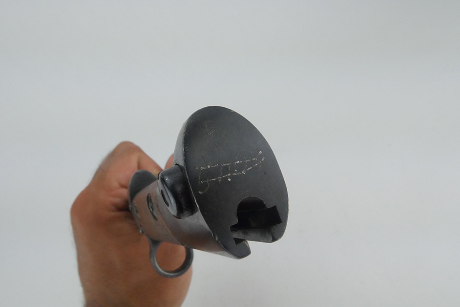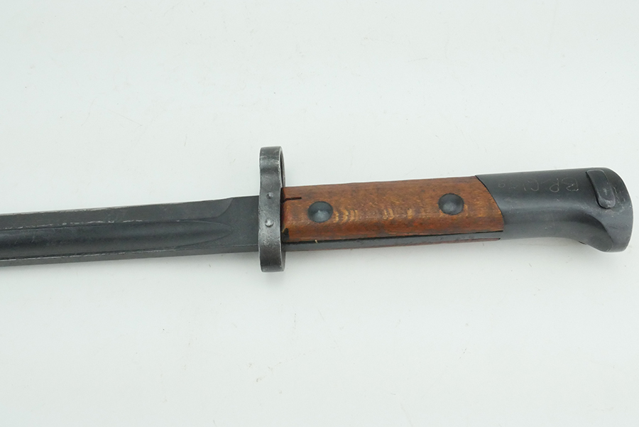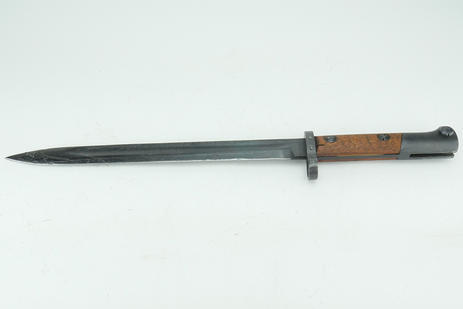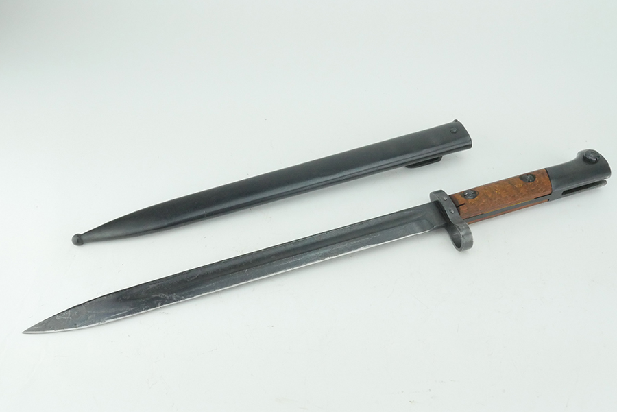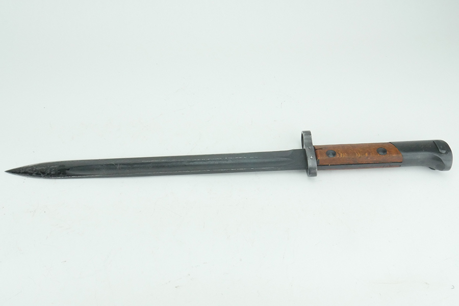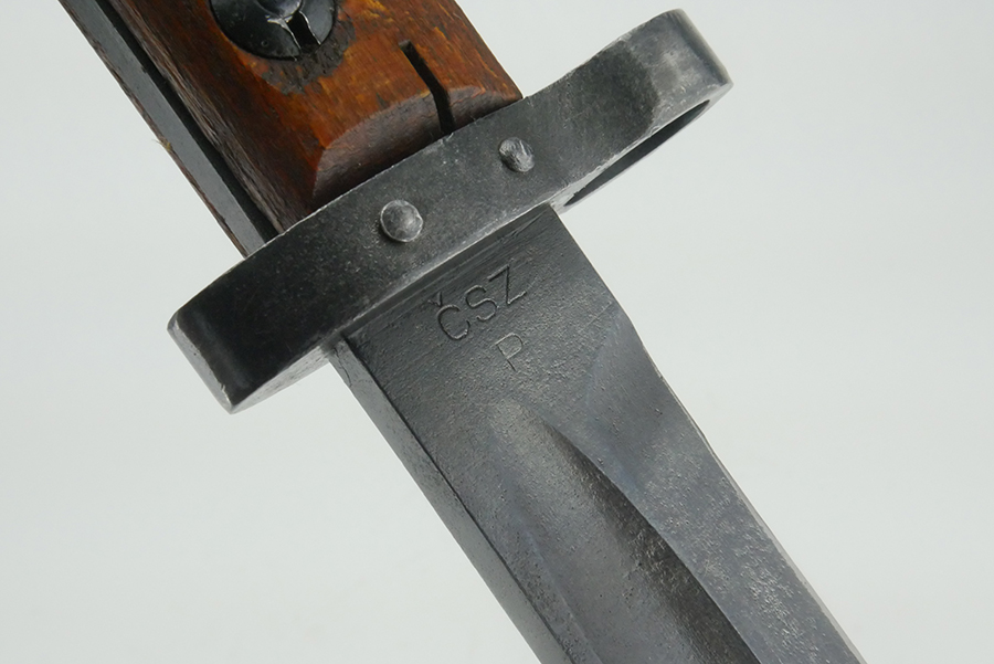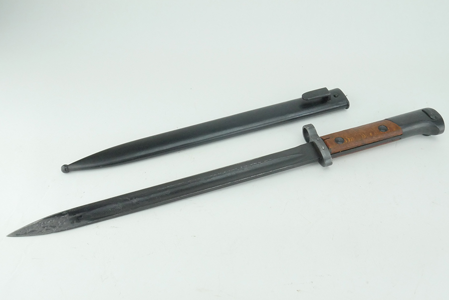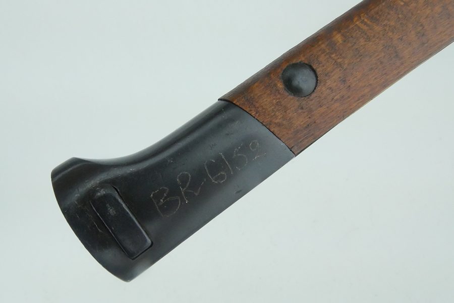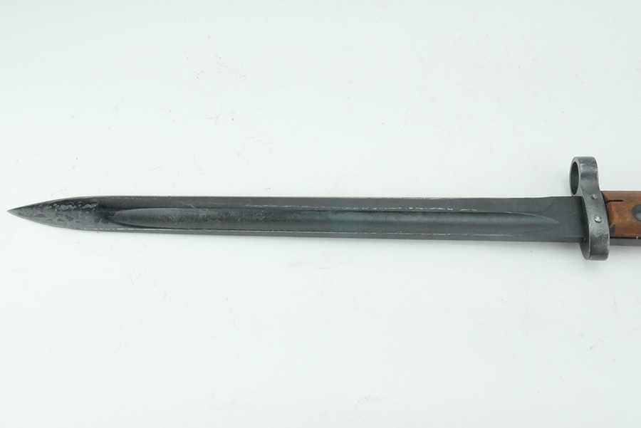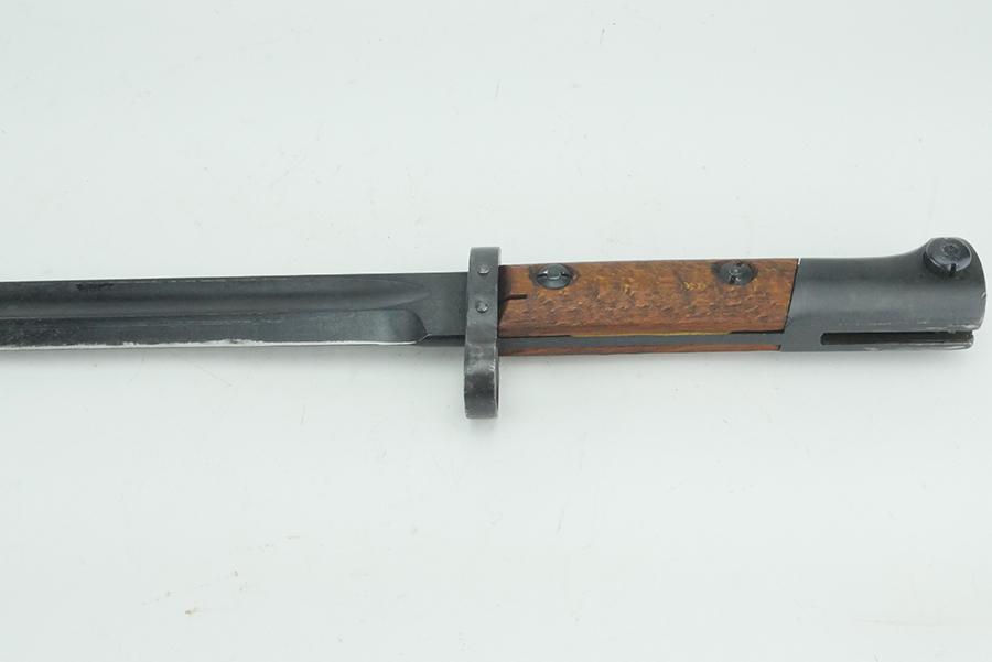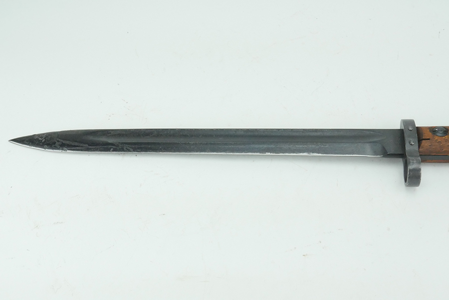 8/22/24 – This is an example of a Czech made VZ-24 bayonet made during WW2. These bayonets were produced under the German Occupation. During the war 150,000 VZ-24 rifles and bayonets were ordered by the Germans to arm their allied Romanian forces. The blade on this bayonet appears to have been re-blued and contains heavy pitting on the blade with most being towards the tip. The pommel appears to maintain the majority of it’s original finish, but was electro penciled at some point on the side and the top of the pommel. Scabbard is in good condition and has no major dents, scabbard is unmarked.