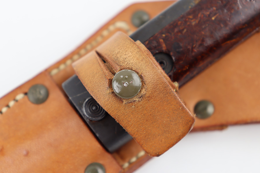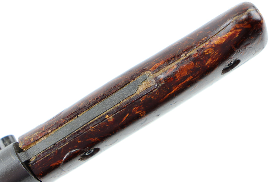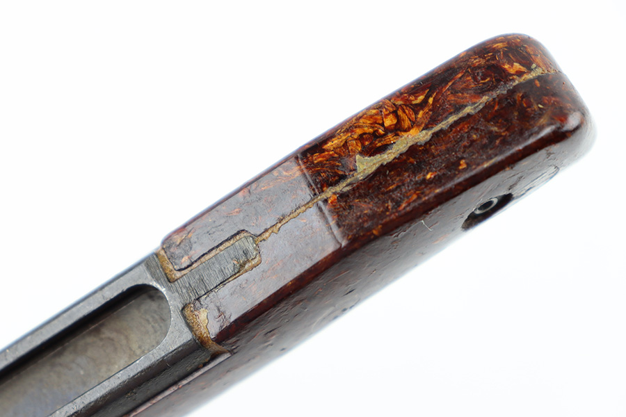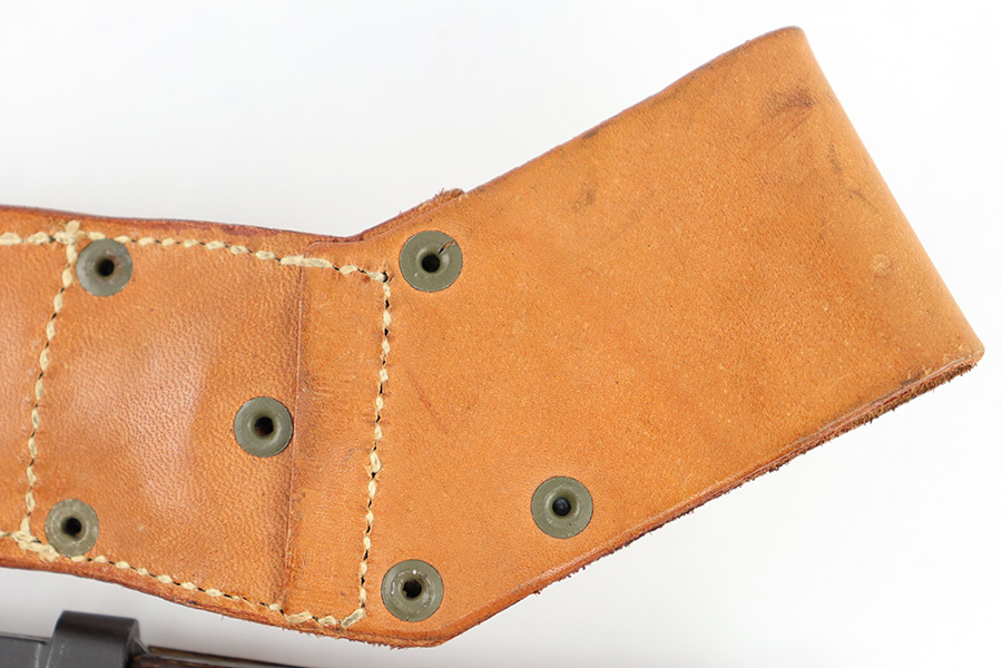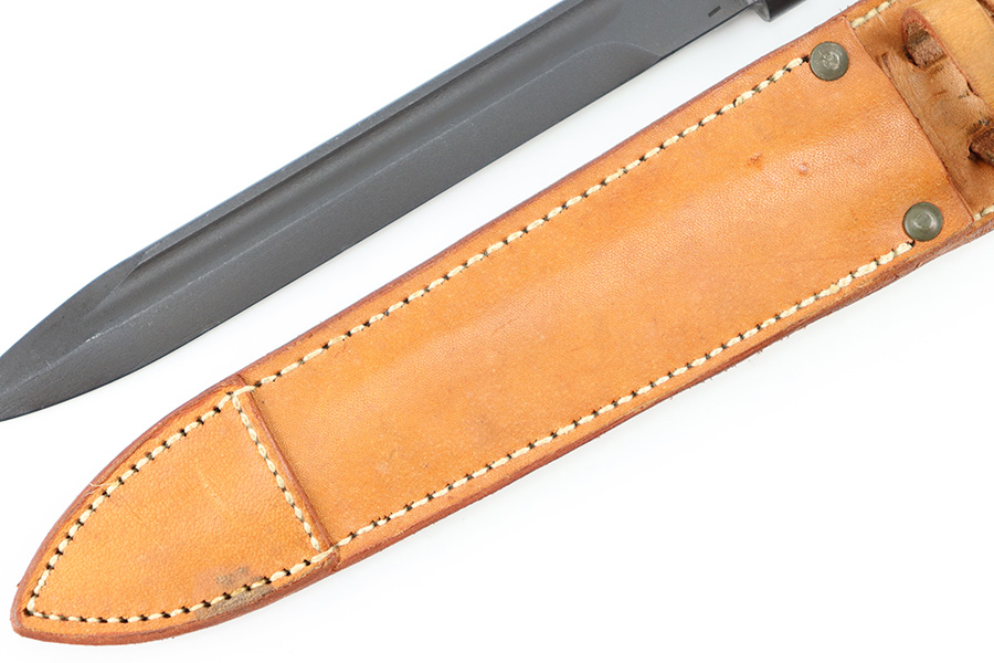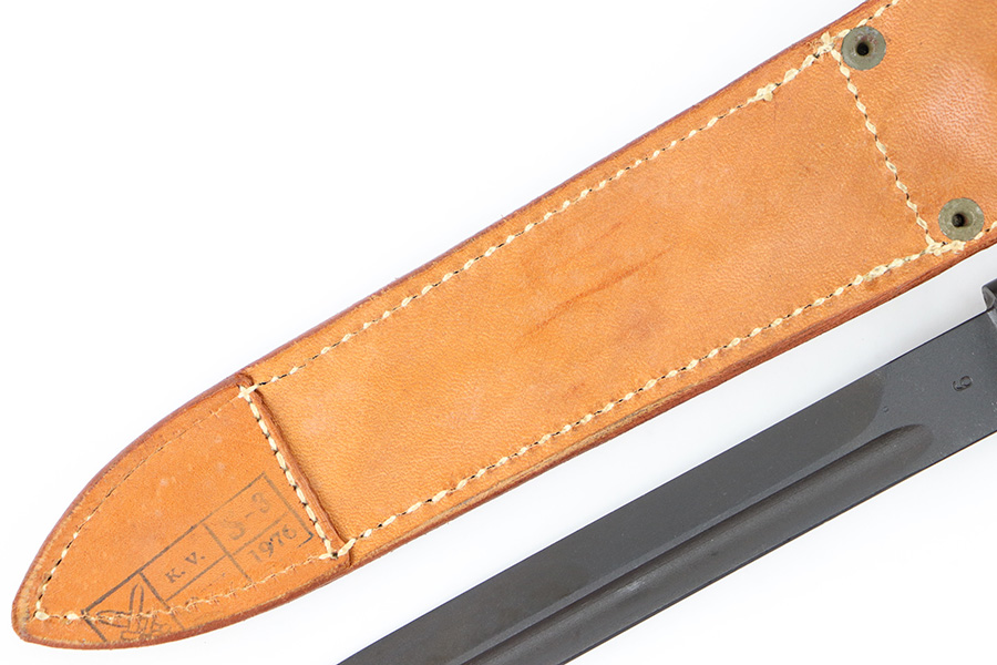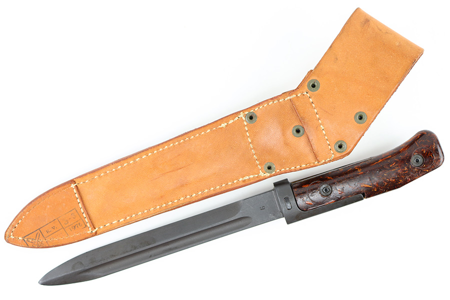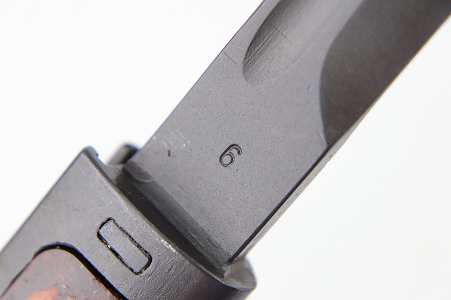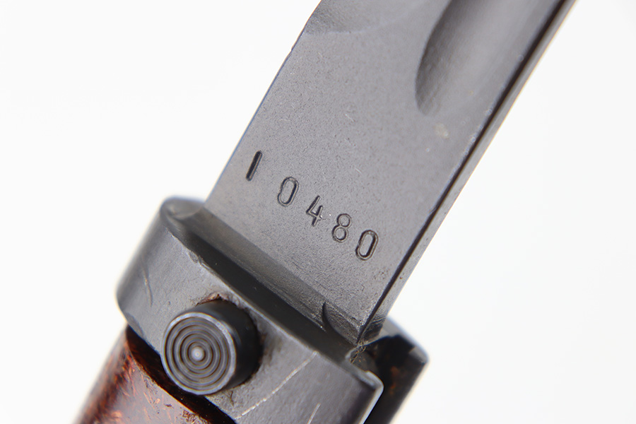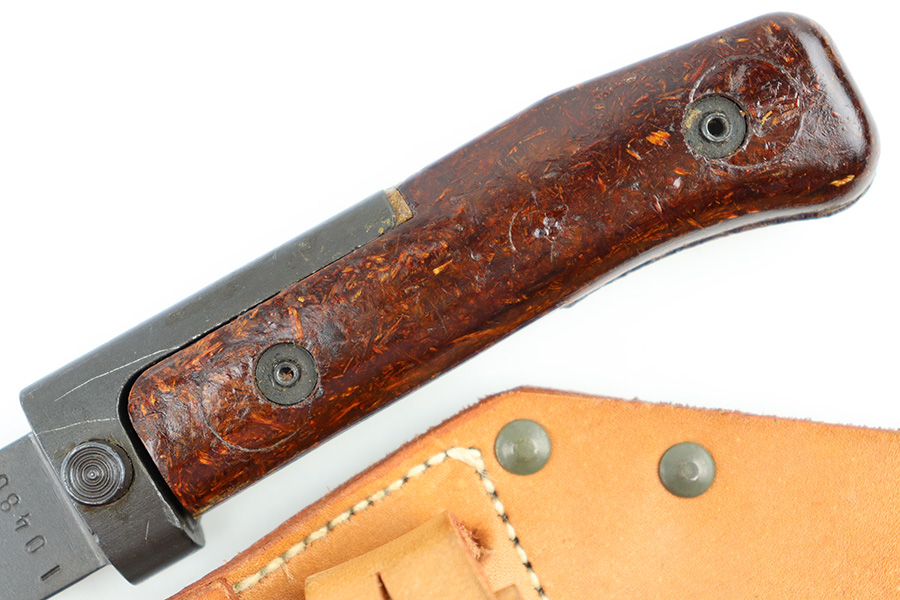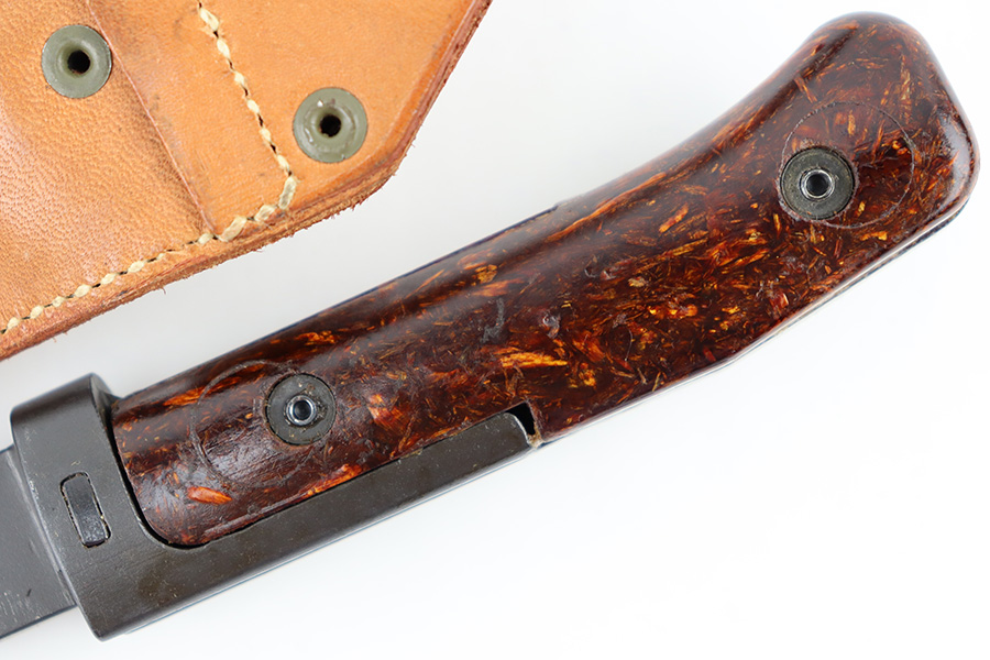 8/28/23 – This is an original Czech VZ-58 Assault Rifle bayonet. The bayonet comes with a leather scabbard that’s in excellent condition. The blade has a dull phosphate finish with a serial number on the base of the blade. The handle is reddish-brown colored with evidence of wood chips mixed within the plastic. No major issues and some light handling wear.