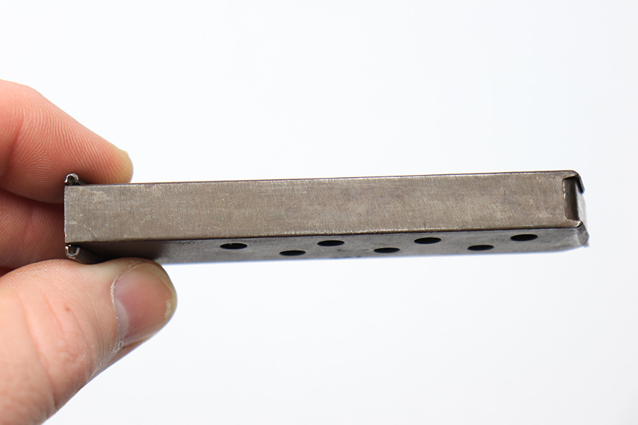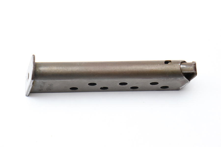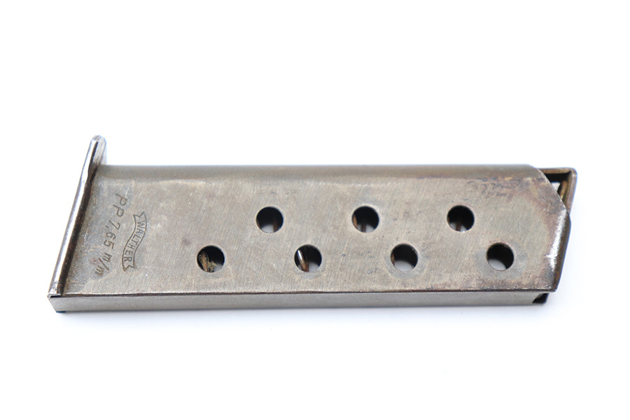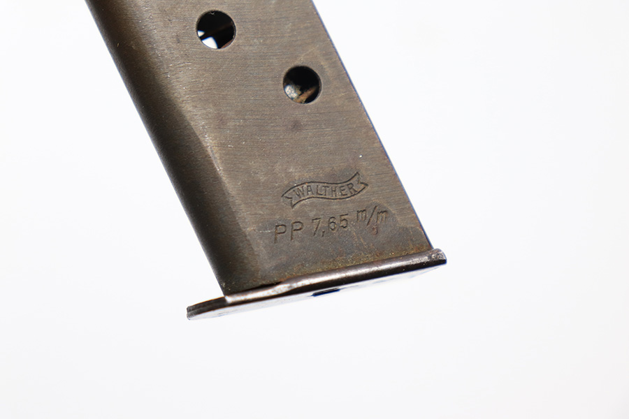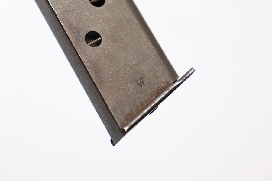 4/6/22 – This is a late WW2 (end-of-war) example of a Walther PP magazine. The magazine has a “W” stamped on one side, which was used at the end of production only, making these highly desirable magazines. This example has a nice brown patina throughout, giving the mag an aged look. However, there’s no rust or pitting or major issues. The spring is strong and fully functional.