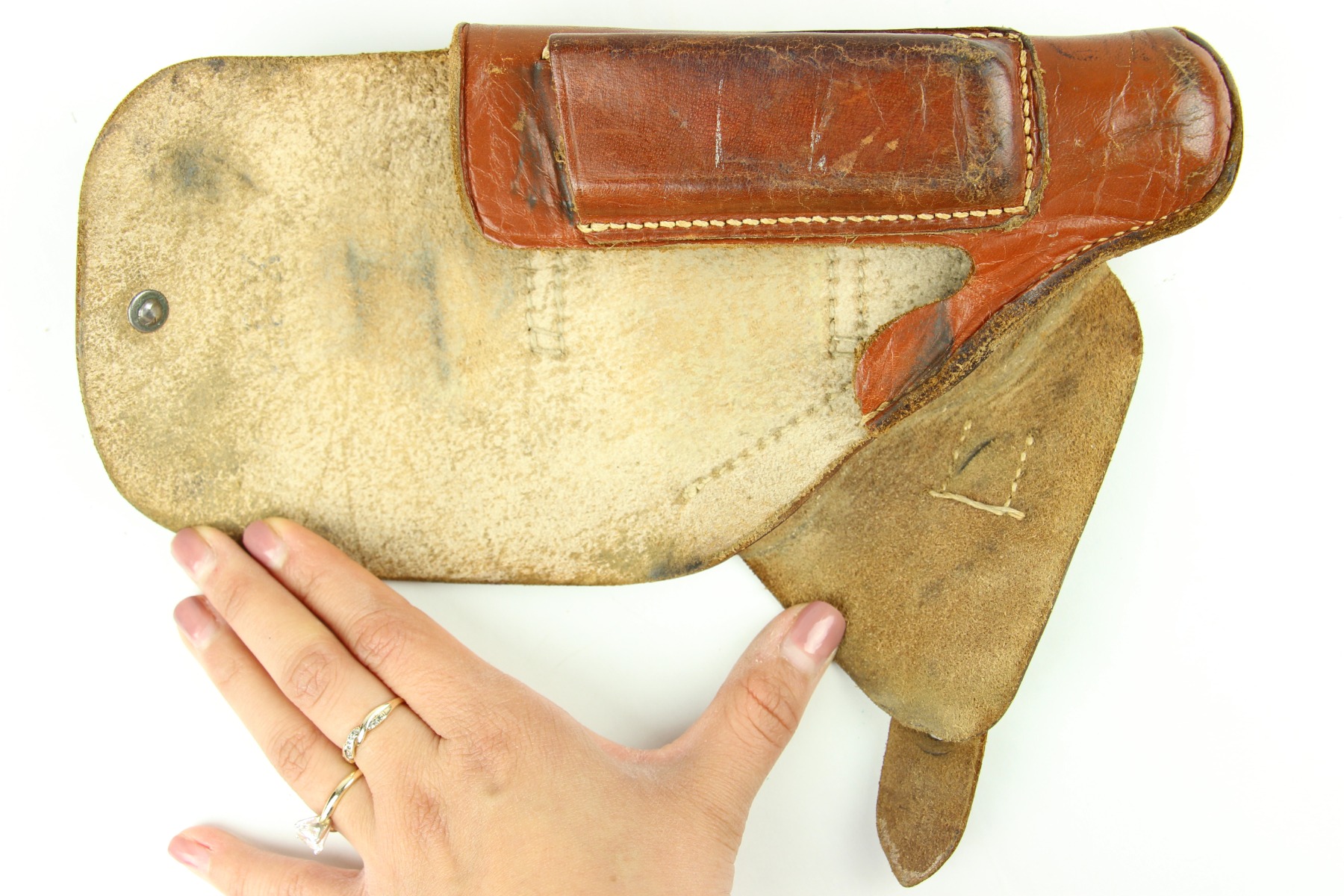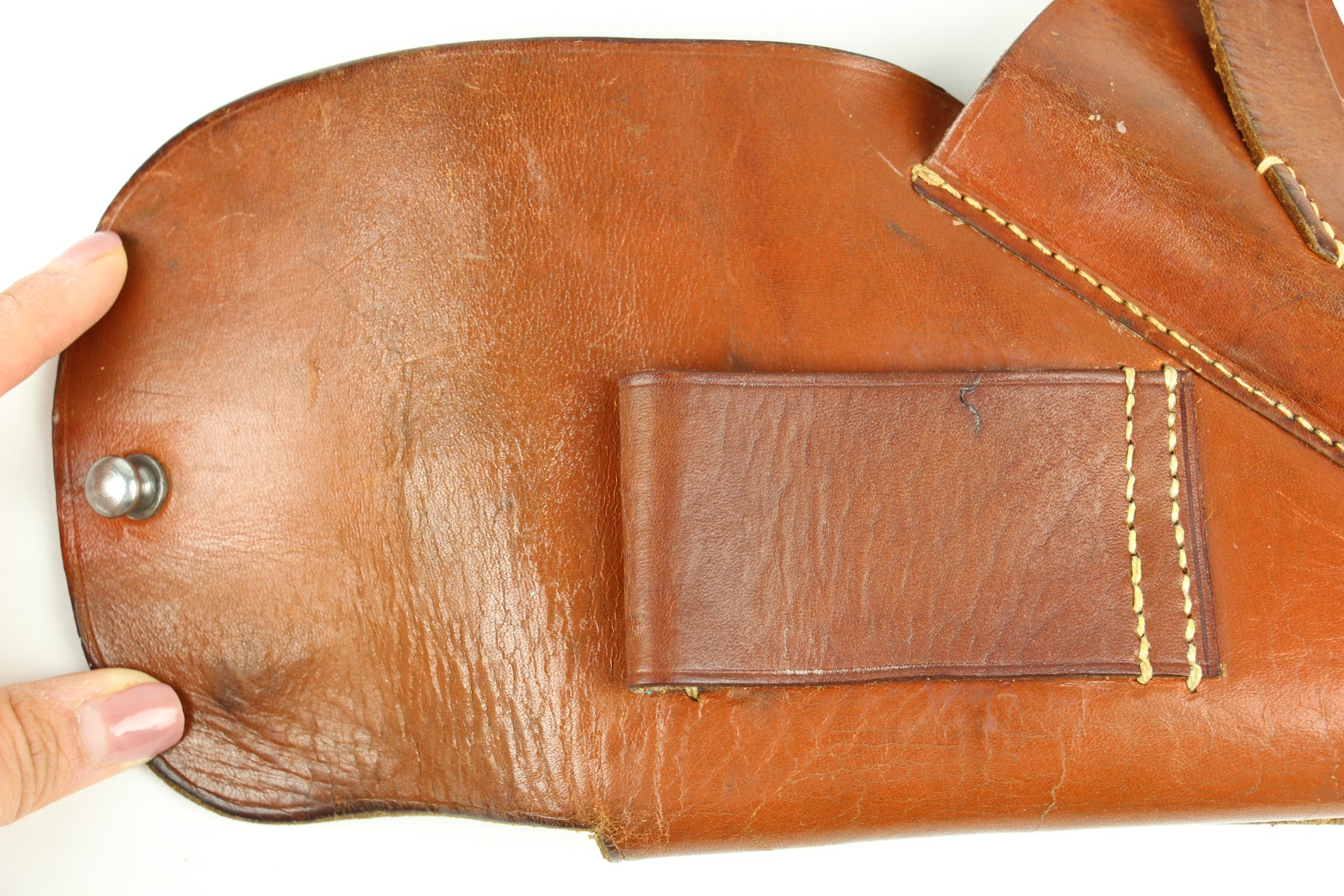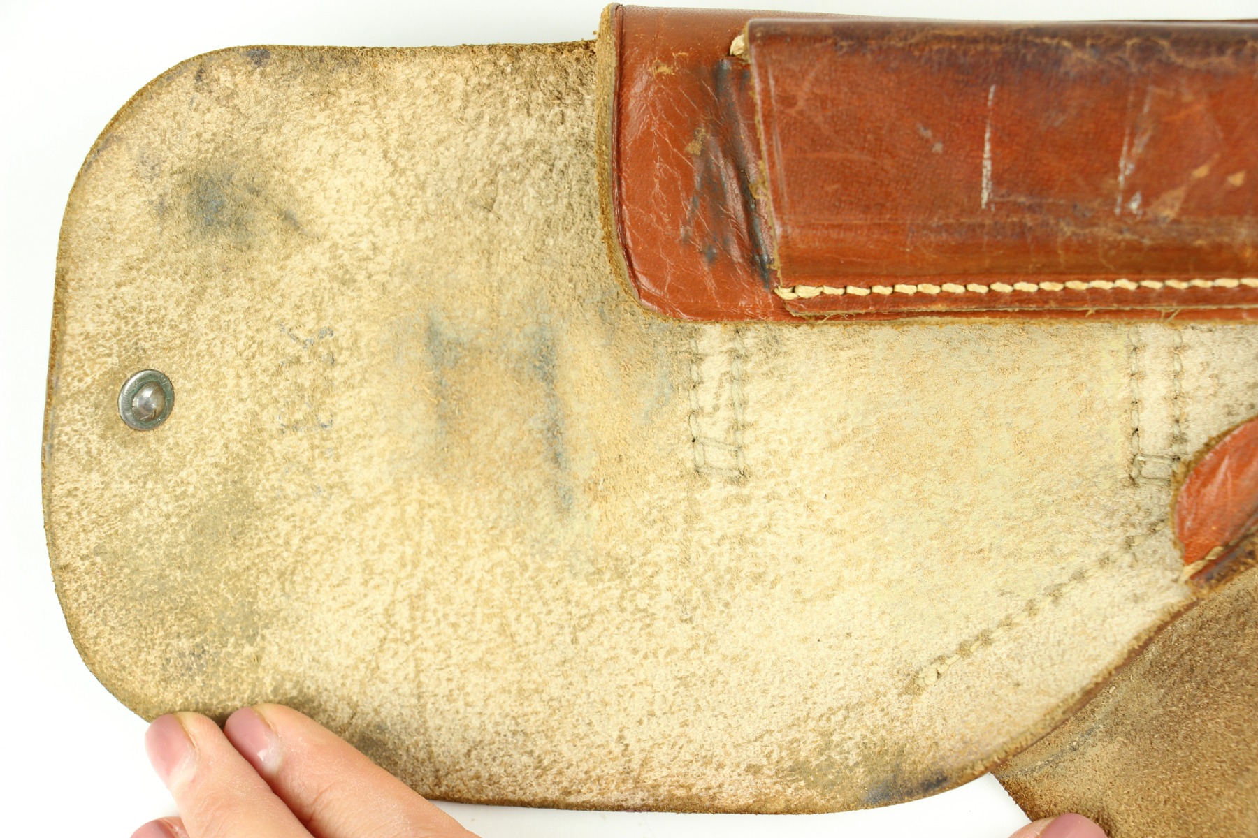 2/9/24 – This is a rare and highly desirable waffen proofed PPK holster from WW2. The holster is stamped with a WaA100 military proof under the closure strap. This proof means the holster was military issued, and pairs best with waffen proofed or eagle/359 proofed Walther PPK’s. The interior leather has a faint PPK ink stamp still visible. The holster is in great overall condition with nice brown leather that has normal pliability. Some surface wrinkling and mild wear on the magazine pouch and toe of the holster. The interior leather is clean with normal signs of previous use. Excellent, original stitching throughout.