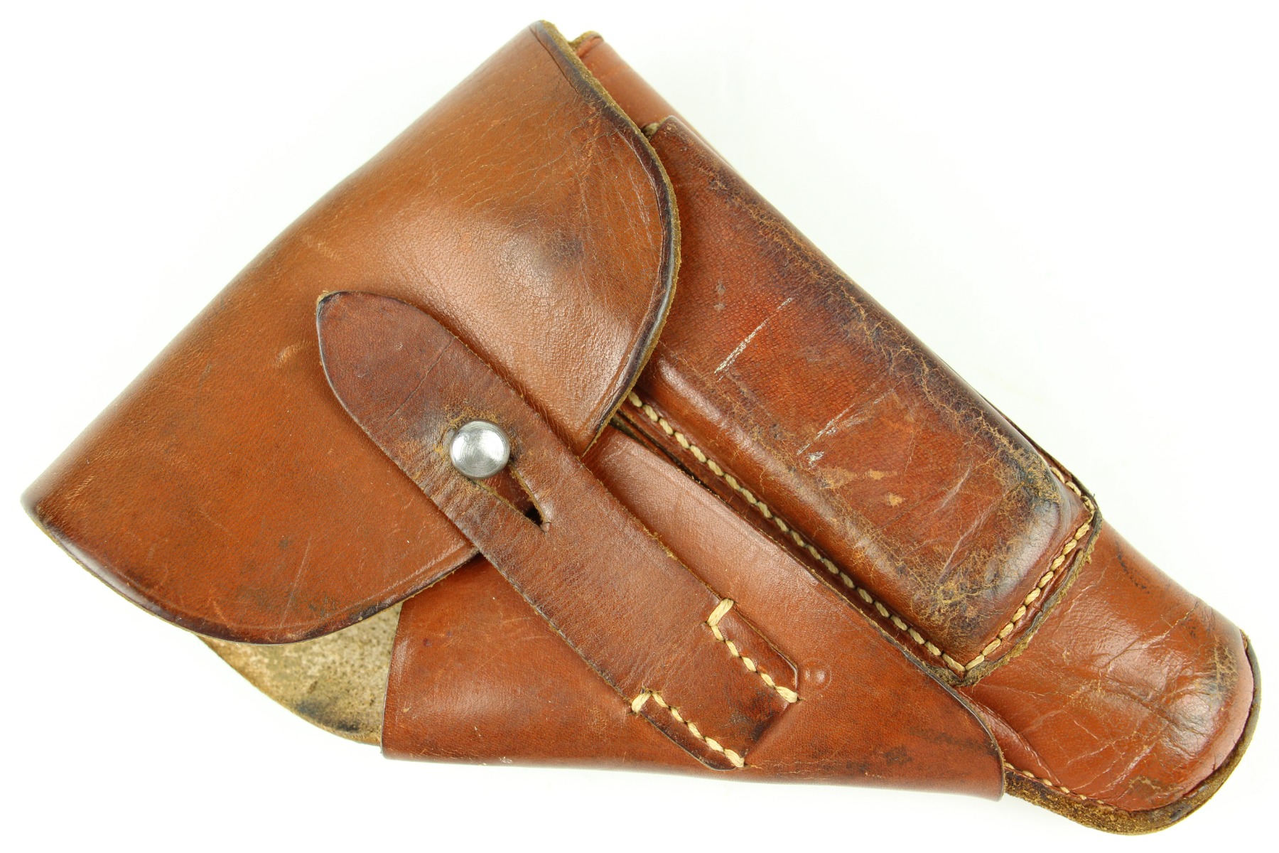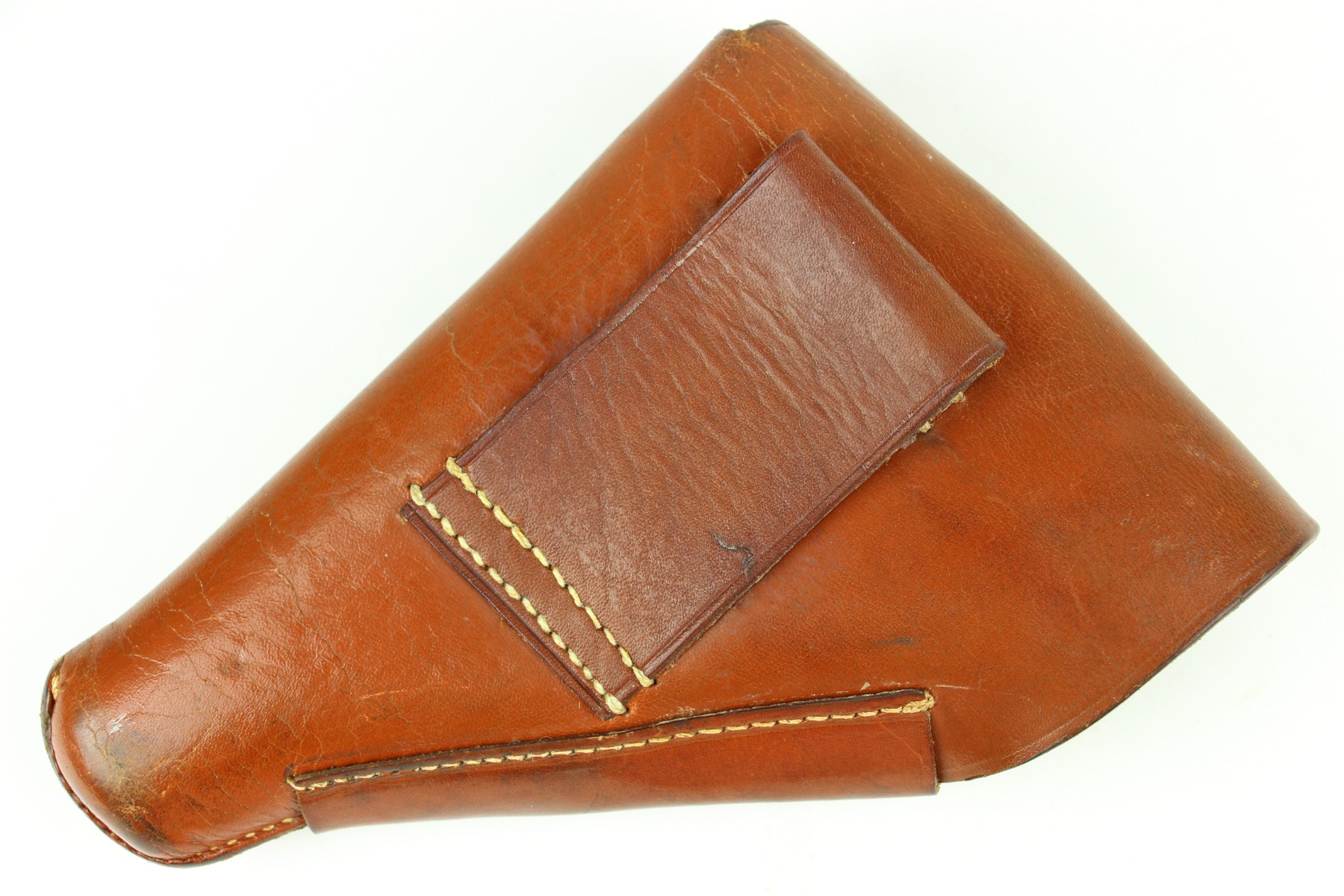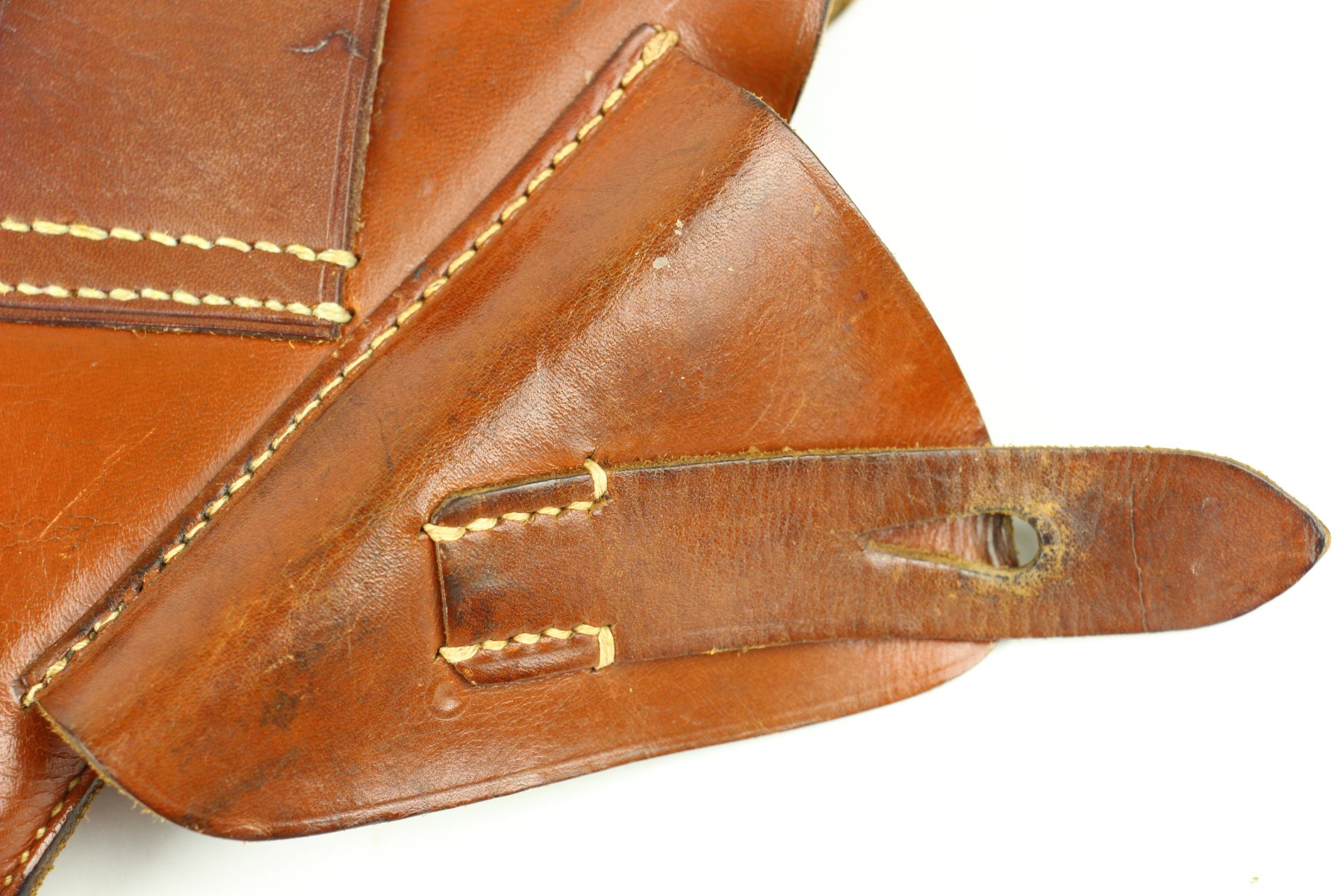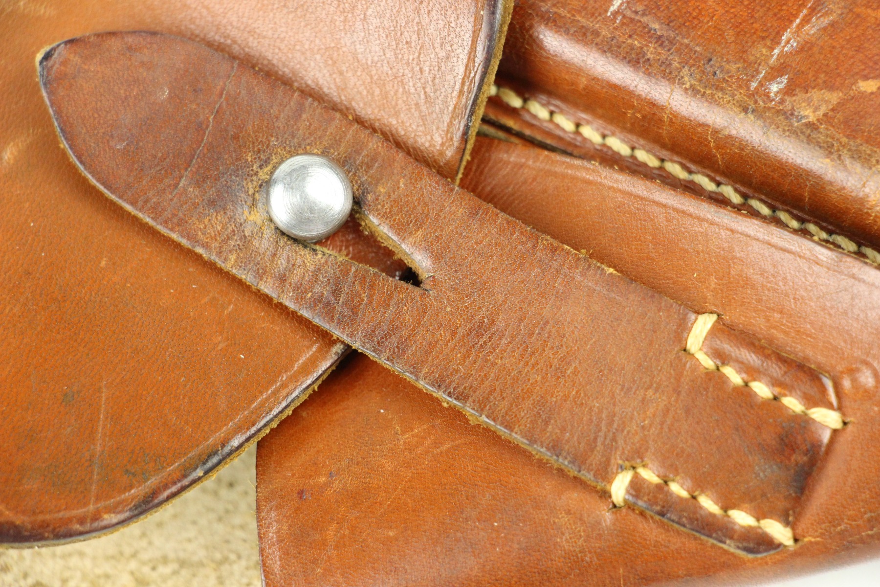 2/9/24 – This is a rare and highly desirable waffen proofed PPK holster from WW2. The holster is stamped with a WaA100 military proof under the closure strap. This proof means the holster was military issued, and pairs best with waffen proofed or eagle/359 proofed Walther PPK’s. The interior leather has a faint PPK ink stamp still visible. The holster is in great overall condition with nice brown leather that has normal pliability. Some surface wrinkling and mild wear on the magazine pouch and toe of the holster. The interior leather is clean with normal signs of previous use. Excellent, original stitching throughout.