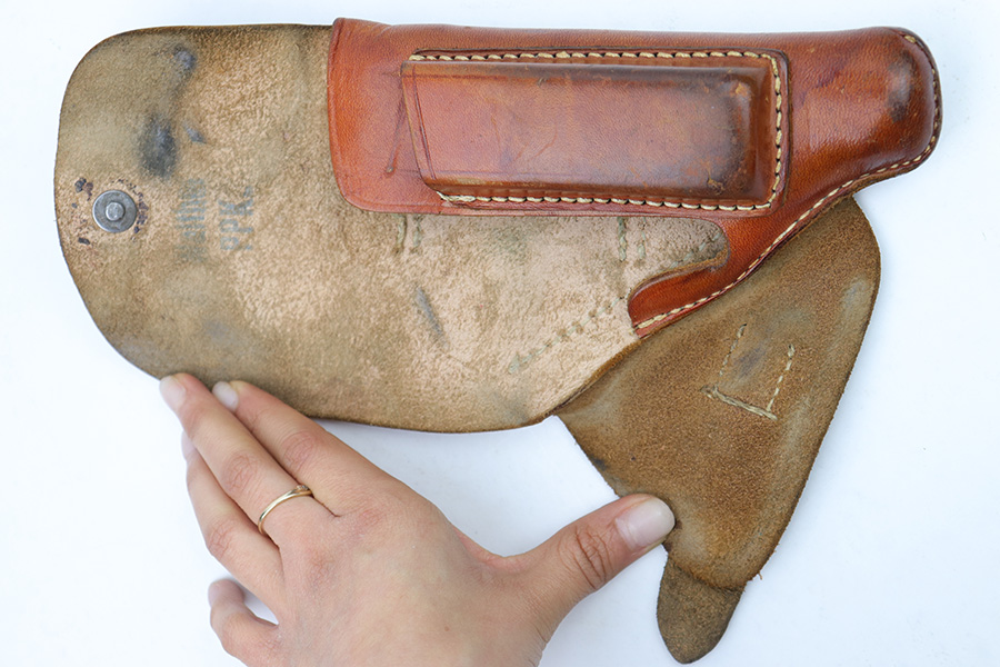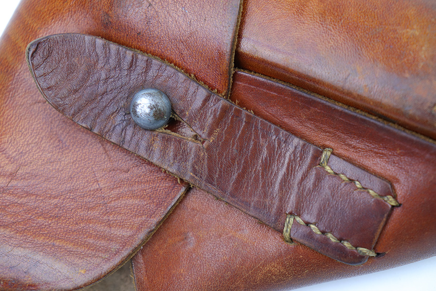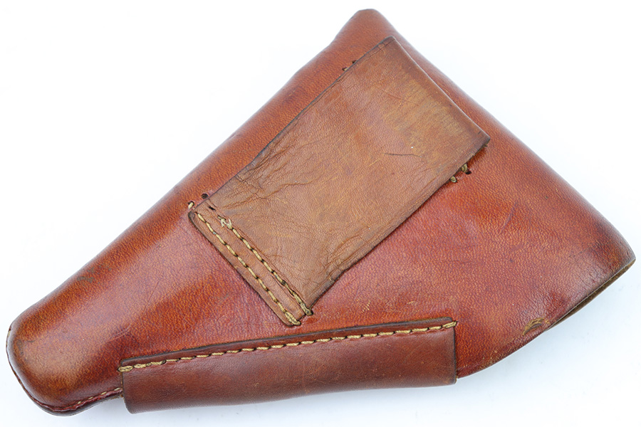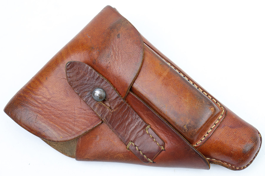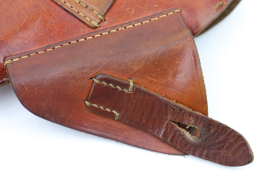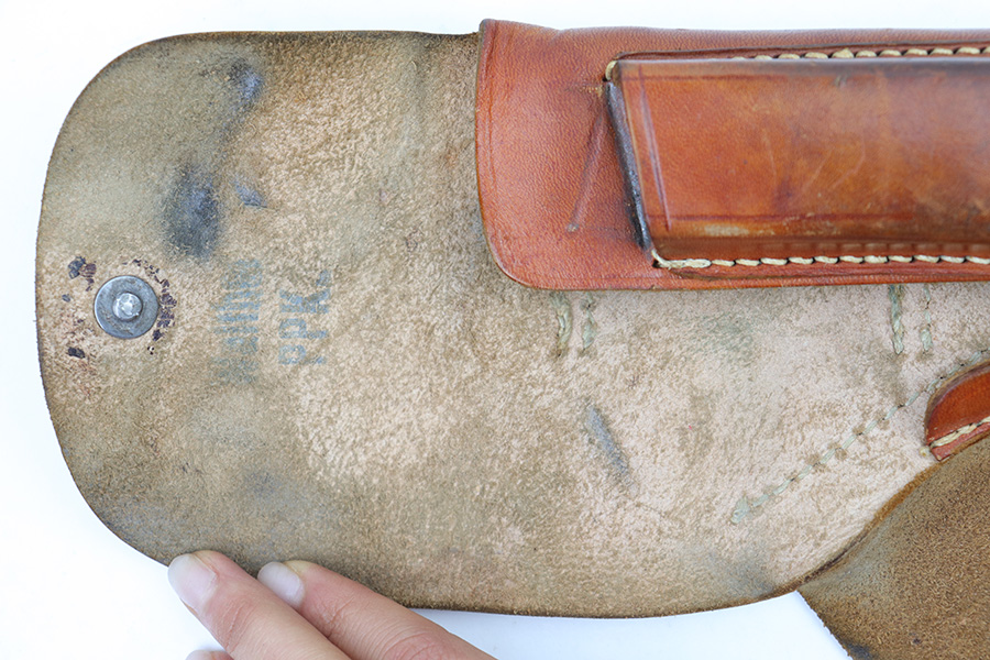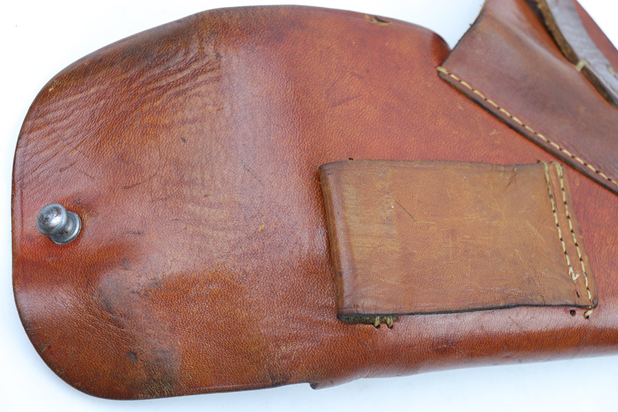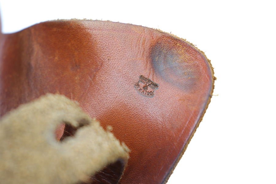 3/13/23 – This is an extremely rare waffen 100 proof stamped Walther PPK holster from WW2. The holster is stamped under the closure strap with a WaA100 military proof stamp. The interior leather still shows the original Walther PPK designation ink stamp as well. The holster has nice brown leather that’s pliable from use and aging without any excessive wear or damage. Zinc closure knob as well. All original stitching is tight and intact, except for one loose stitch on the bottom left corner of the belt loop. Pairs great with a waffen proofed PPK.