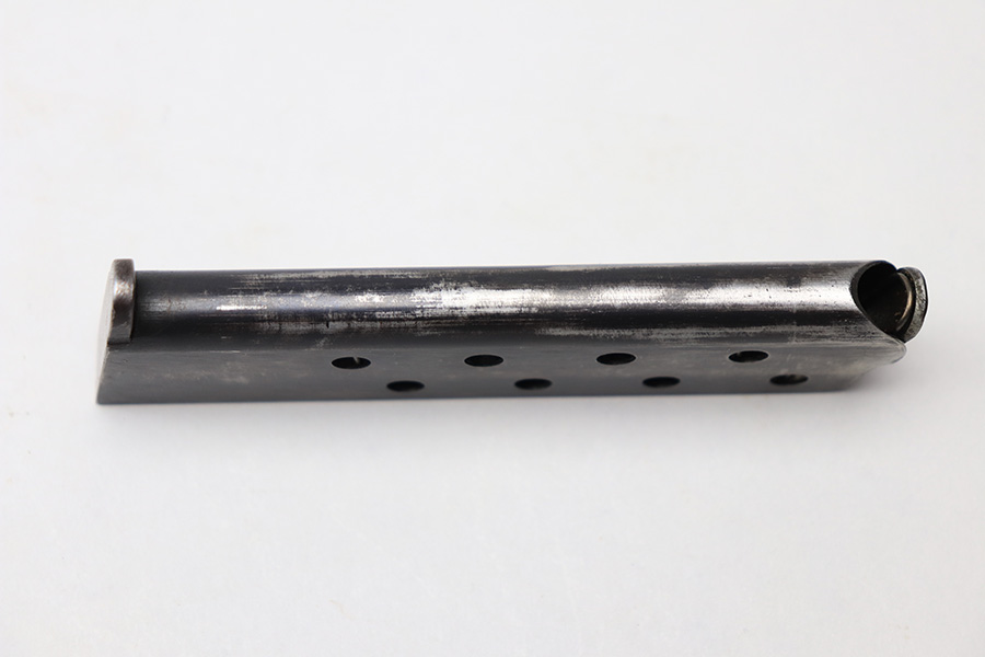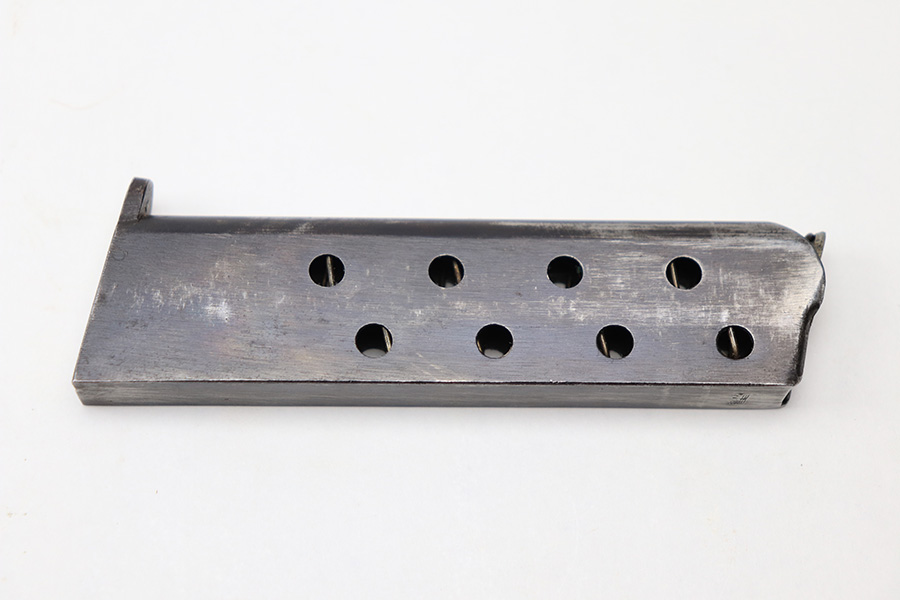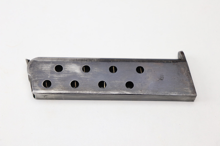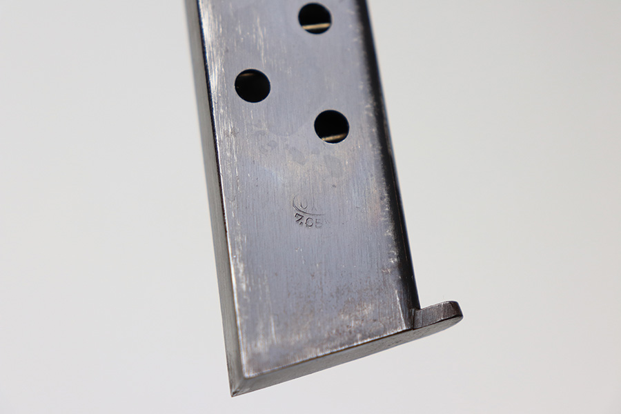 1/7/22 – This is a fairly scarce, early variation FN model 1922 magazine. The magazine is stamped on the spine with a waffen eagle/103 proof stamp. The right side of the tube is stamped with the FN logo and caliber information underneath. The magazine is in great overall condition with some normal finish loss but no rust or pitting. Fully functional spring.