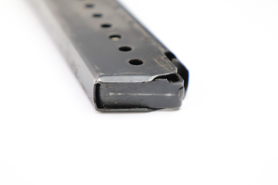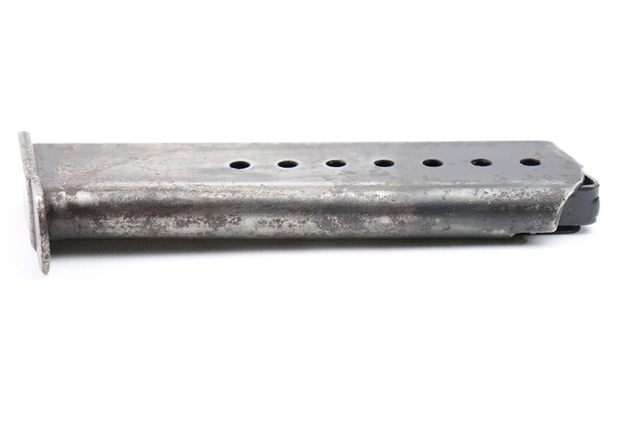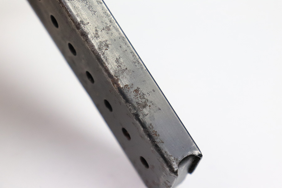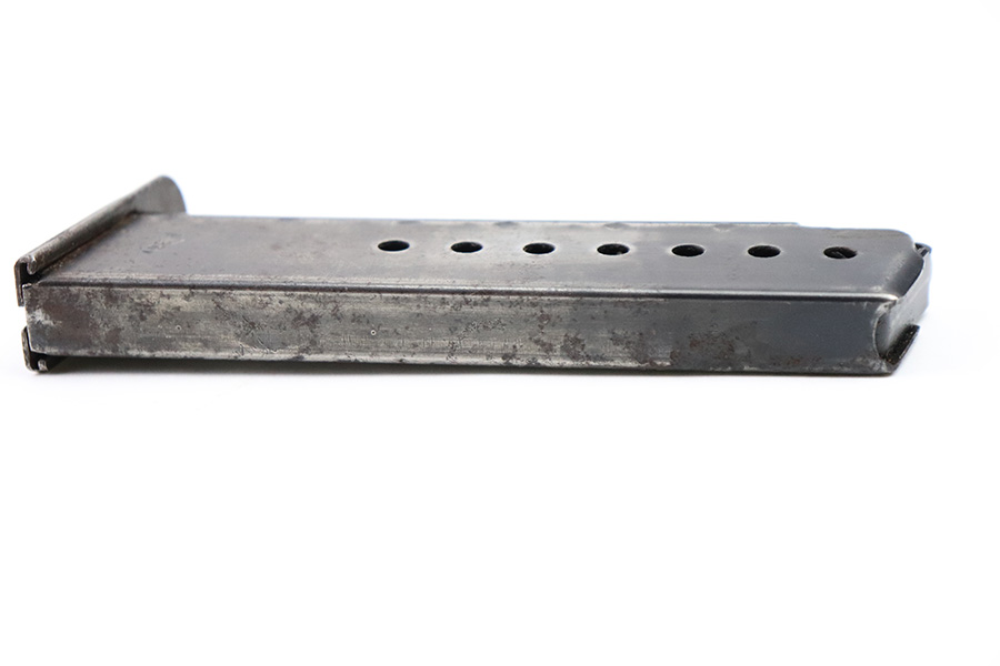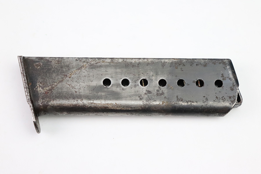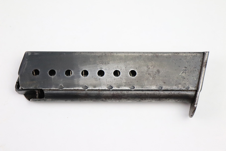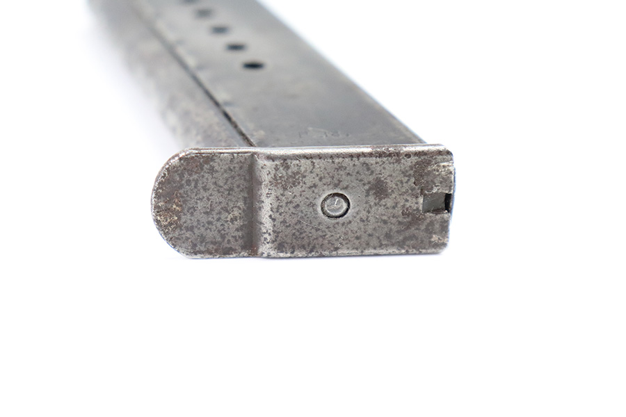 12/22/22 – This is an original WW2 Mauser P.38 magazine. Best for 1943 and 1944 production Mauser P.38s, this magazine is stamped P.38v on the side and WaA135 on the spine. There’s surface patina and finish loss throughout the magazine as well as a few spots of pitting and mild rust. The spring is still strong and fully functional.