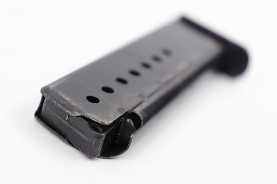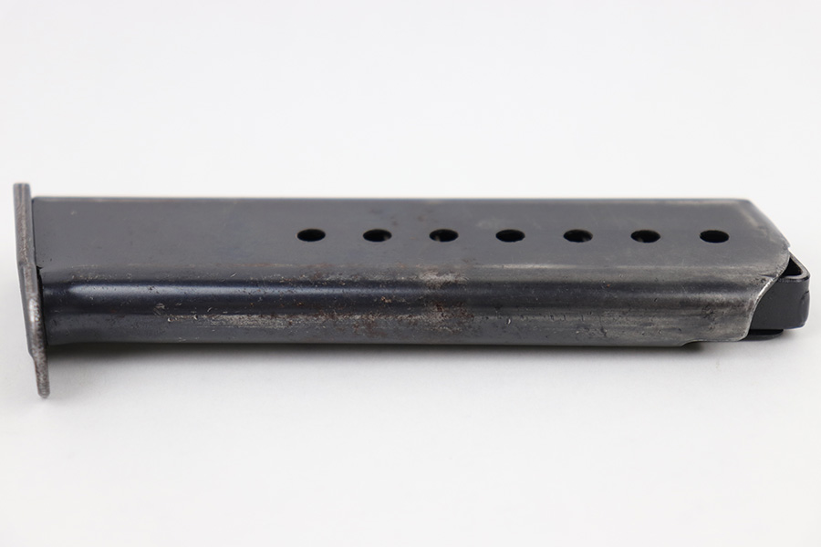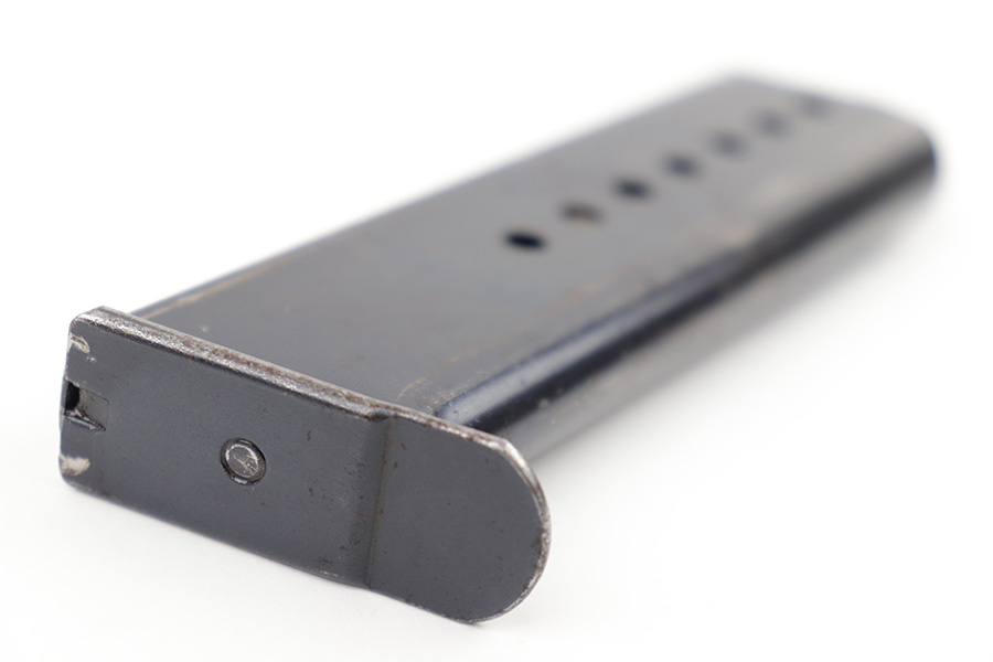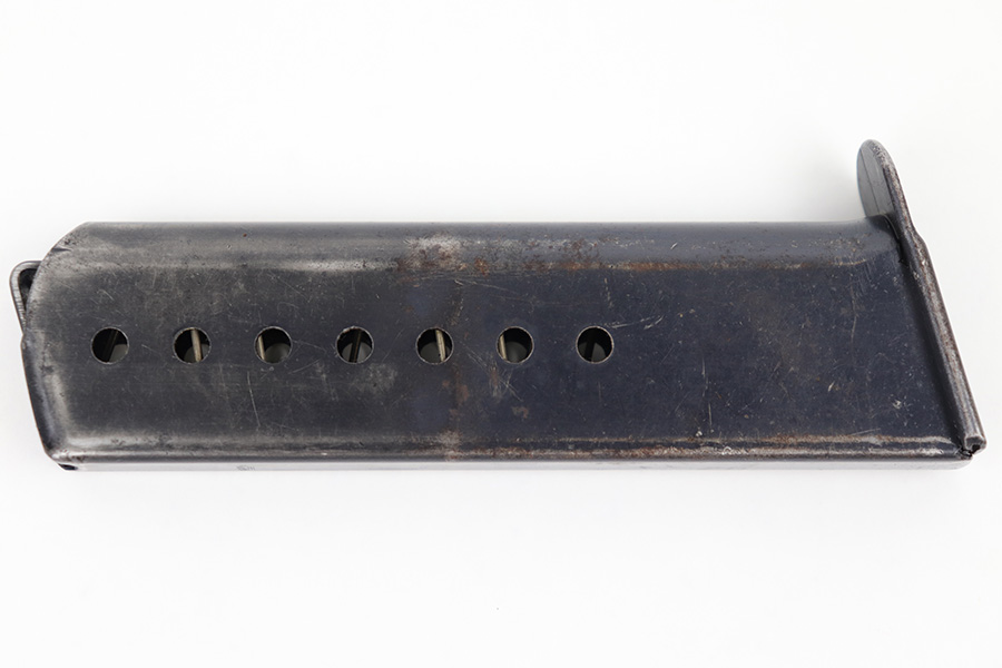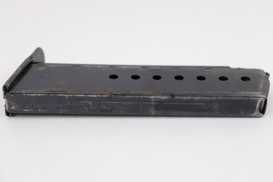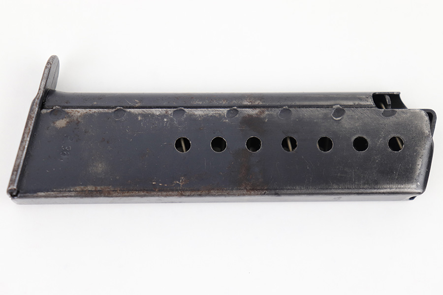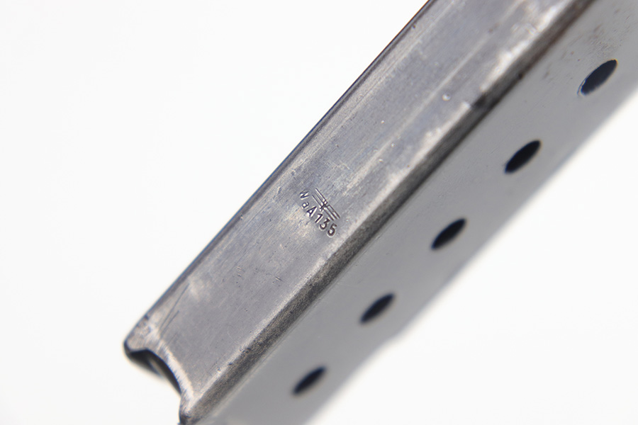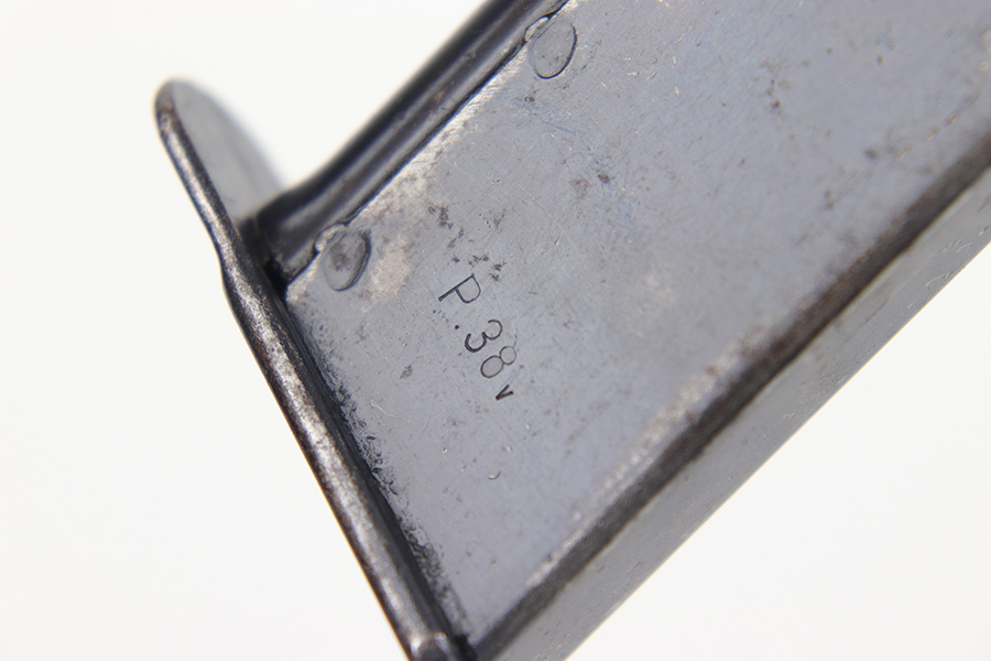 4/14/23 – This is a later wartime production Mauser P.38 magazine from WW2. The magazine is stamped P.38v on the left side, and is proof stamped with a waffen WaA135 military proof on the spine. The blued finish is in great overall condition with some dark surface patina and areas of finish loss, mostly around the edges of the tube. Strong, functional spring.